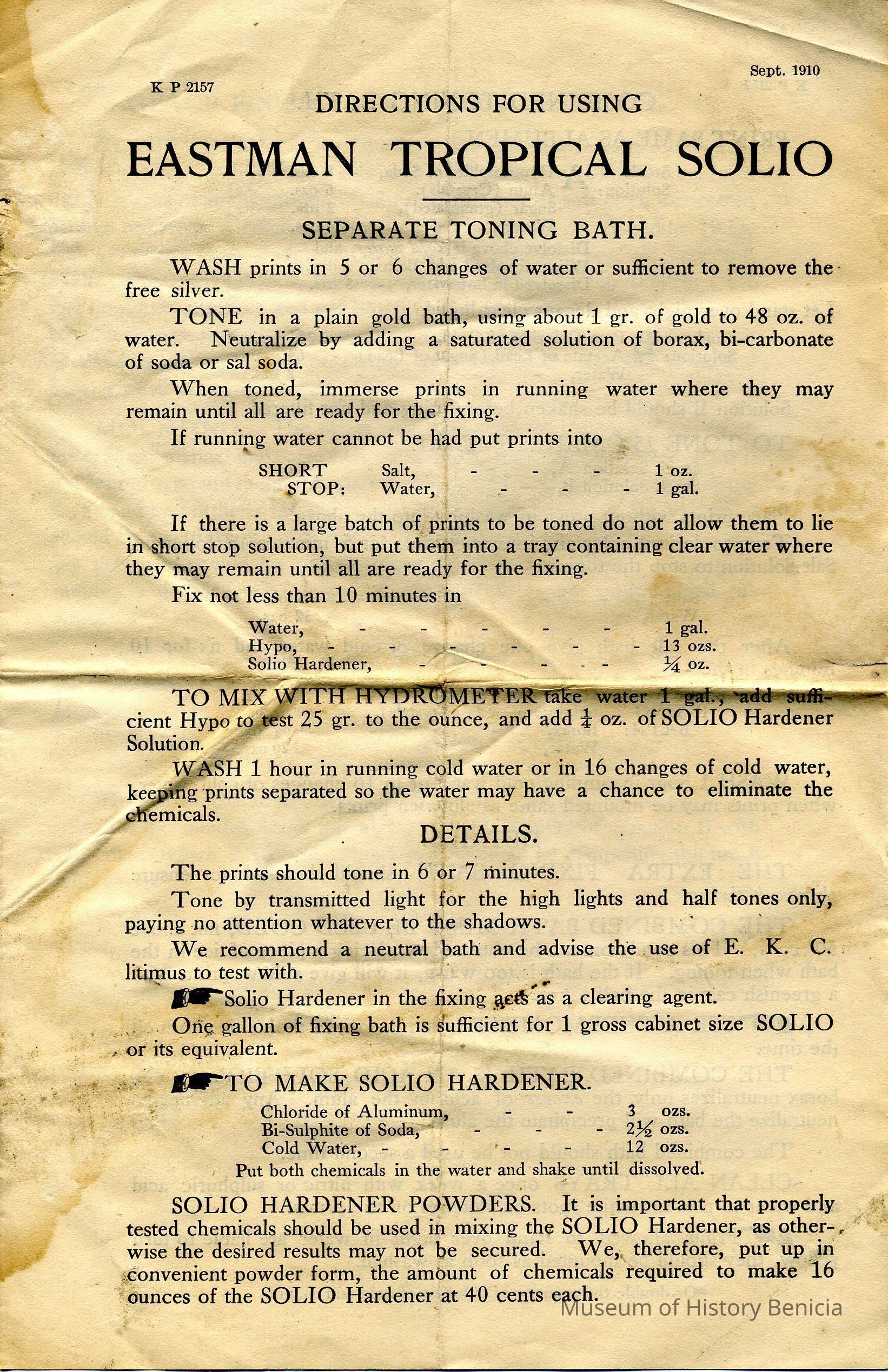 "Directions for Using Eastman Tropical Solio" by the Eastman Kodak Company - dated Sept. 1910.