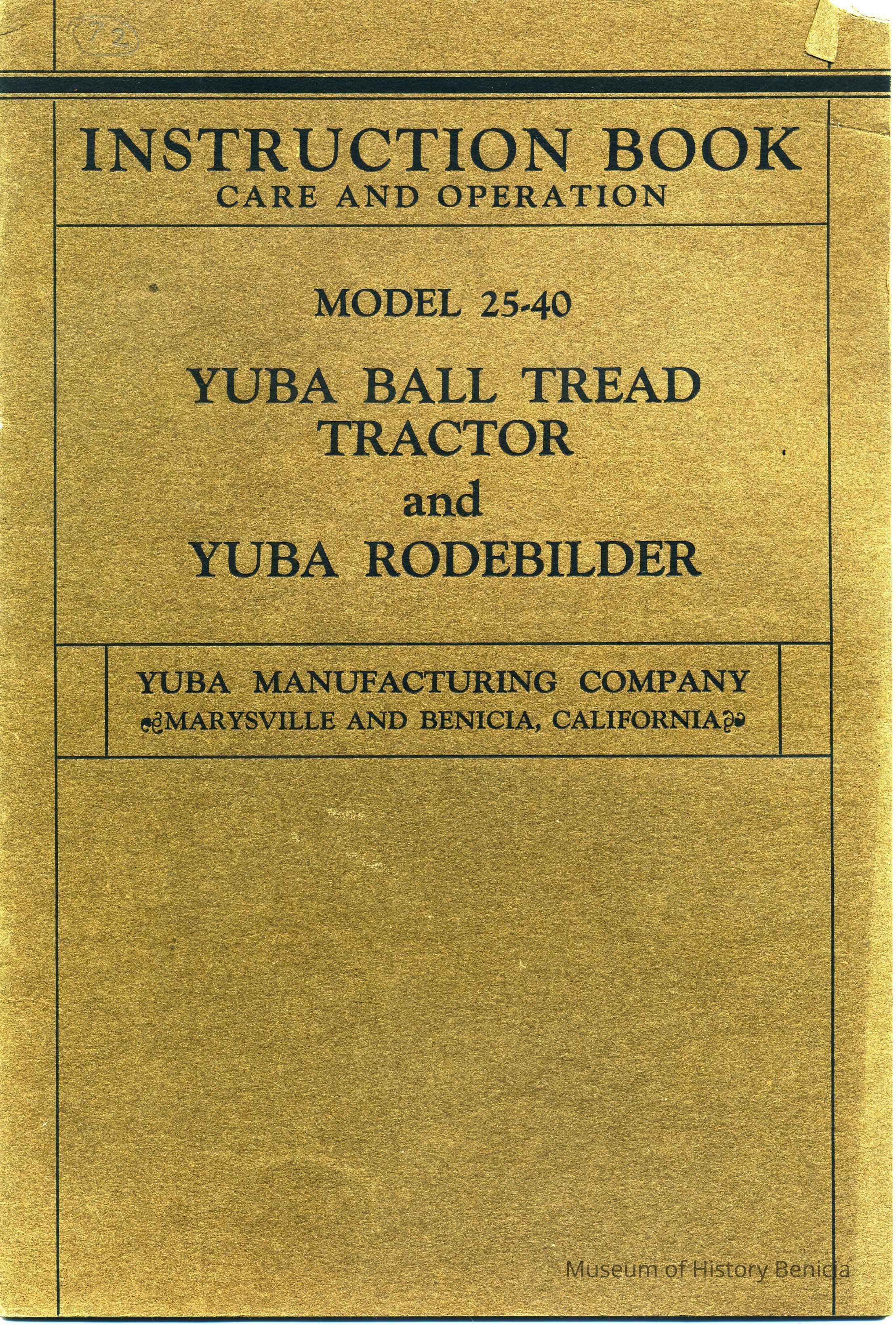 Instruction book for Yuba Ball Tread Tractor and Yuba Roadside. Marysville and Benicia. 15 pages and covers