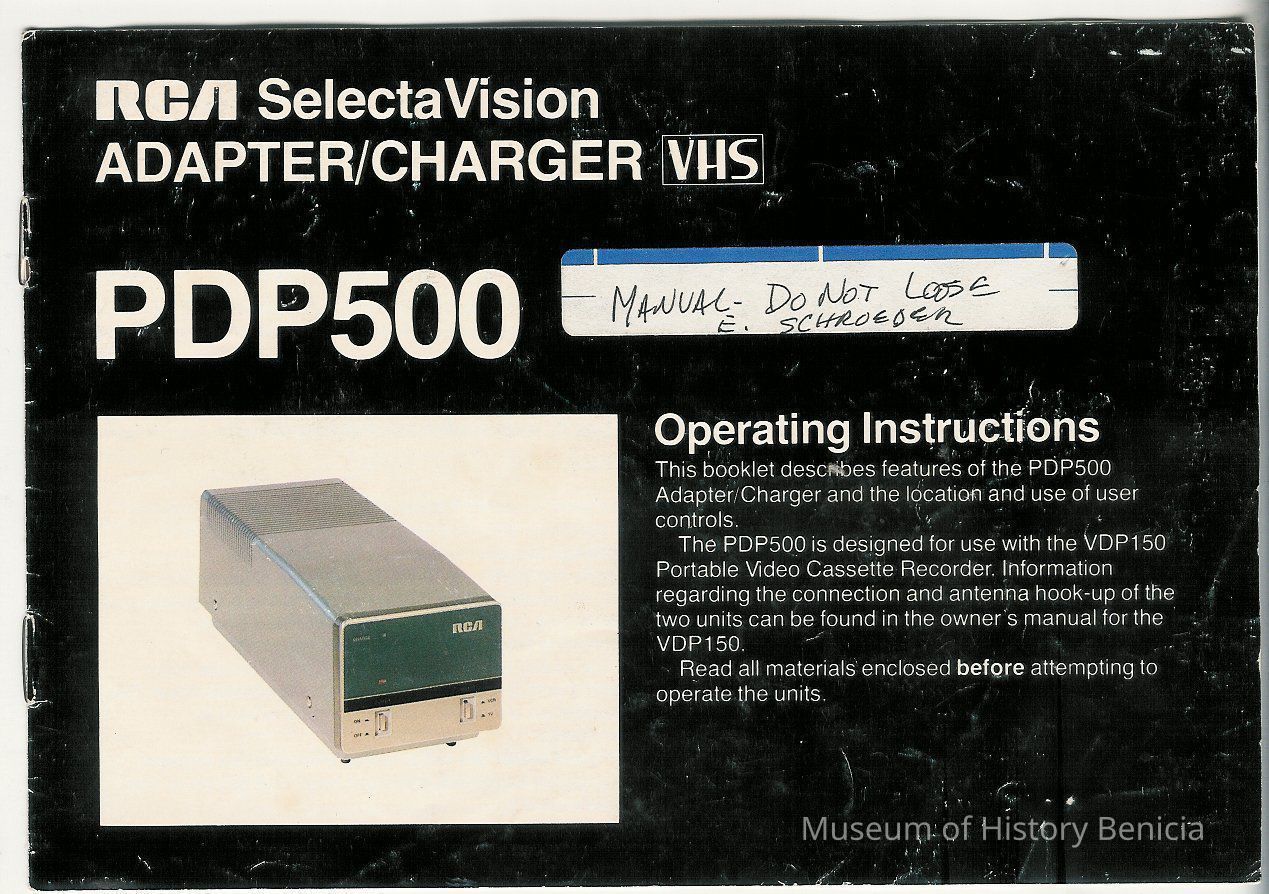 Operating manual for adapter/charger used with video cassette recorder "Selecta Vision" VHS portable recorder. Ser No 0175H0256. Unit works on 12 volt DC with battery, 12 volt auto battery, or 110 volts AC with adapter. Has adapter, extra batteries, manual, and case.Collection