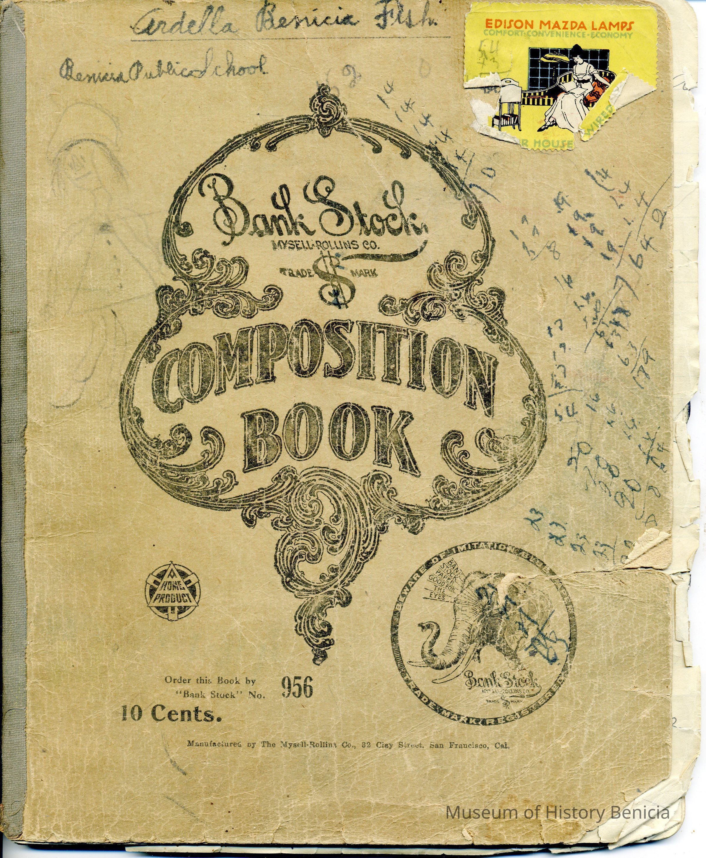 Composition book used by Ardella Fish while at school in Benicia. There is no date on the book but the work looks to be about 4th or 5th grade level. It covers several subject areas.Collection