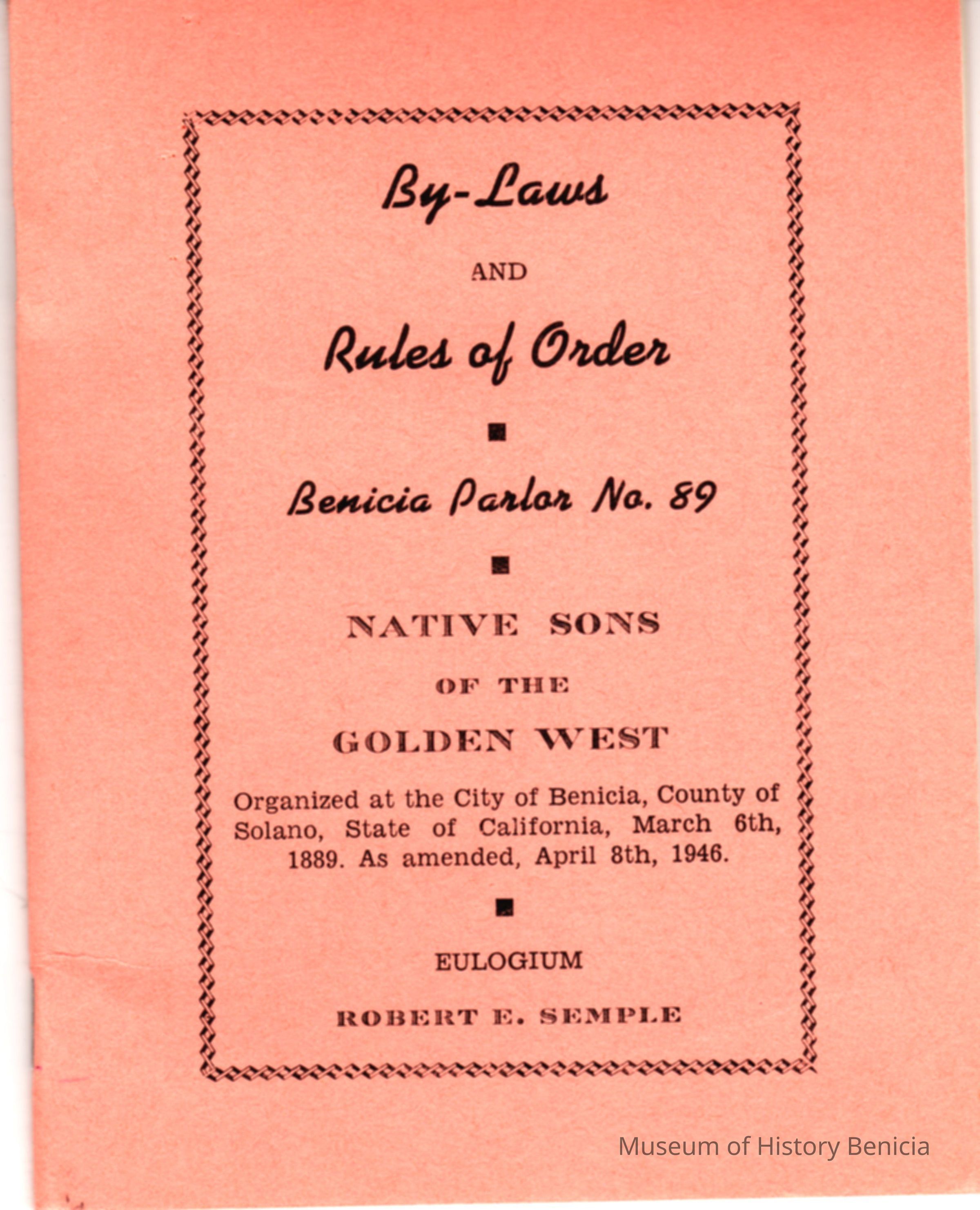 Booklett on bylaws and rules of order of the Native Sons of the Golden West Benicia Parlor No 89 datyed 1946