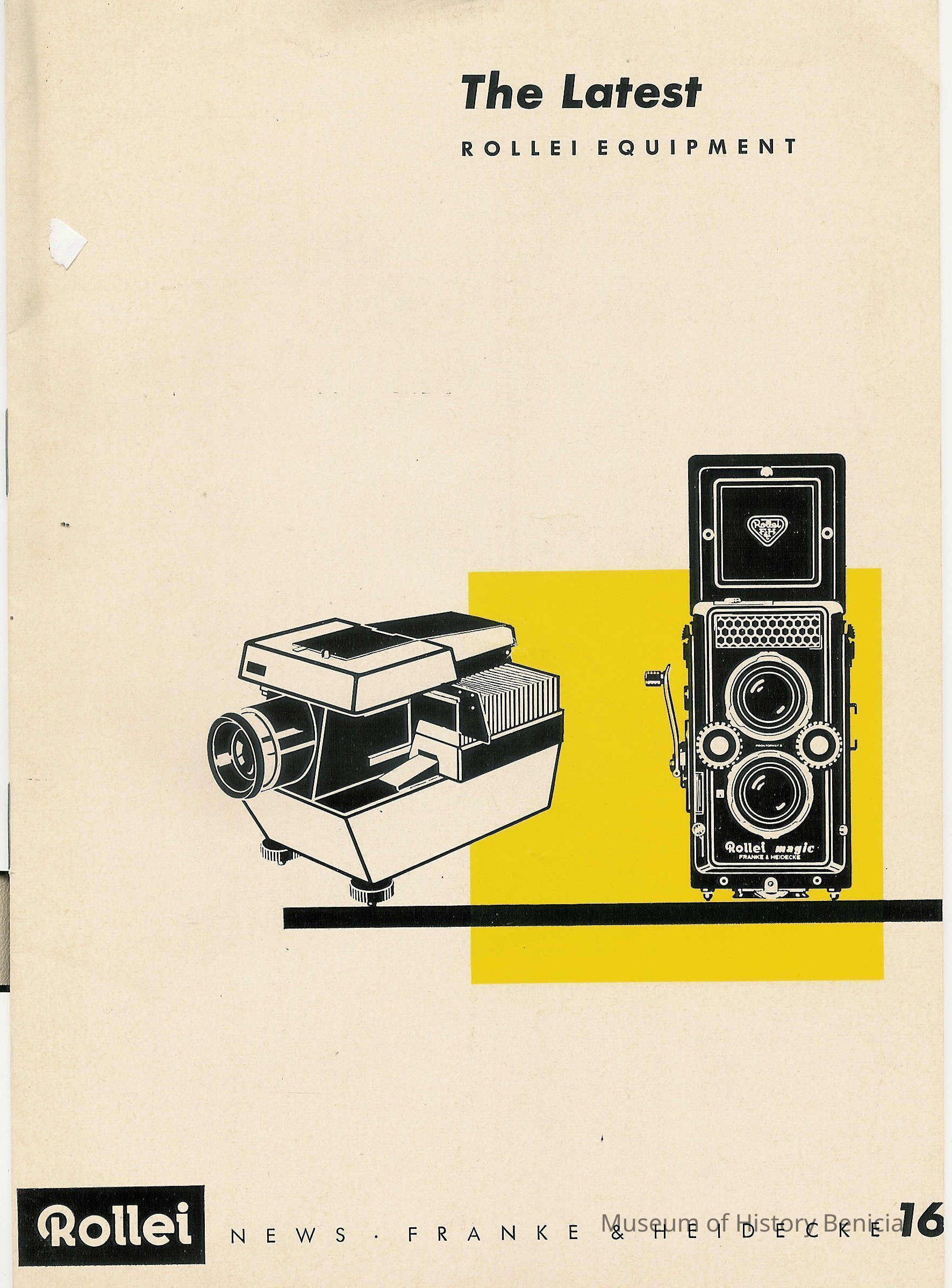 Booklett called "The Latest Rollei Equipment". 8 pages both sides. Contains information about Rollei photo equipment. Came from Corbin Photo Supply 717 Marin St Valejo Ca.Collection