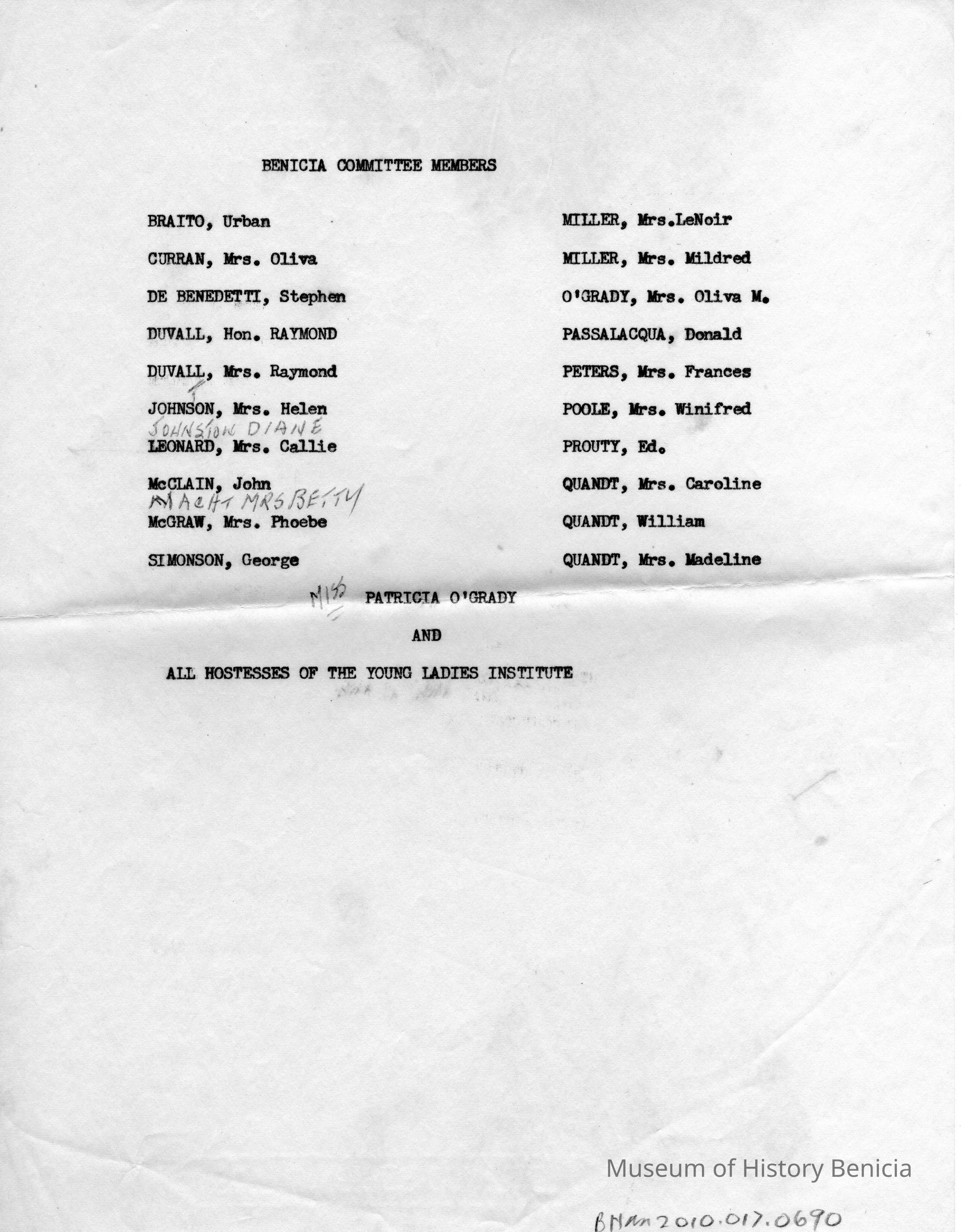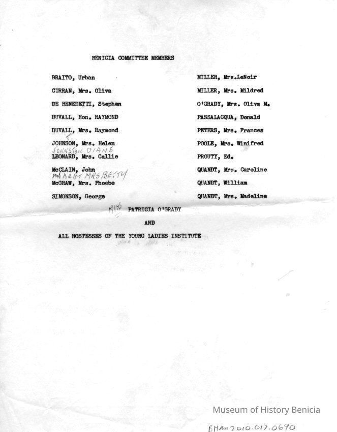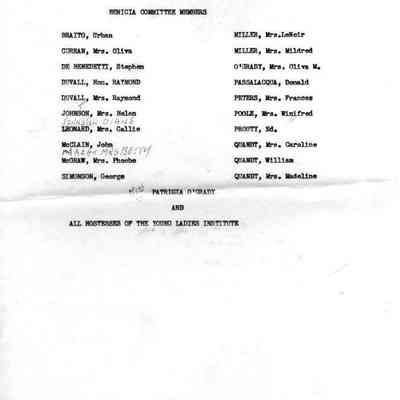 List of members for committee for dedication of historical marker for Young Ladies Institute.
