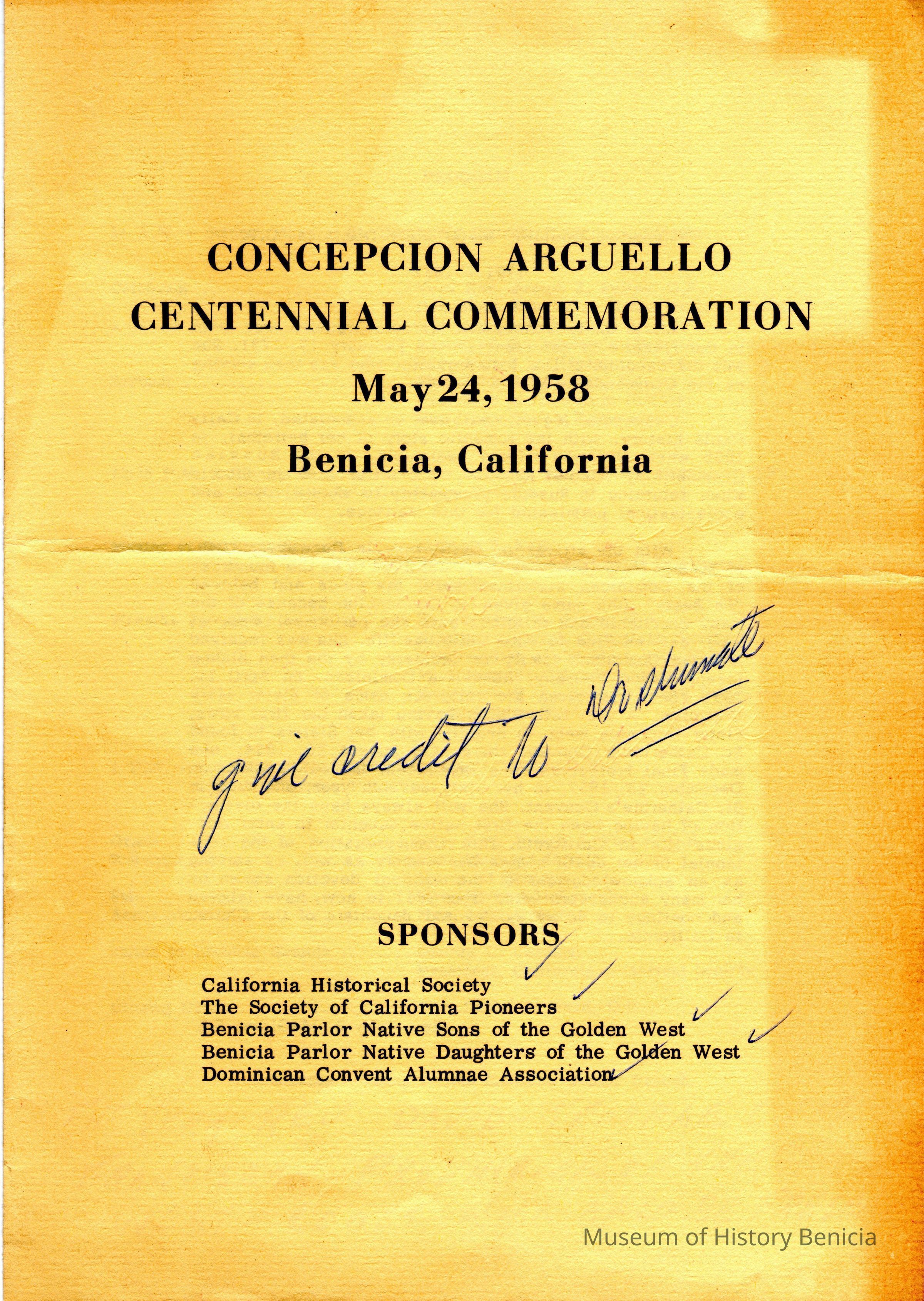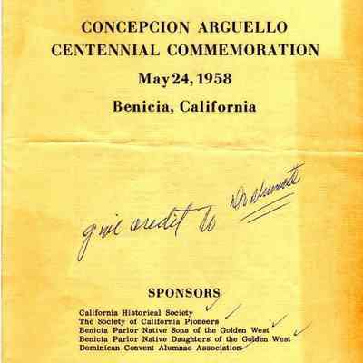 Booklett on Concepcion Arguello Centenial Commemoration 05/24/1958. One copy was used by Jack O'Grady to make his speech (see handwritten notes to himself) and one copy is a clean copy.Collection