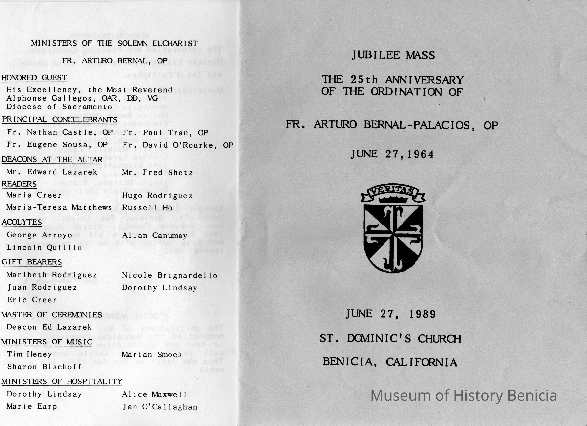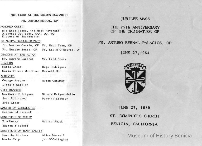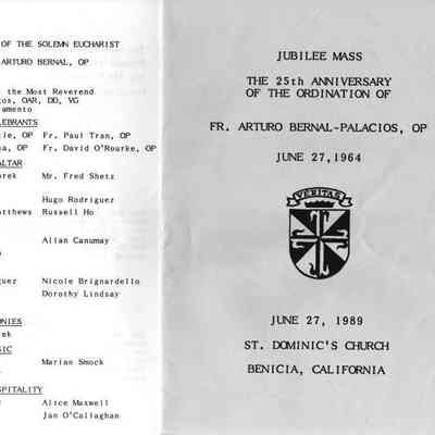 Pamphlet on St Dominic's 25th Anniversary Jubilee Mass for the ordination of Father Arturo Bernal-Palacios, OP. On 06/27/1989