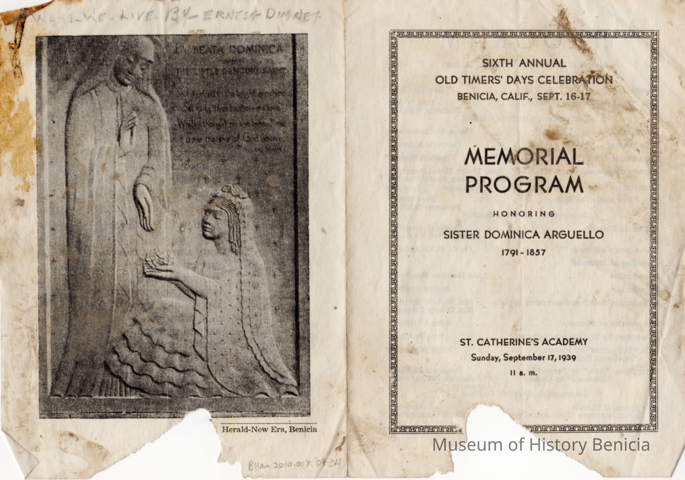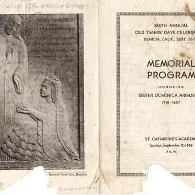 Booklet on Old Timers Days from 1939. It is the 6th annual Old Timer's Festival and is honoring Sister Dominica Arguello (1791-1857).