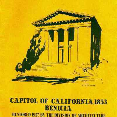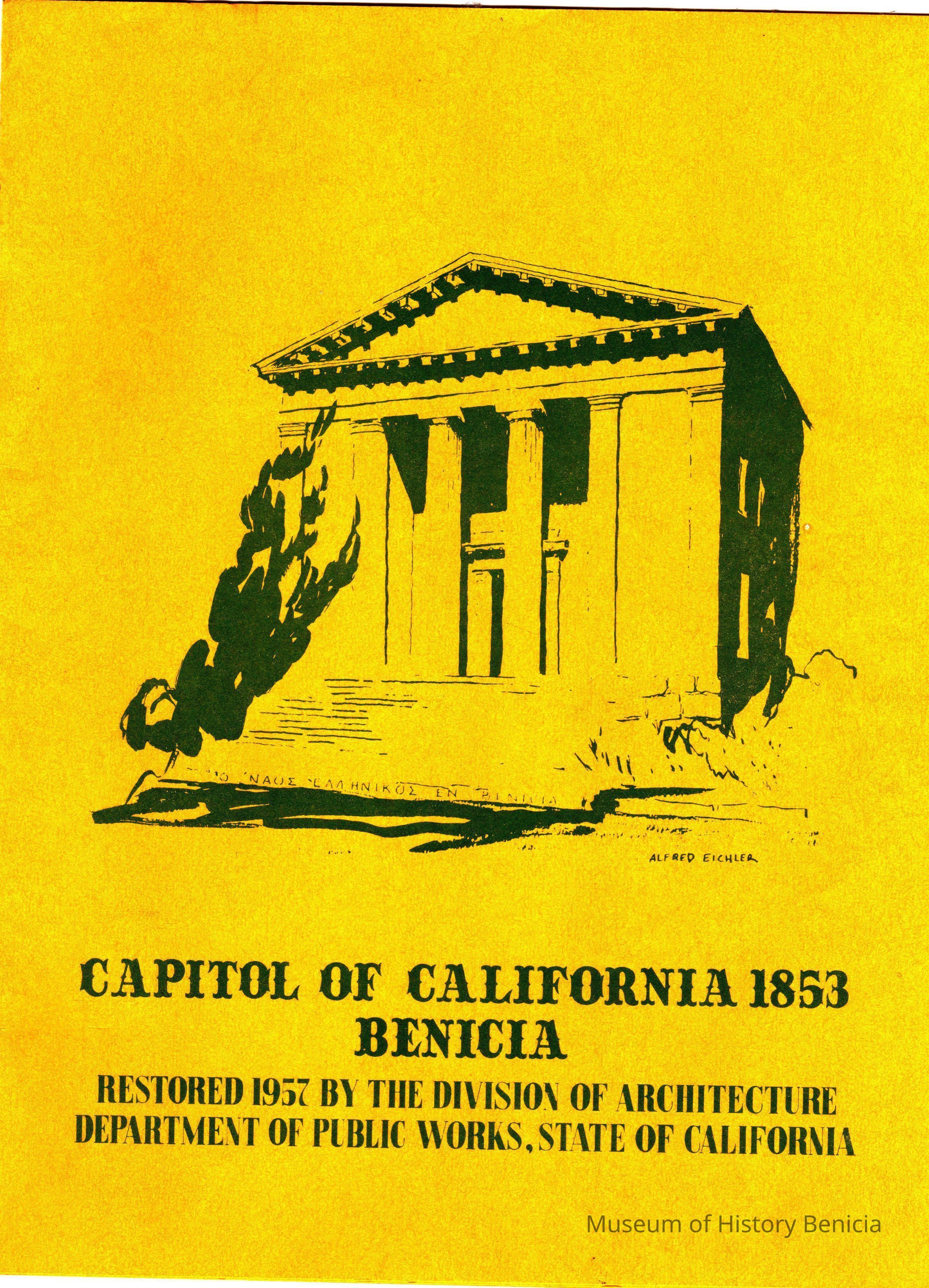 Booklett on Restored Benicia Capitol. Title is "Capitol of California 1853 Benicia". Sub-title says "Restored 1957 by the division of architecture Department of Public Works, State of California".Collection