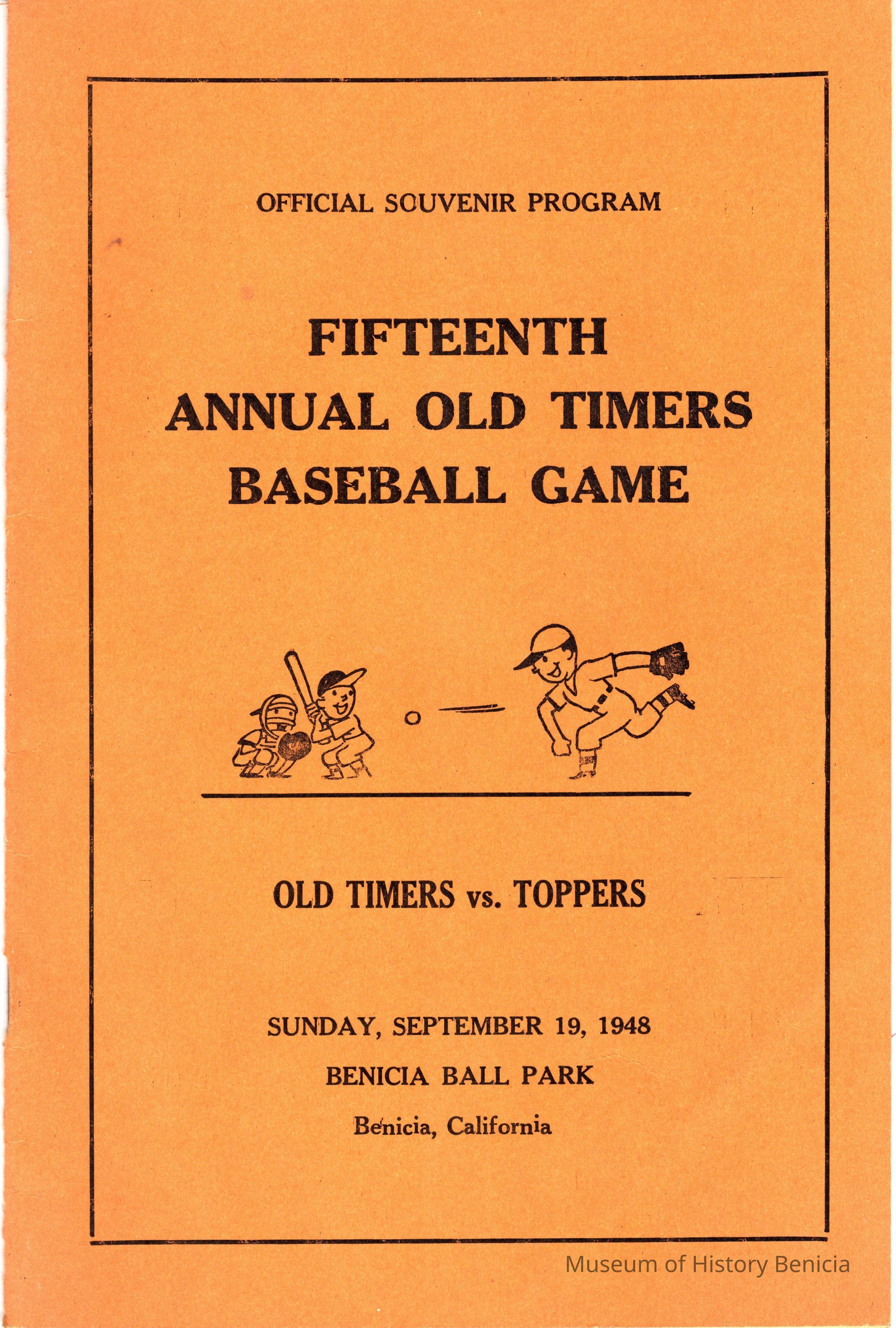 Booklett on 15th Annual Old Timers Baseball Game. The Old-Timers vs the Toppers. Official Souvenir Program 09/19/1948.