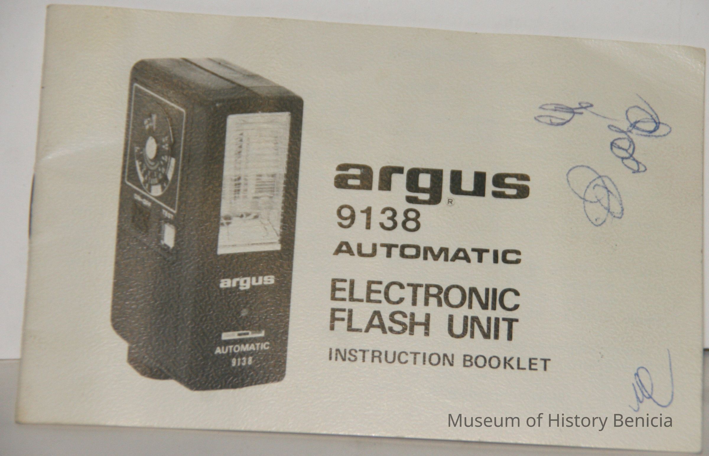 Argus 9138 automatic Electronic flash unit instruction booklet. On the front cover-- picture of flash unit in black and white. Also on front is pen scribbles.