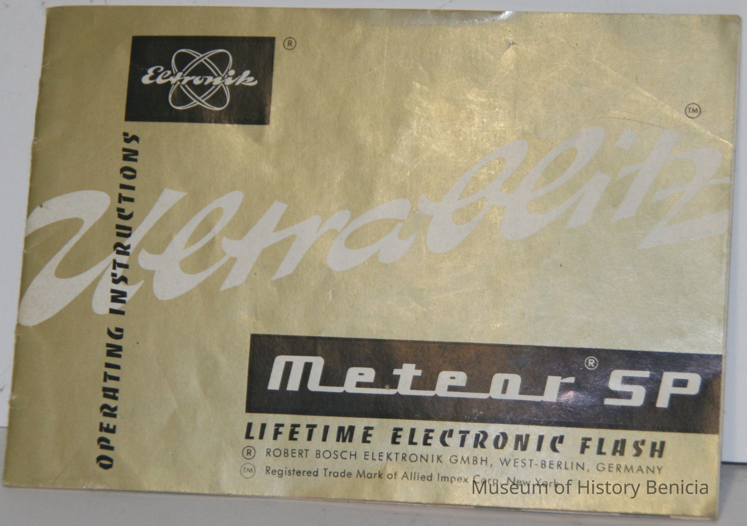 Ultrablitz meteor SP lifetime electronic flash. Operating instructions. The cover is gold, white and black.