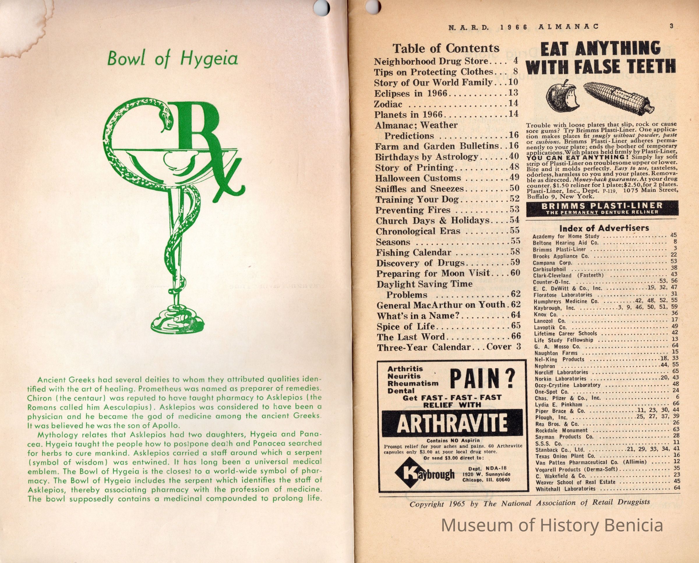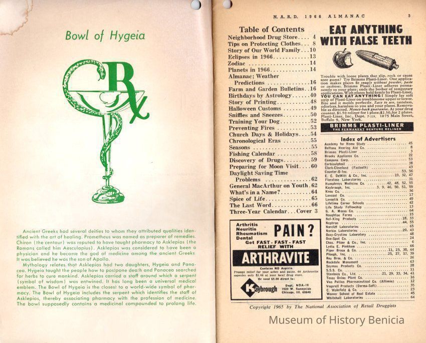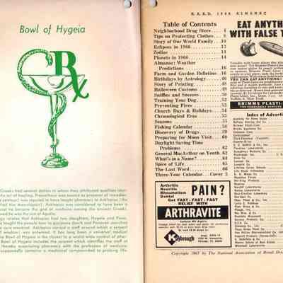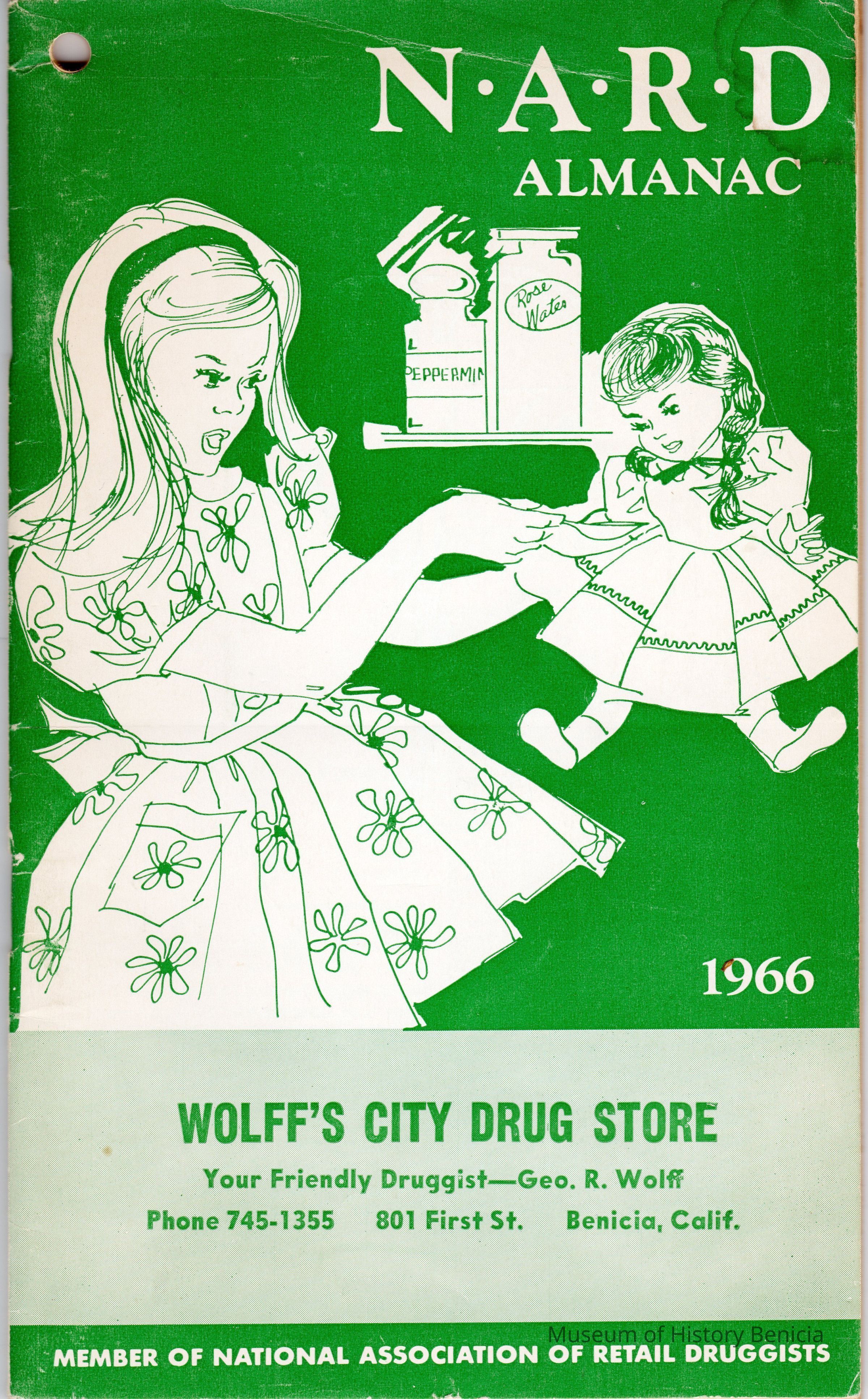 Booklet called N.A.R.D. Almanac. The initials stand for National Association of Retail Druggists. It is for the year 1966 and distributed by Wolff's Drug Store. See table of contents and advertiser list in second scanned image.Collection