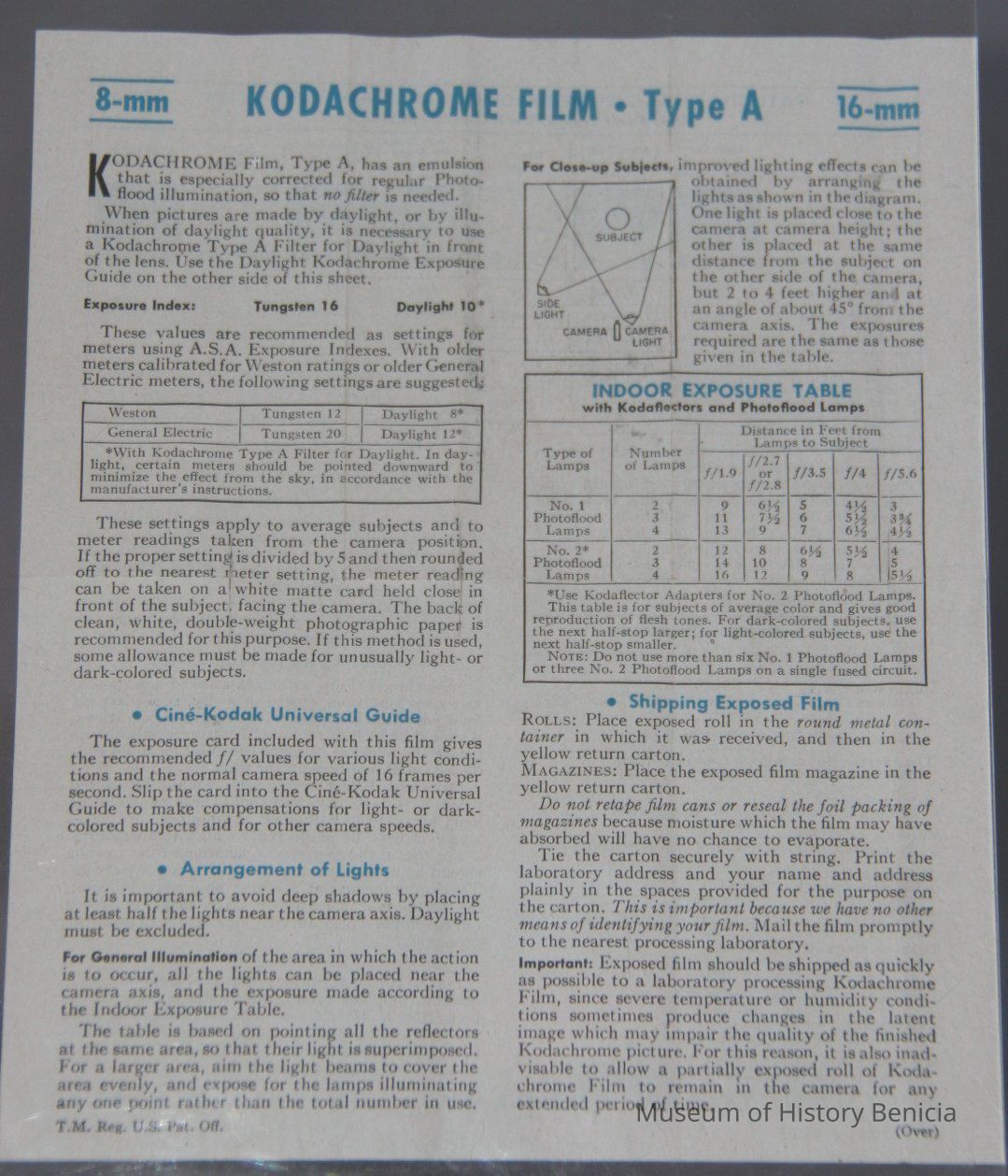 Film insert for Kodachrome type A safety color 16mm film for artificial light. Made in U.S.A. by Eastman Kodak Co. Film held in a yellow foil paper with "Kodak" on it.Collection