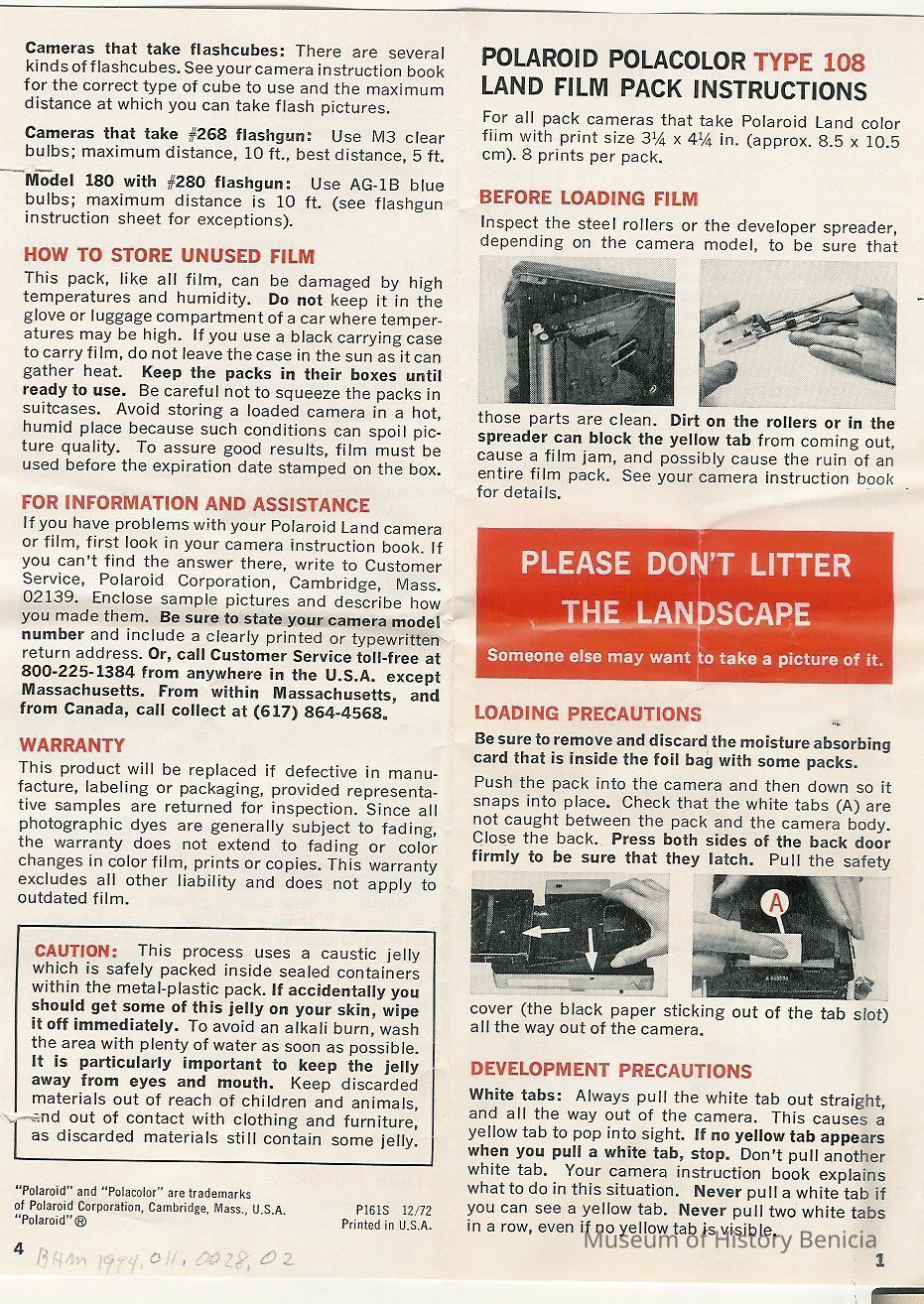Instruction for Polaroid Type 108 "Polacolor" film used with Polaroid 210 camera.
