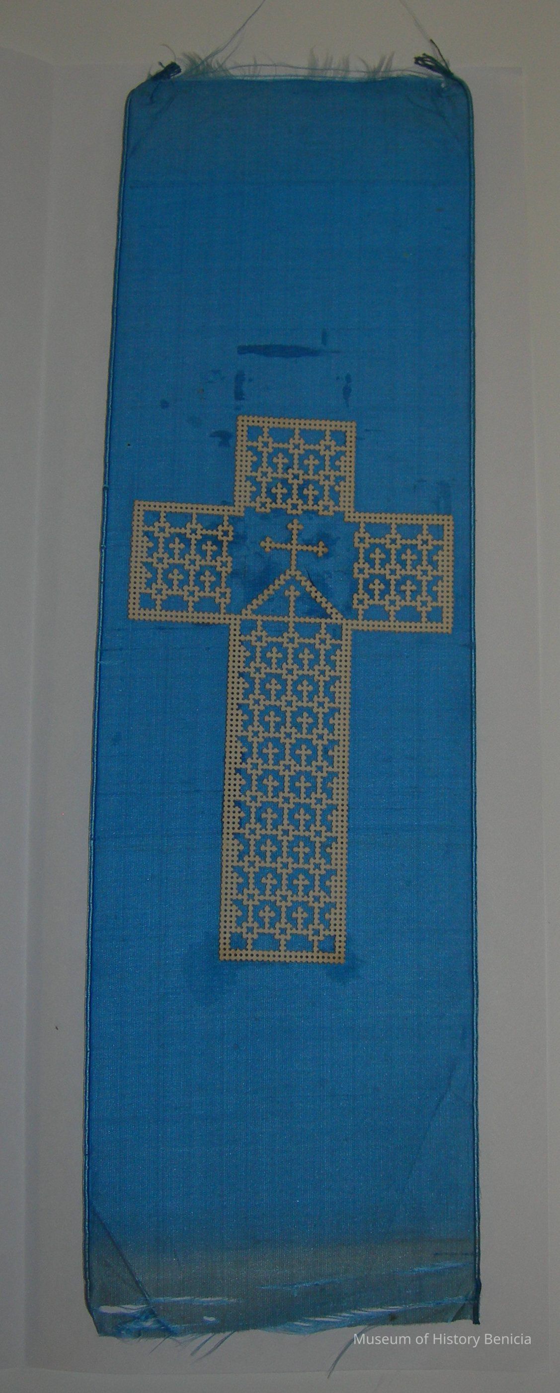 Bookmark made of silky blue fabric with a white cross punched out of paper.