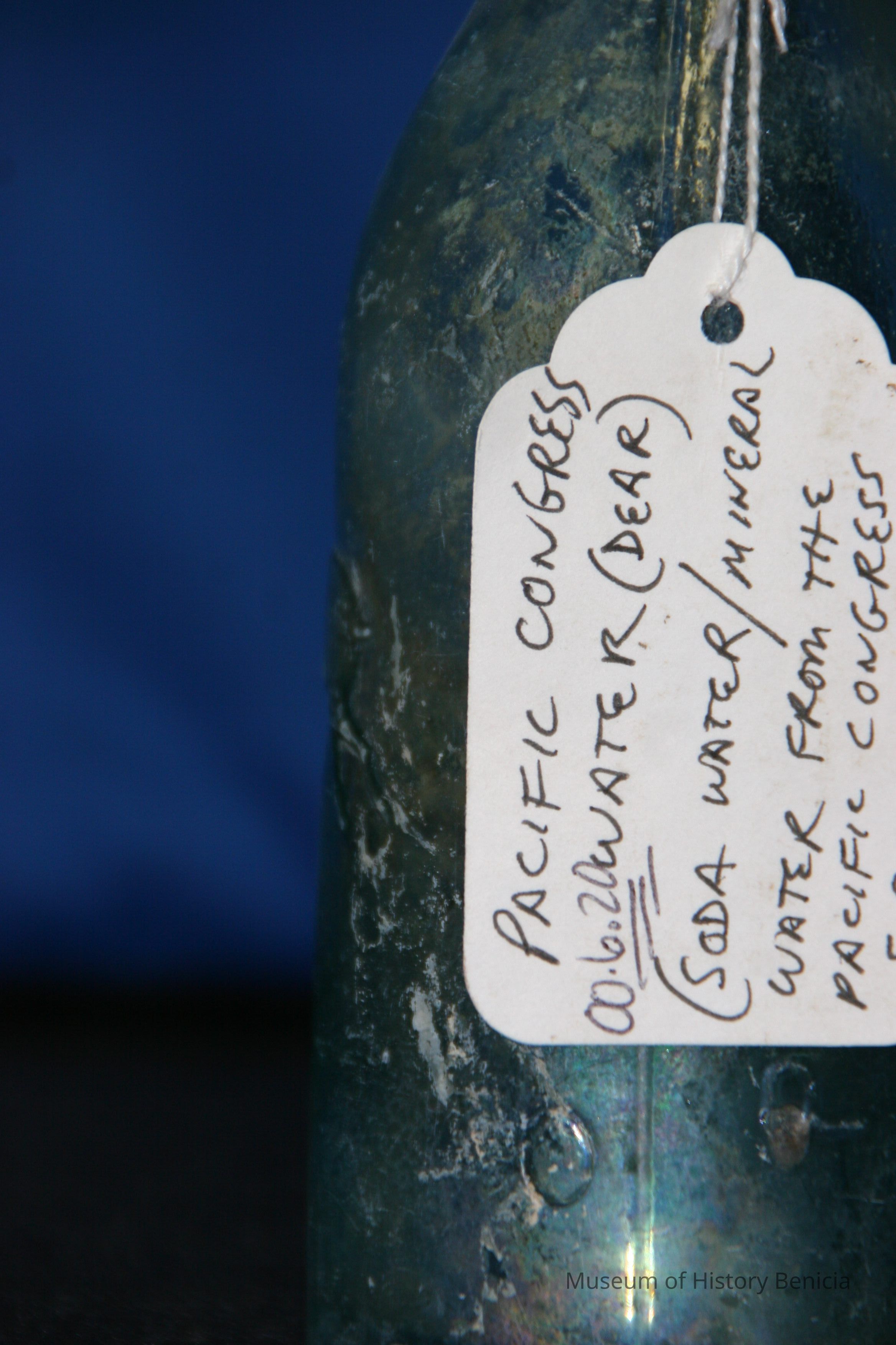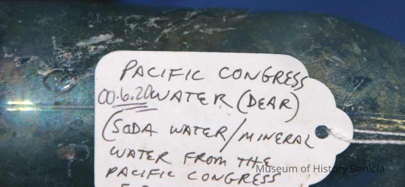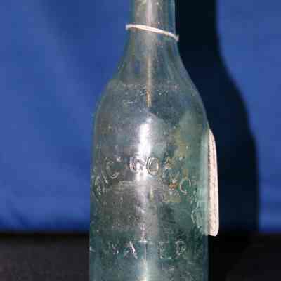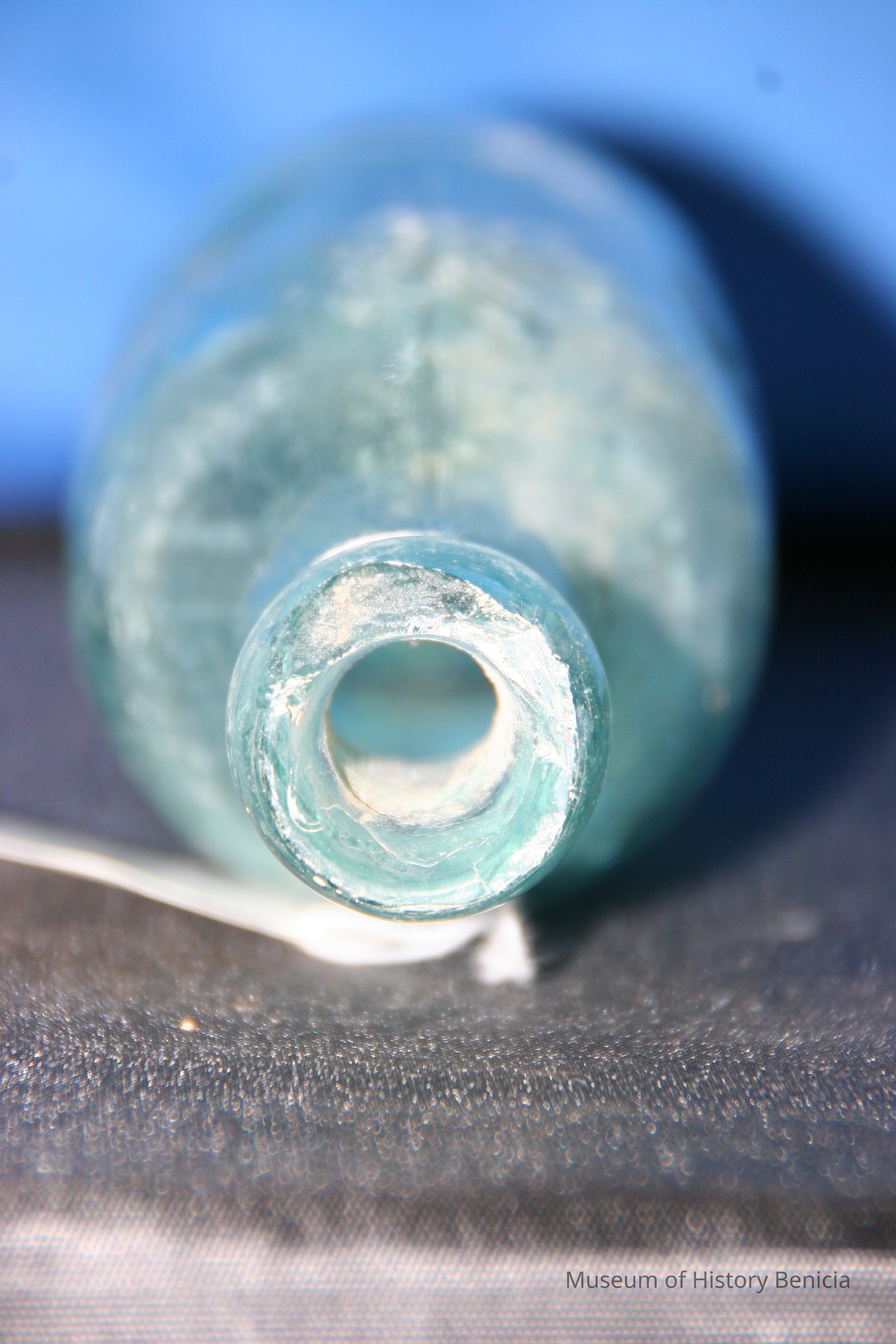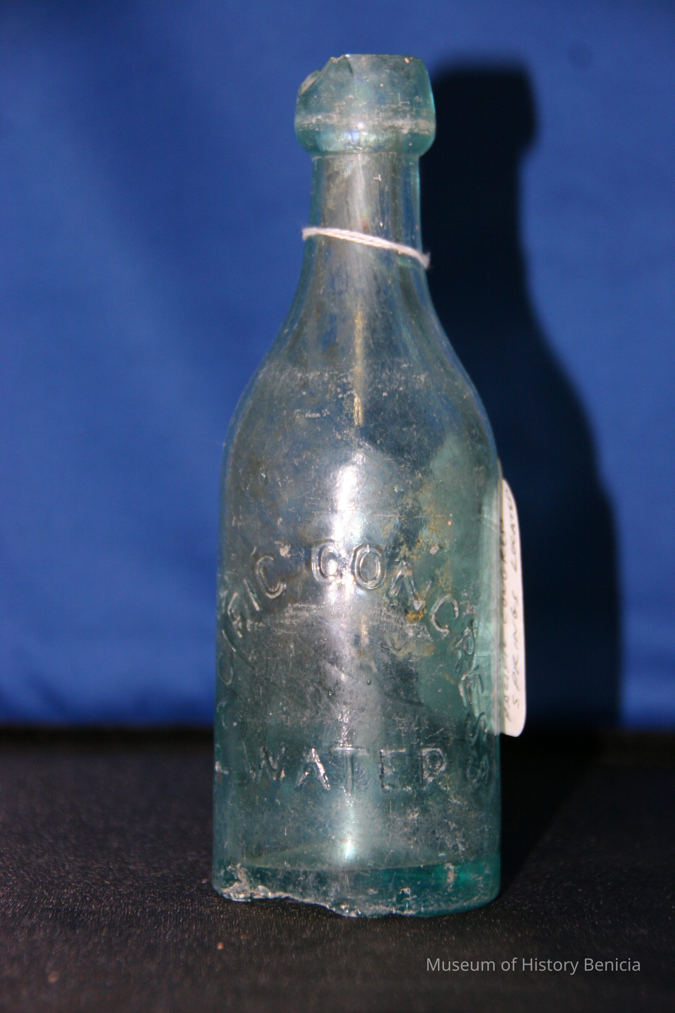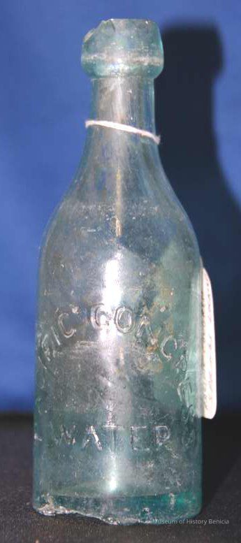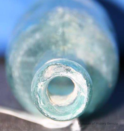 Glass water bottle found at Benicia Barracks site; found near current site of the National Guard Armory on Hillcrest Avenue in Benicia.