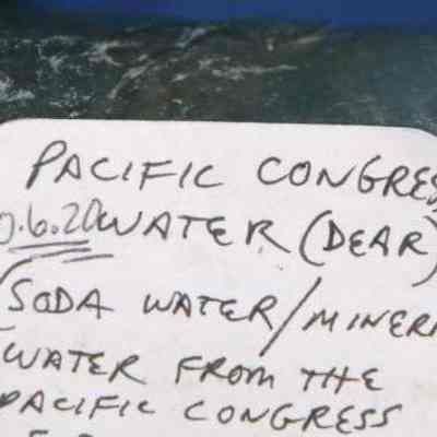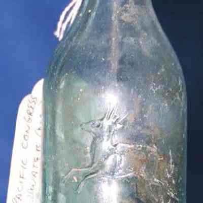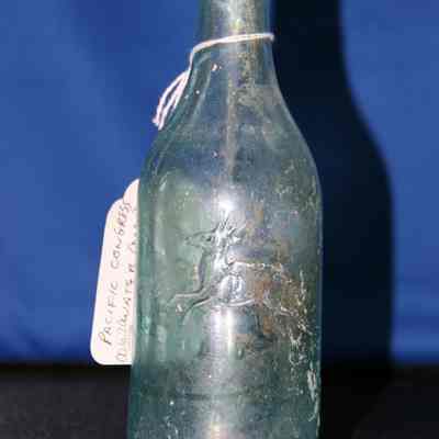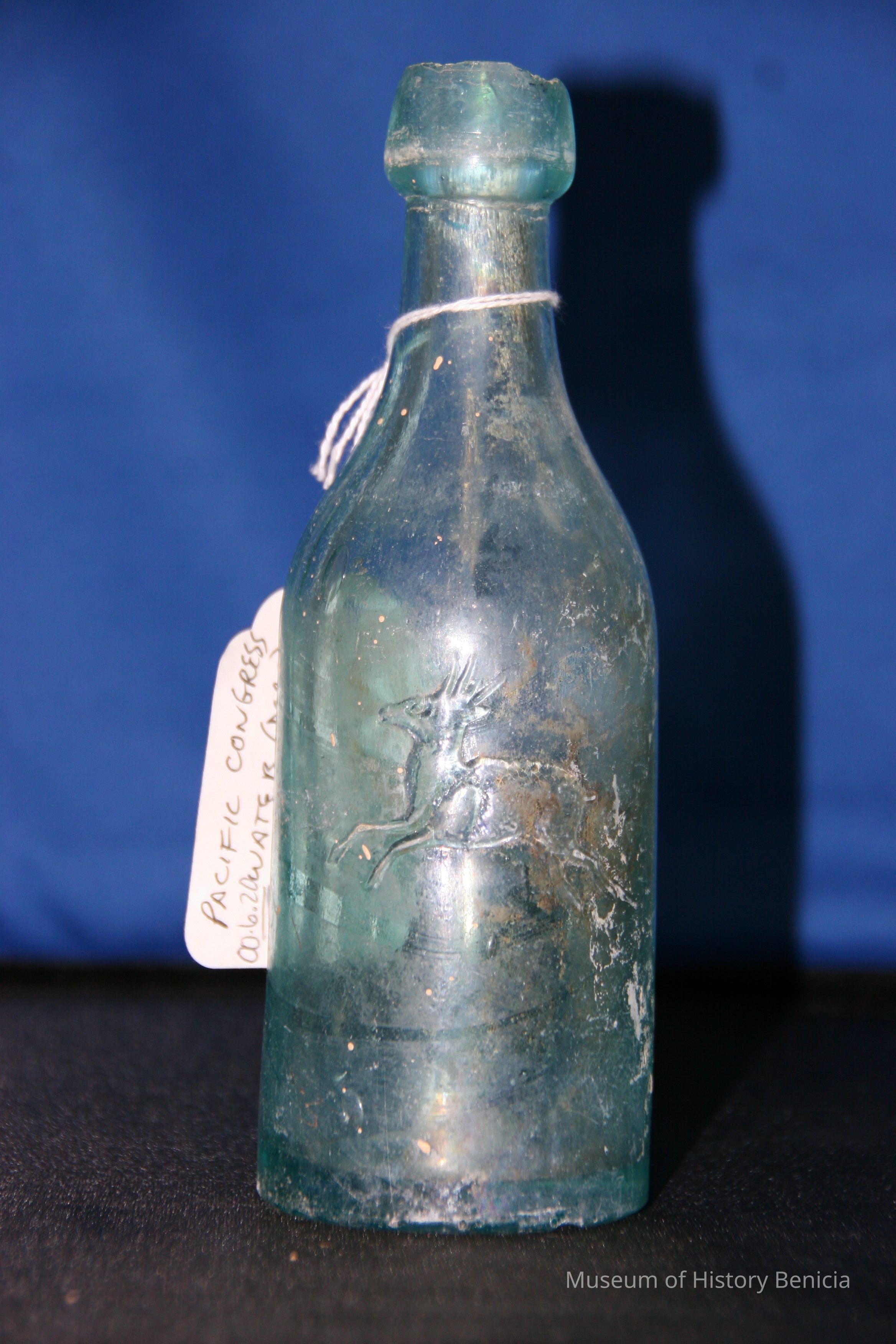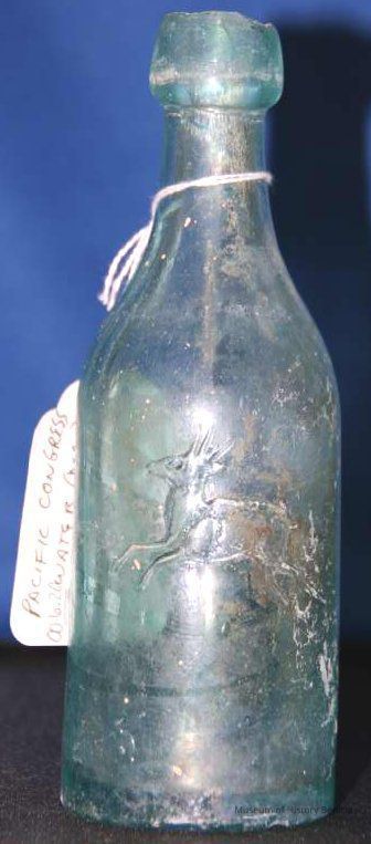 Pacific Congress Water - deer animal insignia soda water/mineral water from the Pacific Congress Springs locted in the hills near Saratoga California, named after the famed Saratoga, NY Springs, aqua in color, partial notches on rim, also chunk from bottom removed.Collection