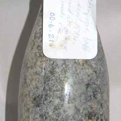 green glass, heavily coated with dirt. inverted bottom, chipped lip.Collection