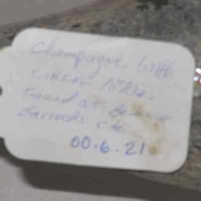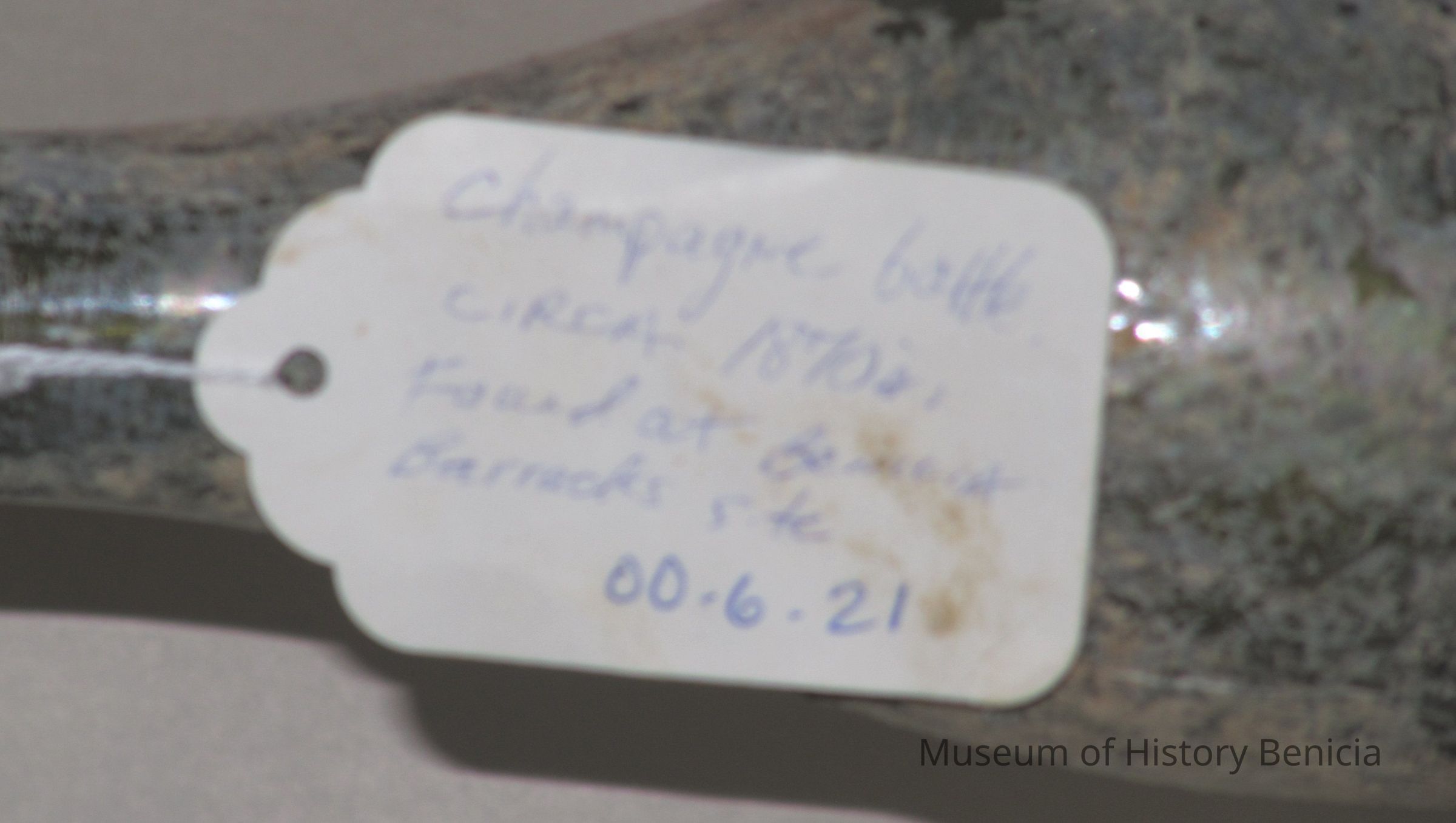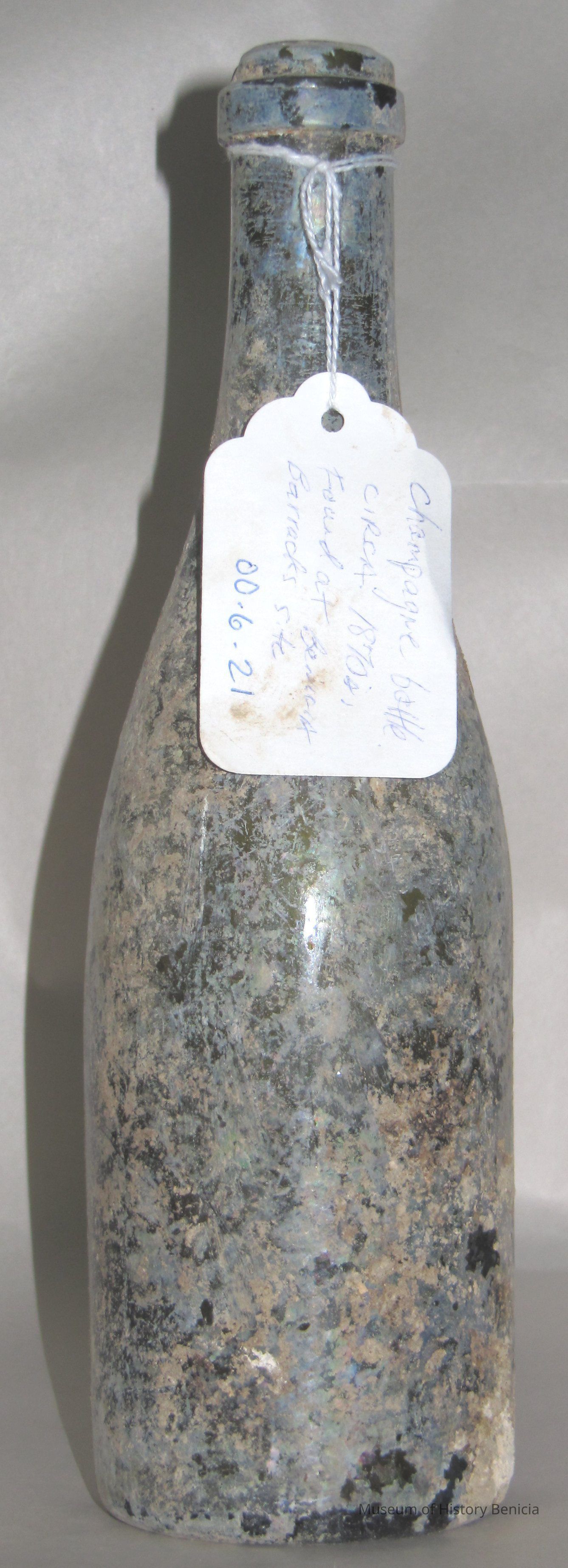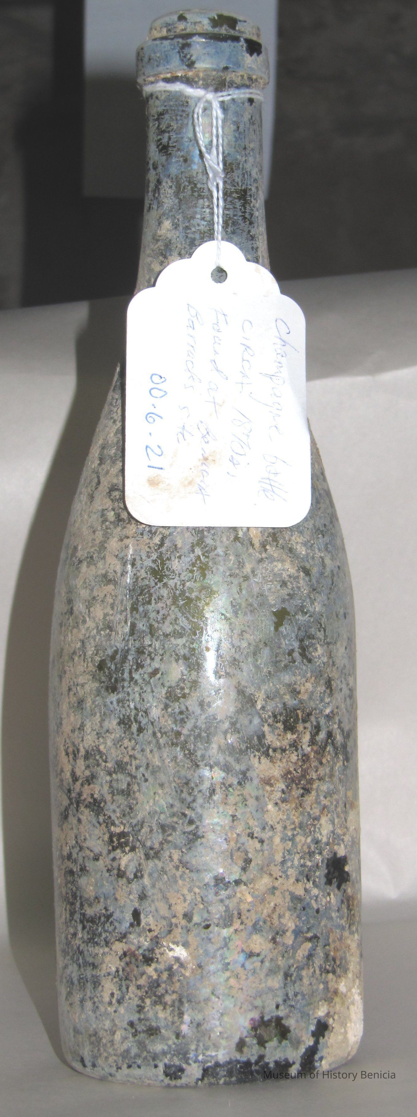 Glass Champagne bottle found at Benicia Barracks site; found near current site of the National Guard Armory on Hillcrest Avenue in Benicia.