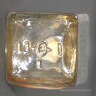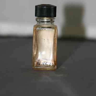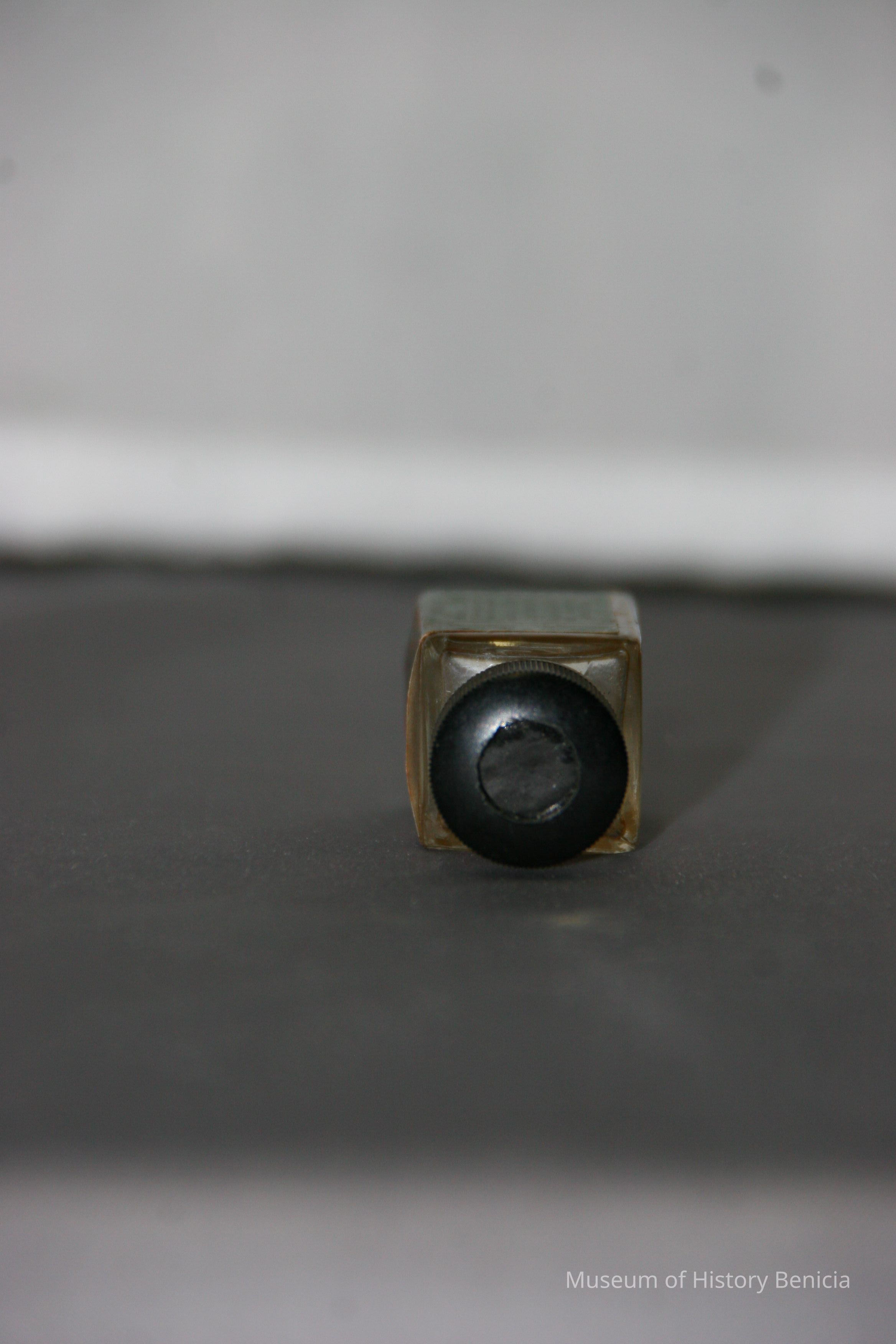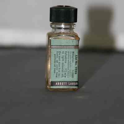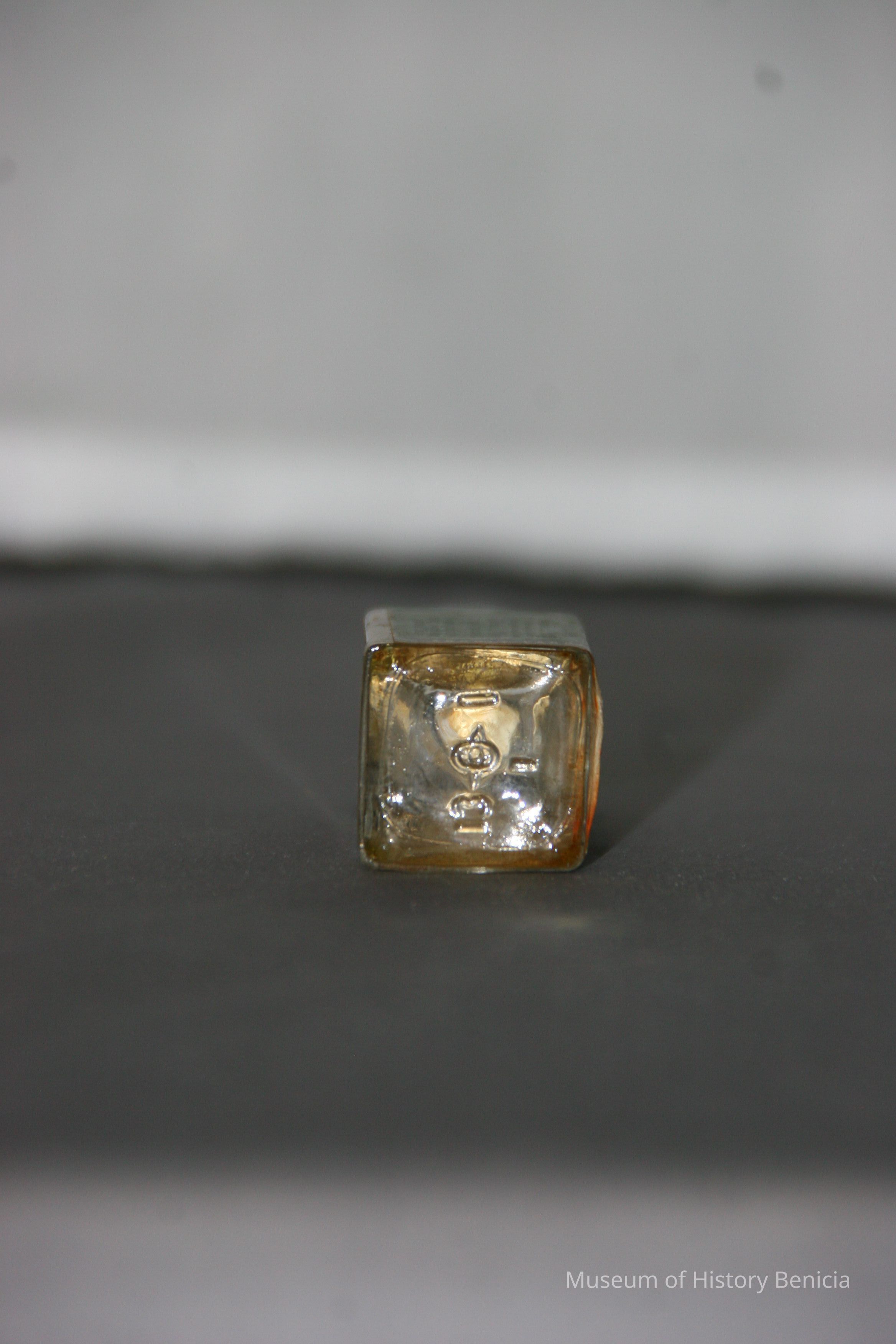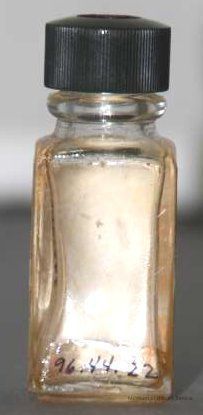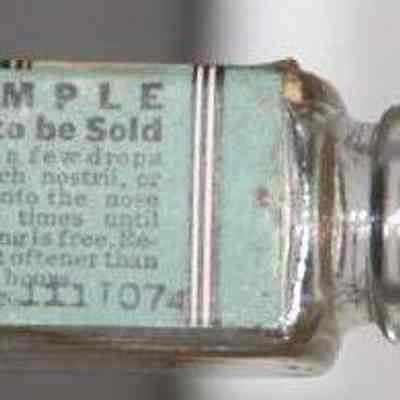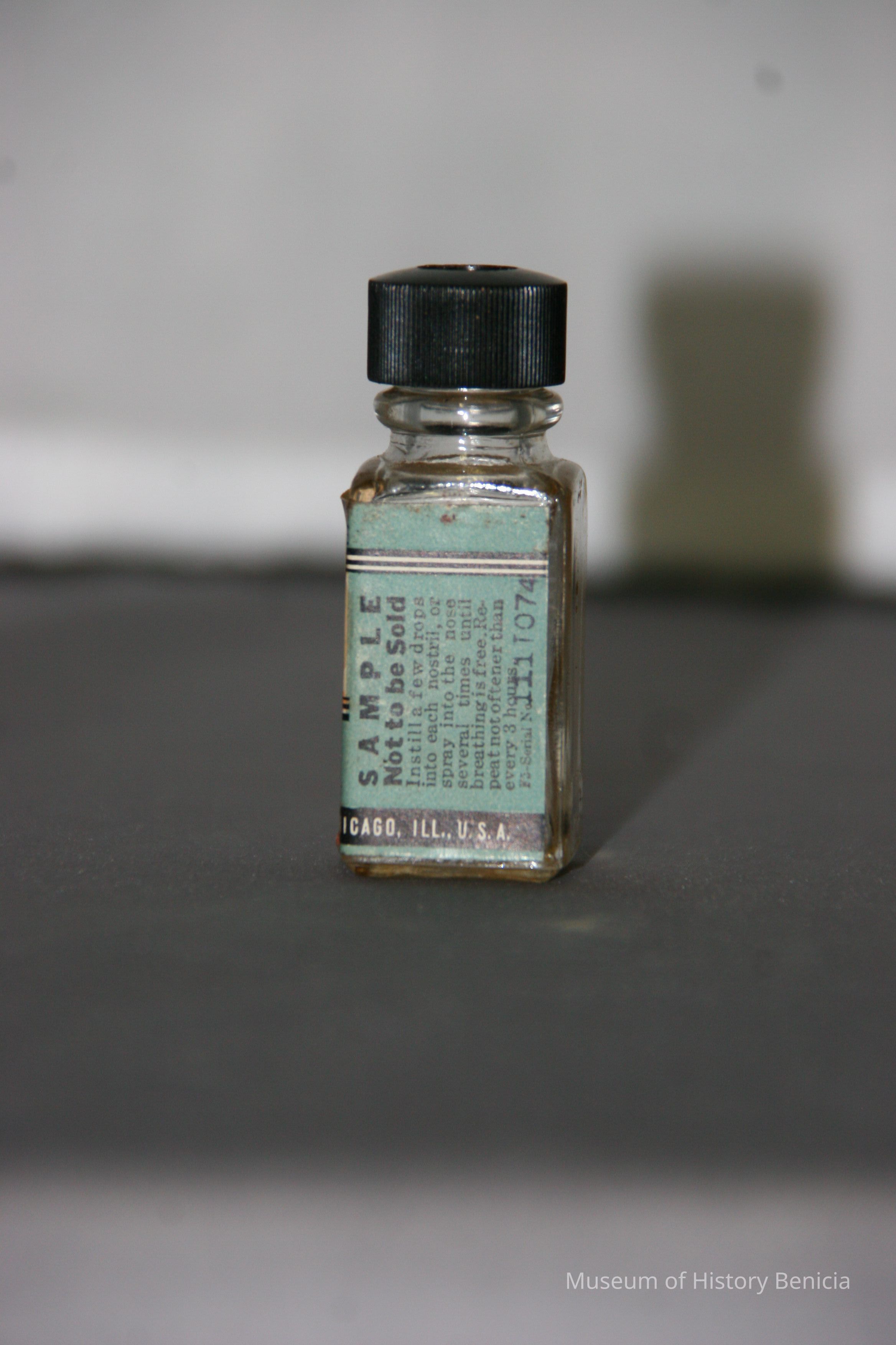 small clear medicine bottle w/blue-white-black manufacturer's label