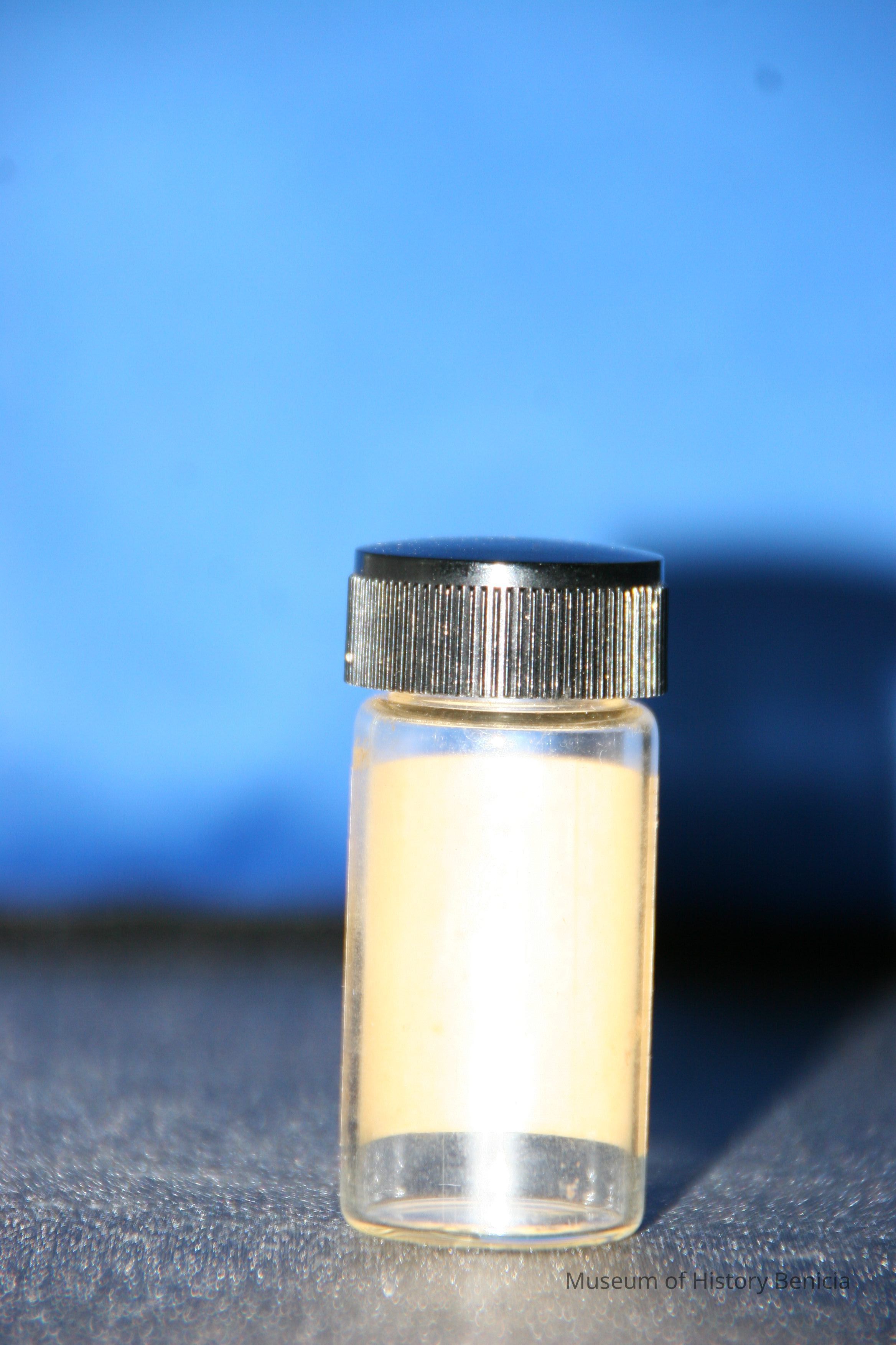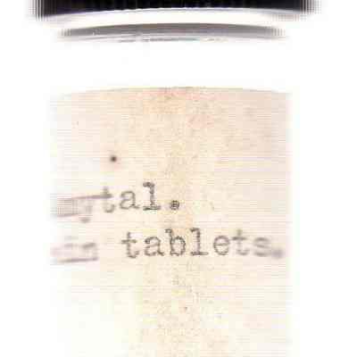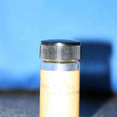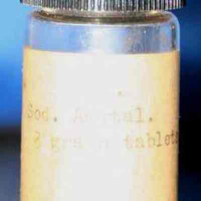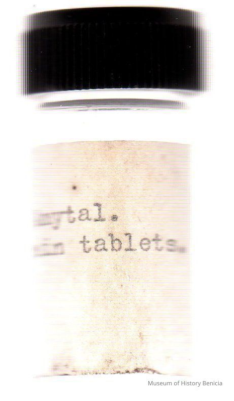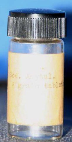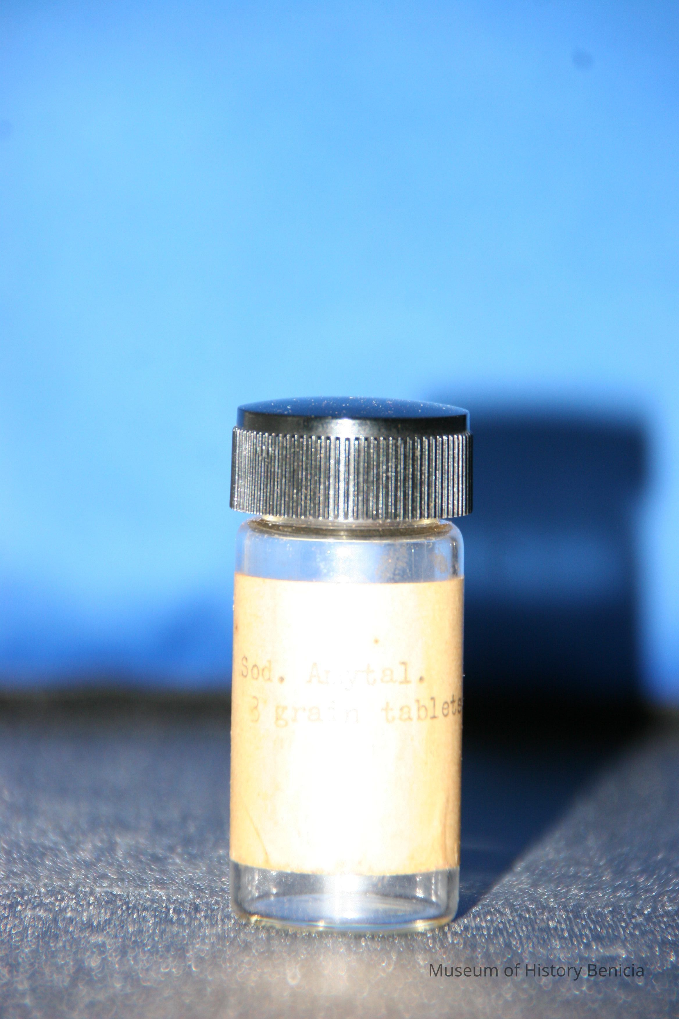 small clear medicine bottle w/discolored cream label "Sod. Amytal 3 grain tablets." typed on label black screw on plastic (Bakelite?) cap