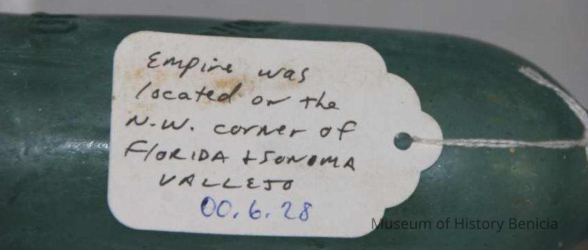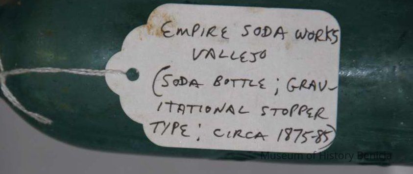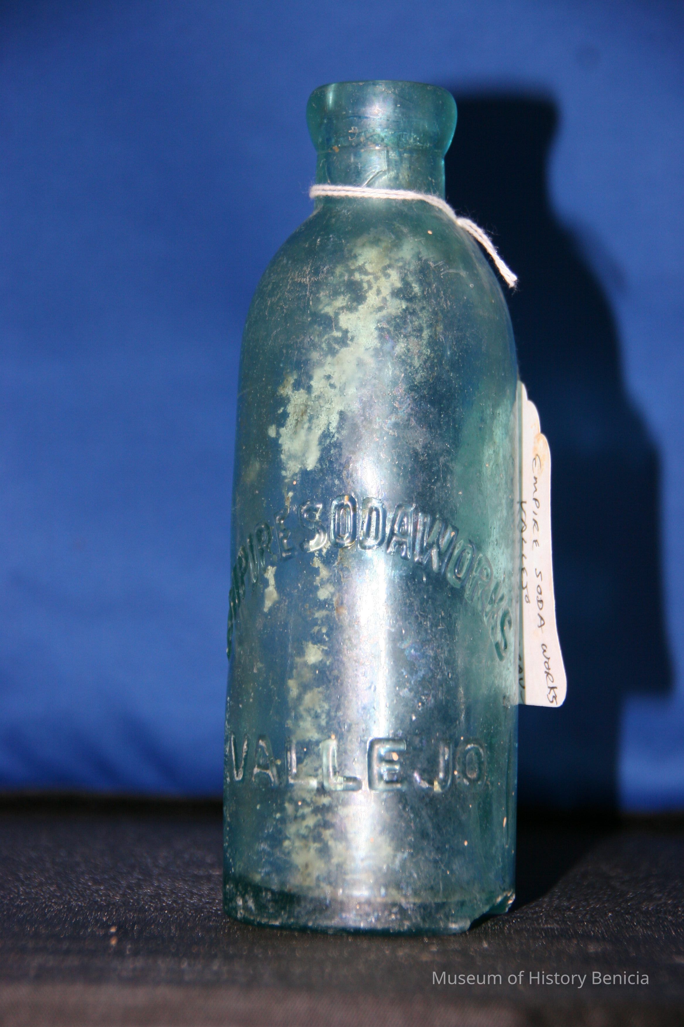 Pale blue-green with "Empire Soda Works Vallejo" on side. Empire Soda Works was located on northwest corner of Florida & Sonoma Streets in Vallejo. Bottle is Mathews gravitating-stopper-type bottle, has severely chipped bottom.Collection