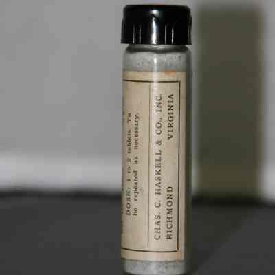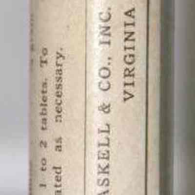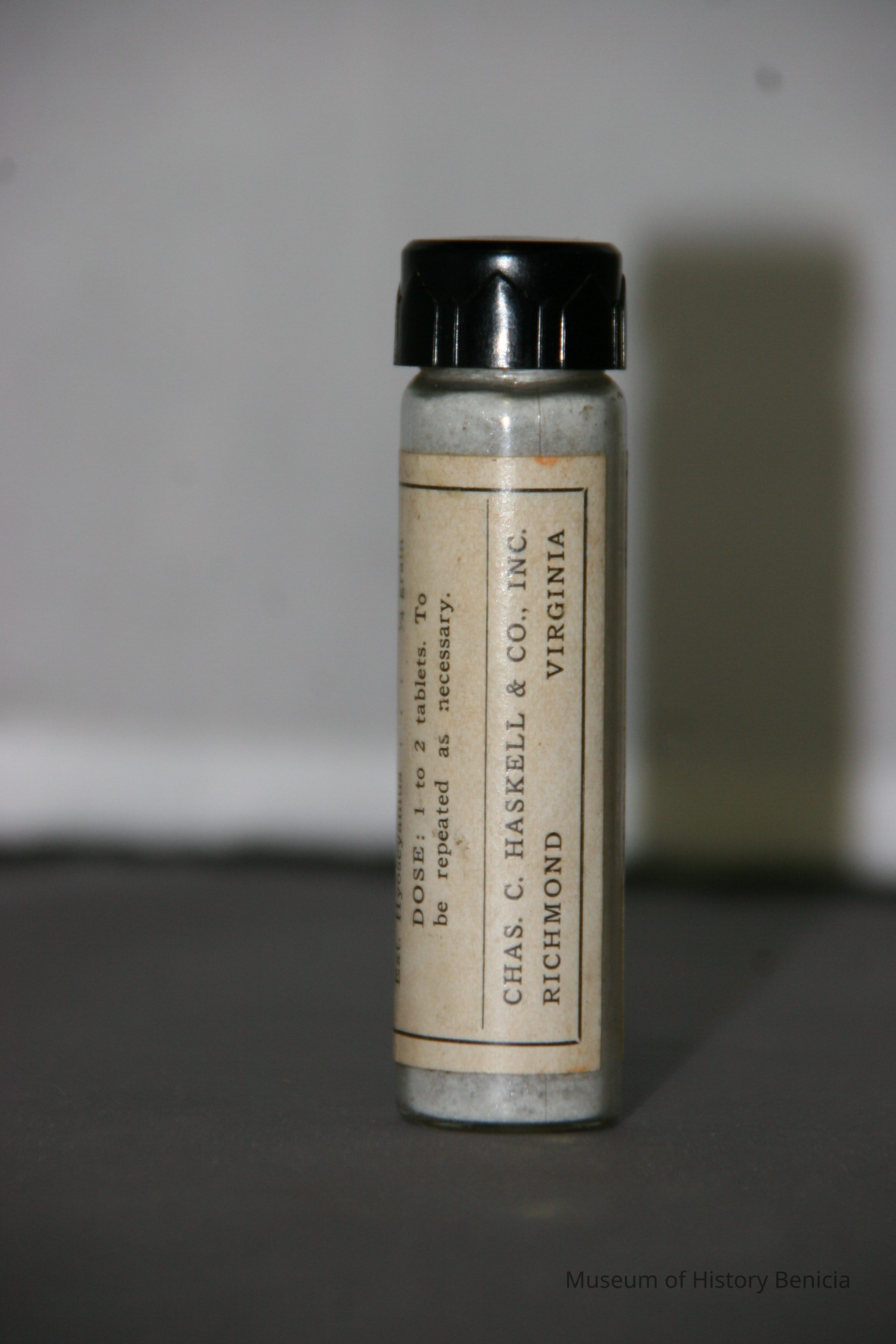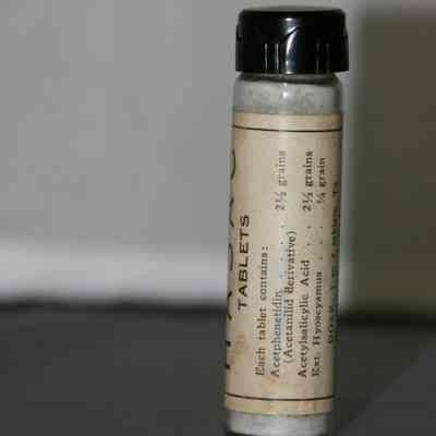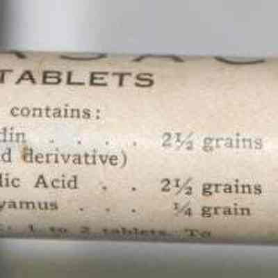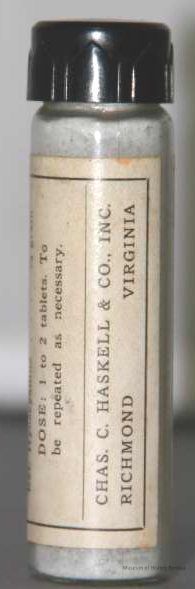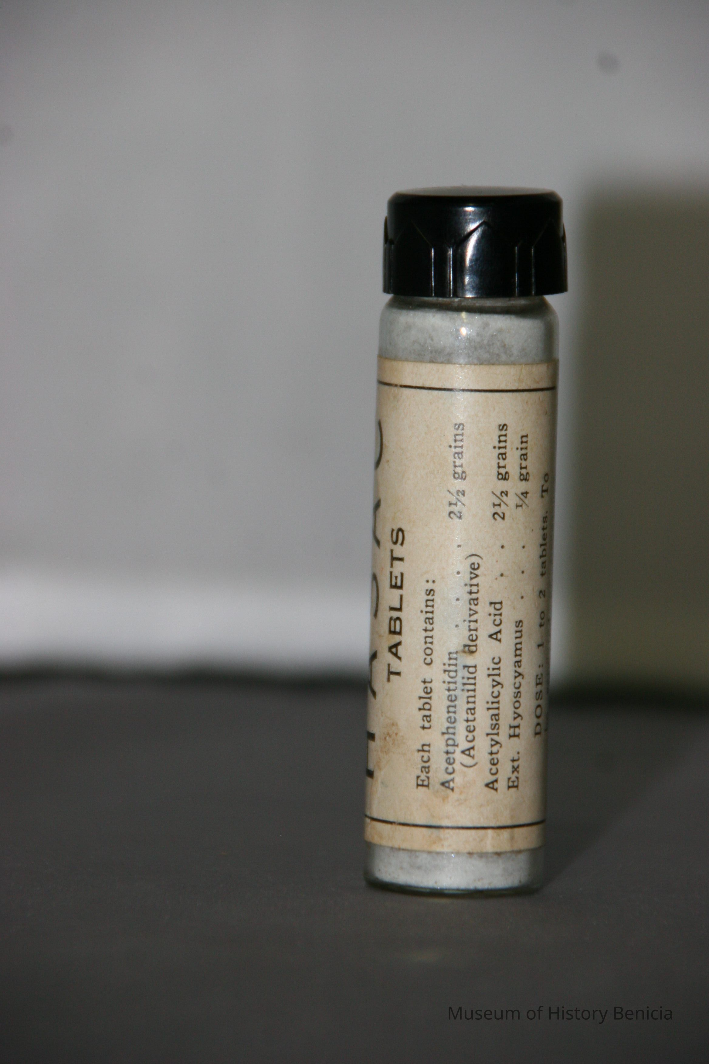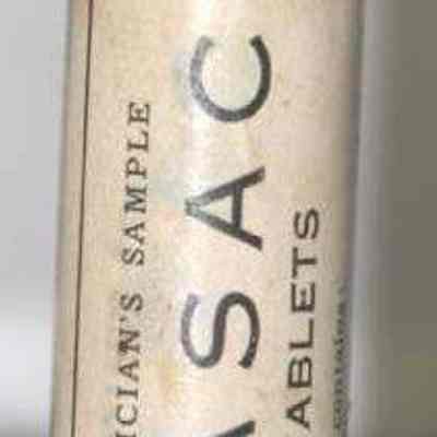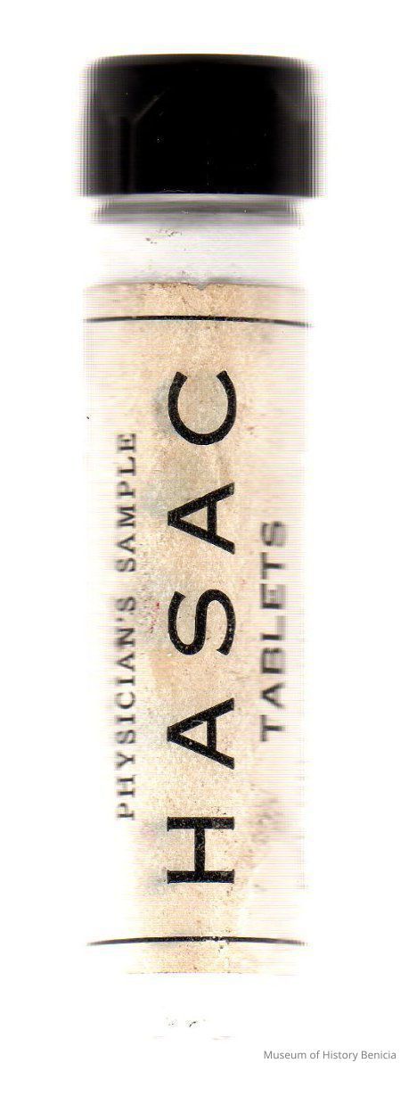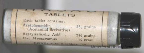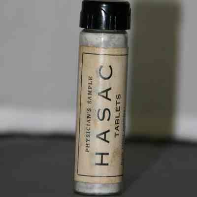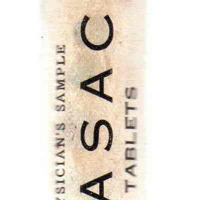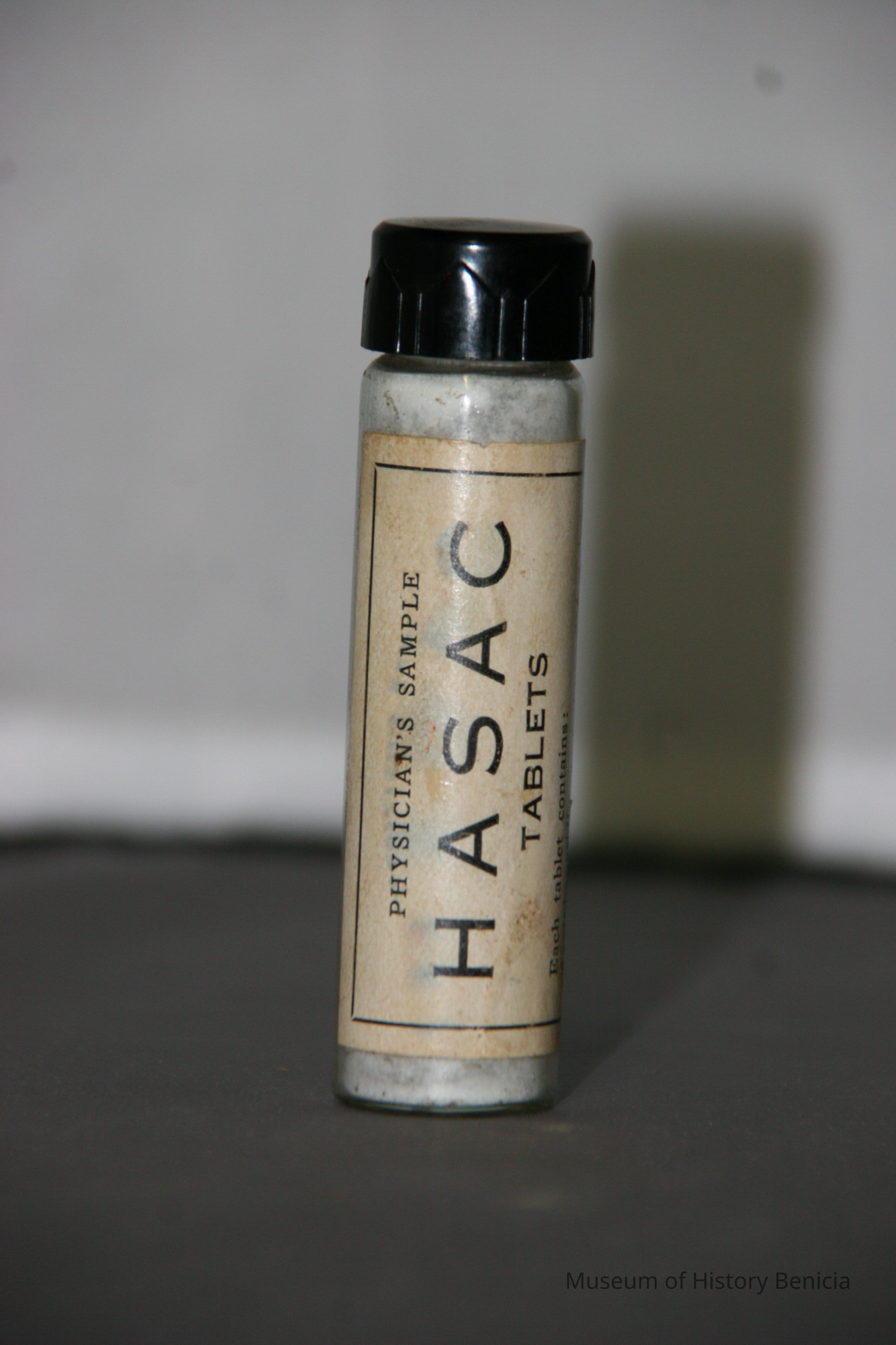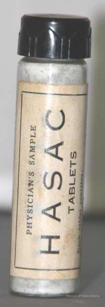 "Physician's Sample HASAC tablets" "Each tablet contains Acetphenetidin 2-1/2 grains; Acetylsalicylic Acid 2-1/2 grains; Ext. Hyoscyasmus 1/4 grain Dose 1 to 2 tablets. To be repeated as necessary."