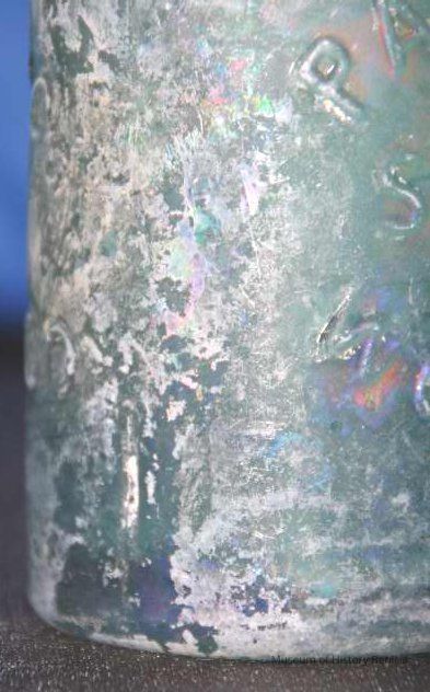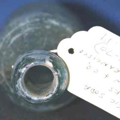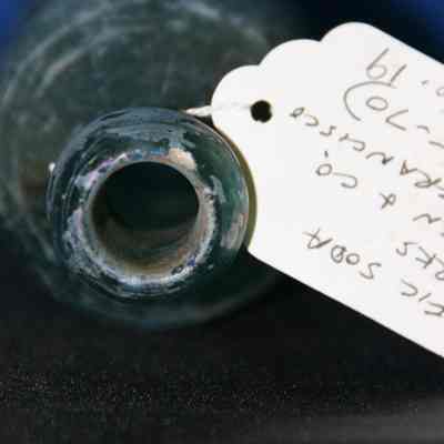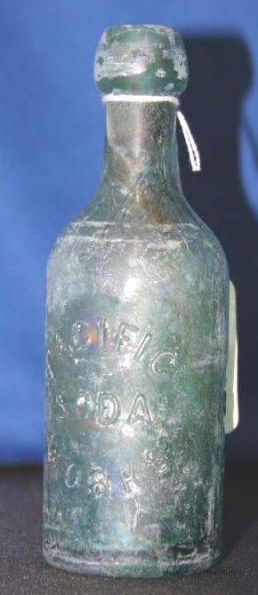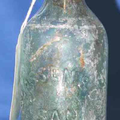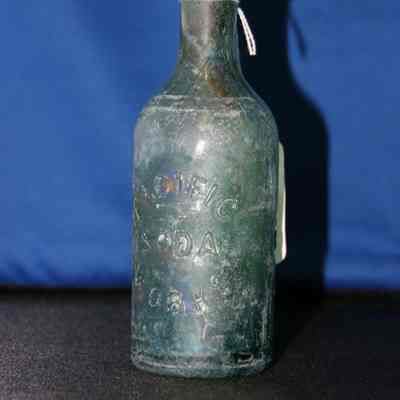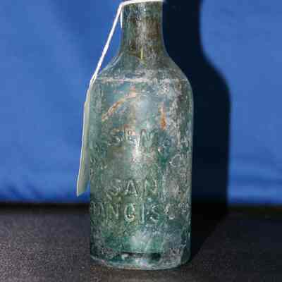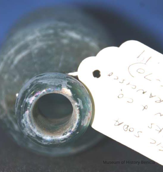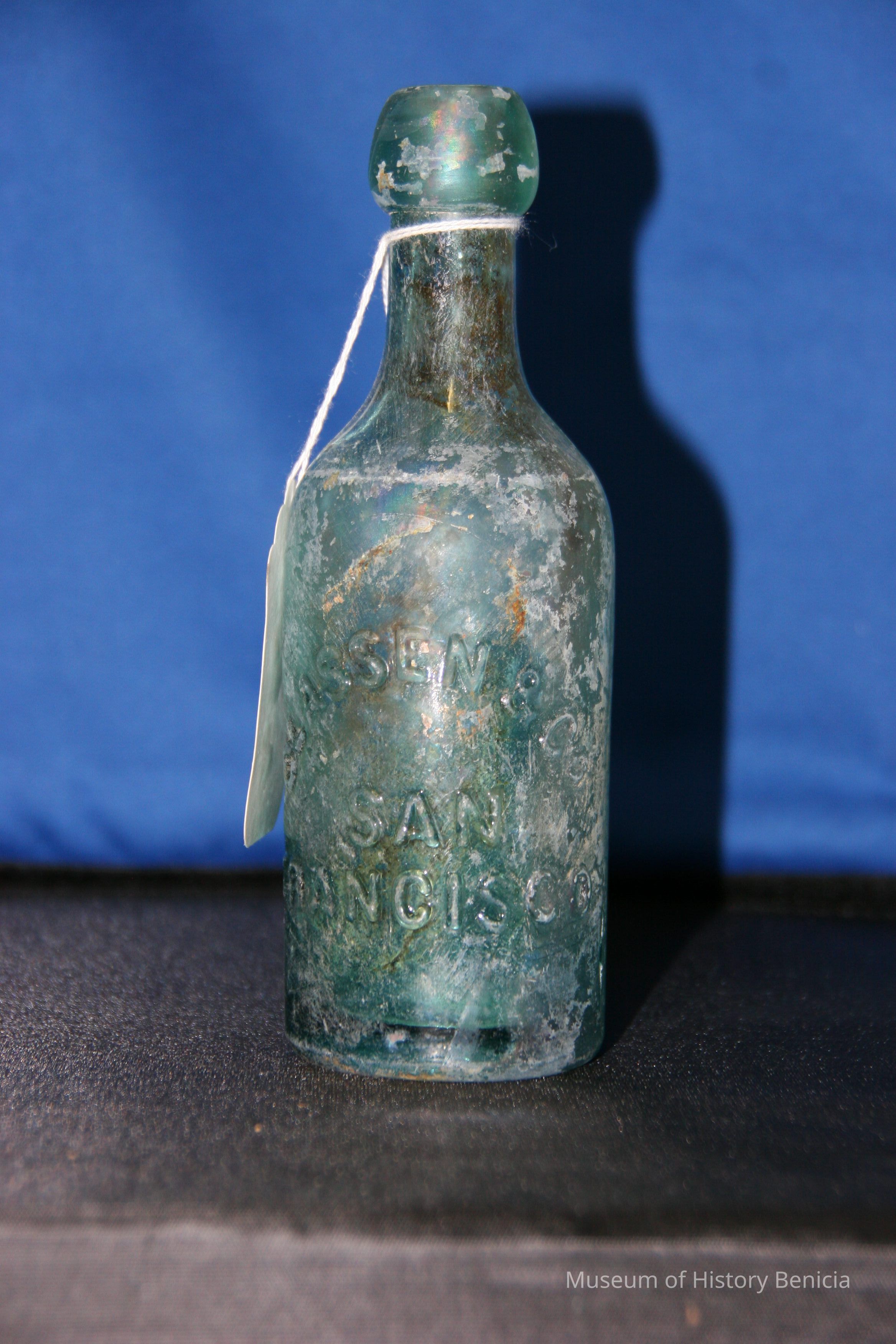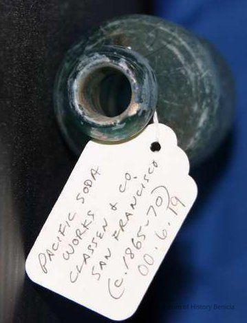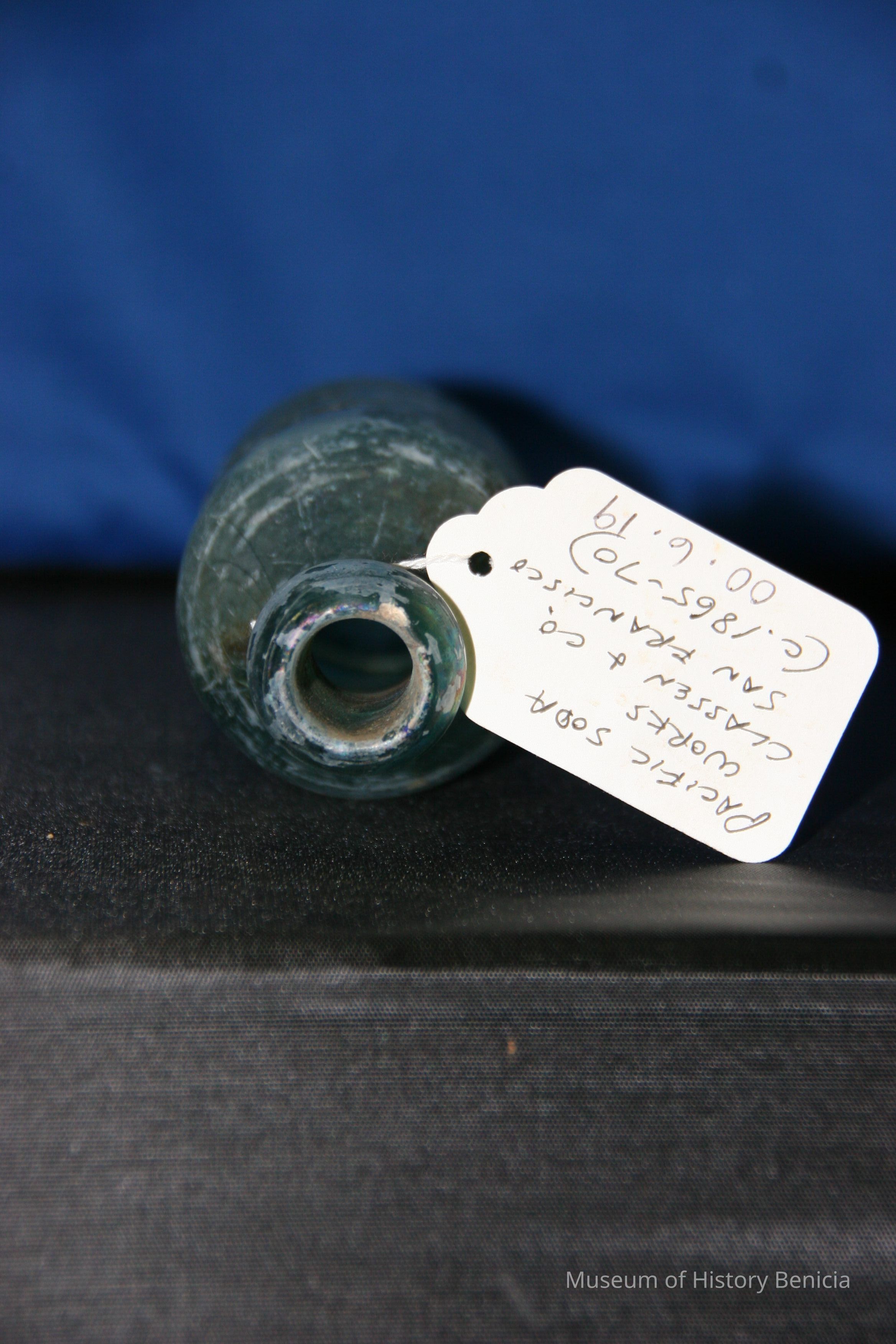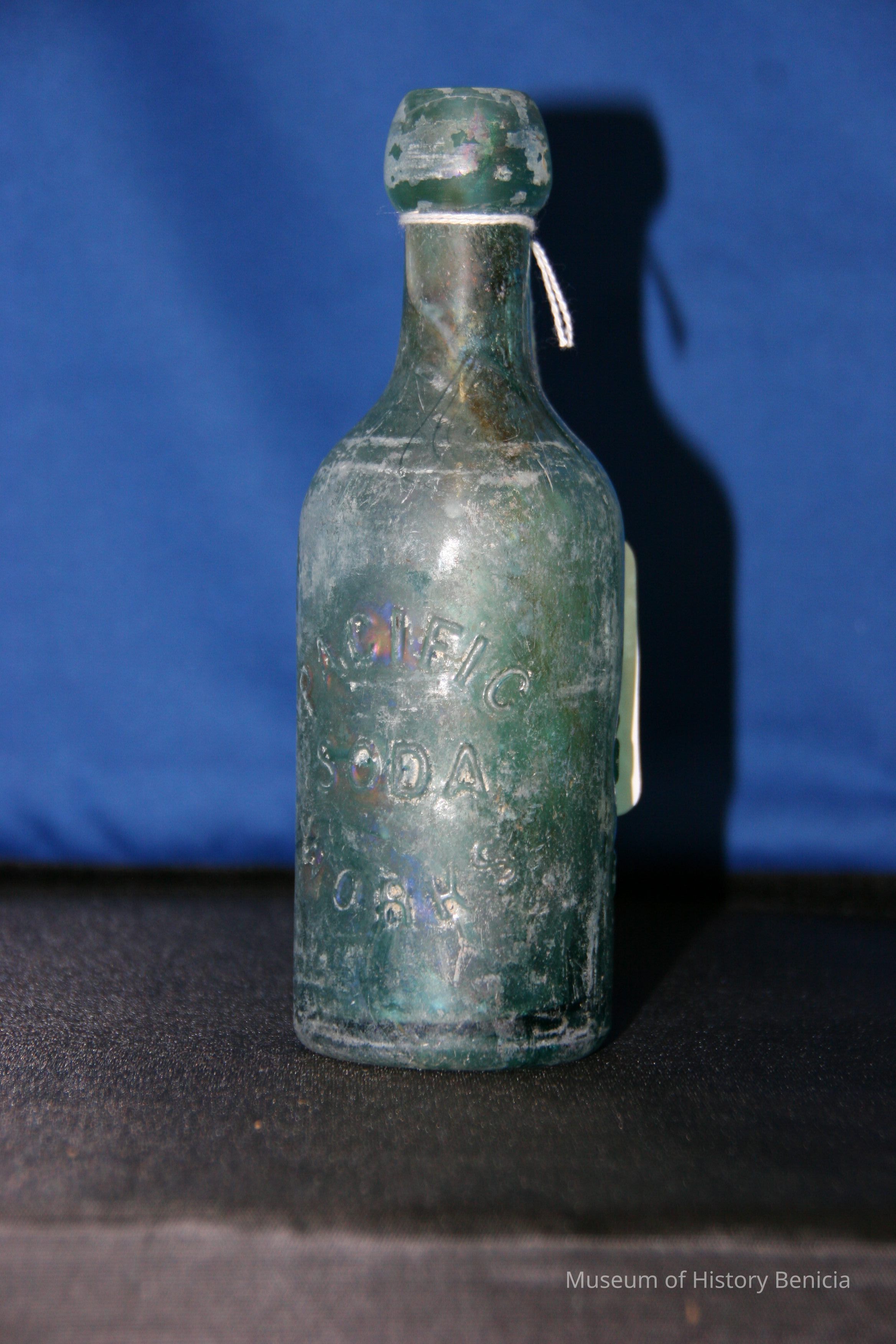 Glass soda water bottle found at Benicia Barracks site; found near current site of the National Guard Armory on Hillcrest Avenue in Benicia.