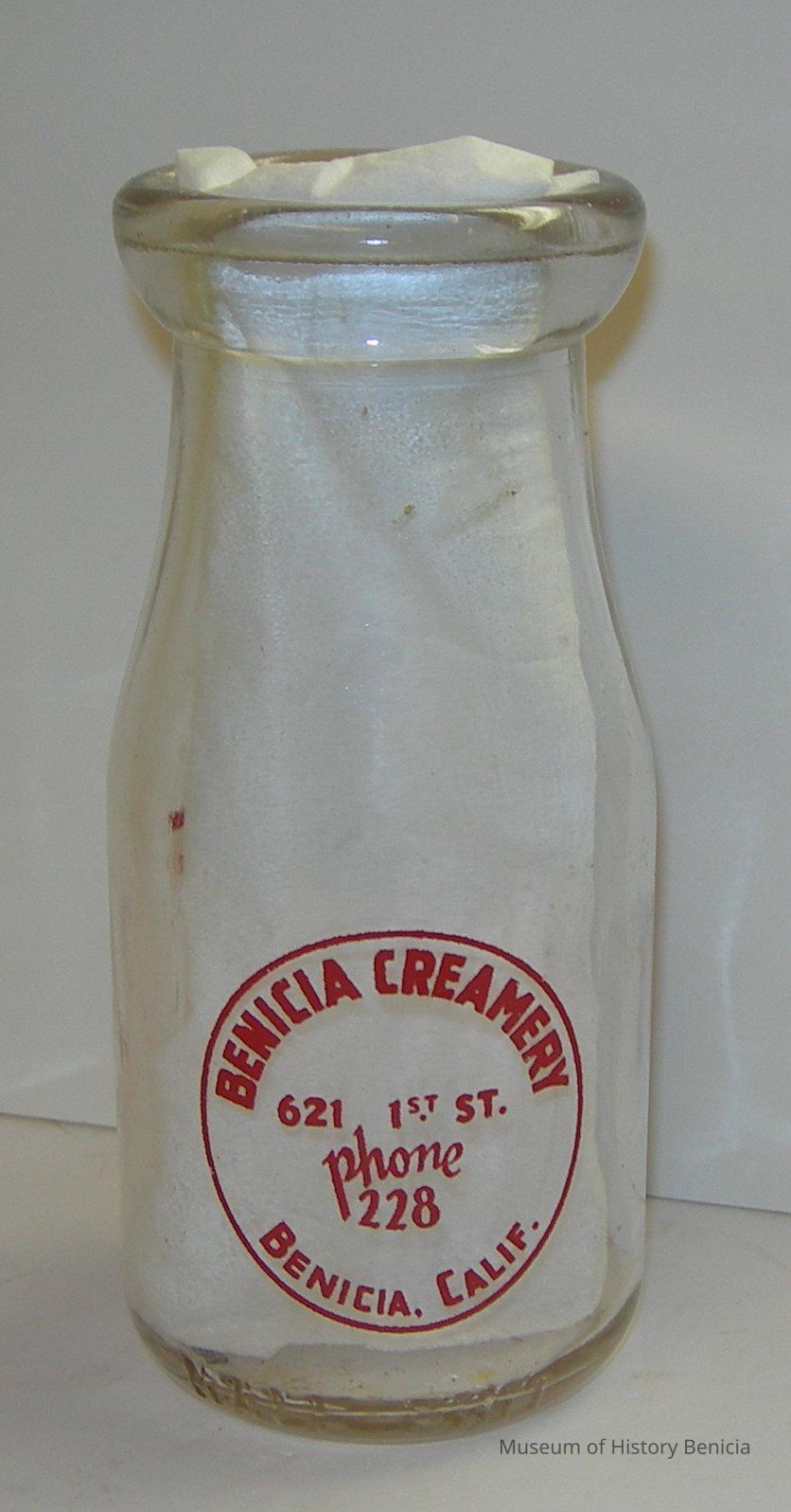 Red letters on the front in a circle: "Benicia Creamery / 621 1st St. / Phone / 228 / Benicia, Calif."