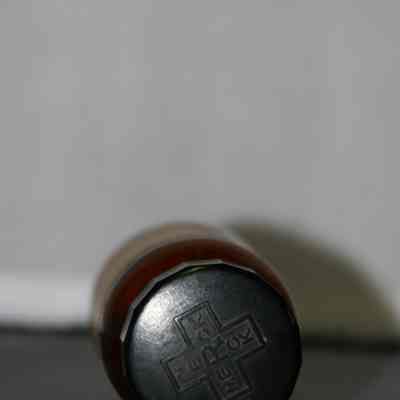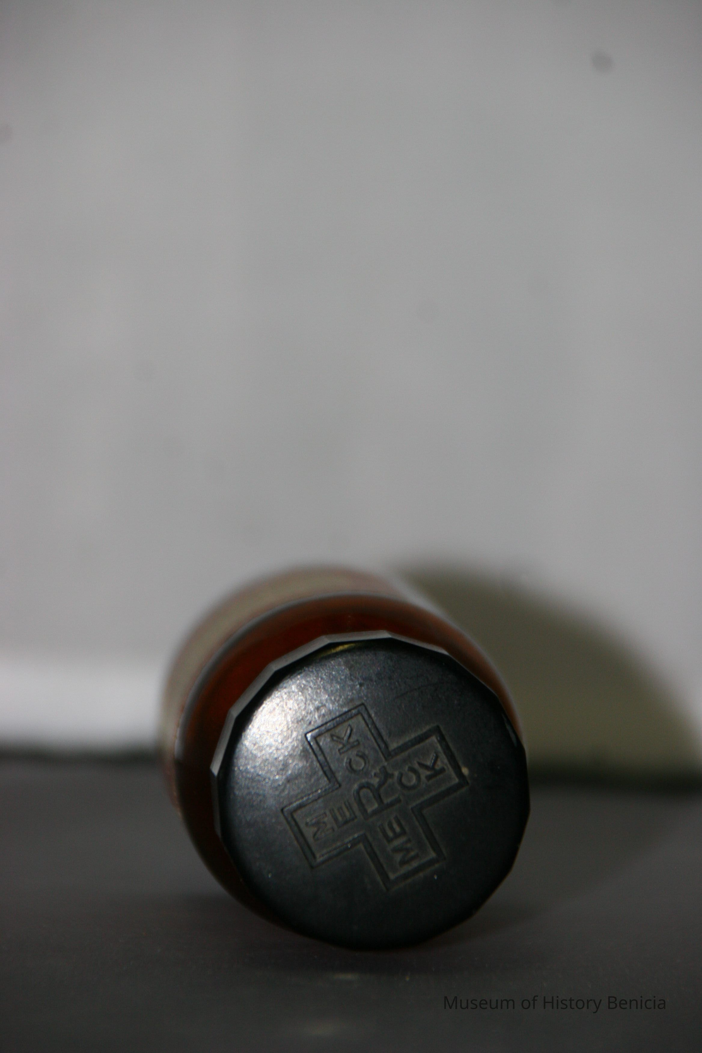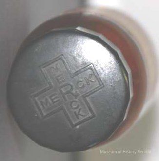 screw on black plastic (bakelite?) cap "Merck" on cap in form of cross reading top-to-bottom and side-to-side