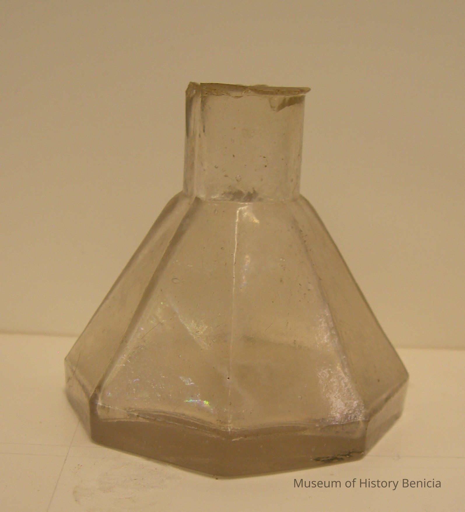 1870's clear glass ink bottle, umbrella style; 8-sided bottom, 2-1/2" across; 2-1/2" tall with 5/8" opening at top.