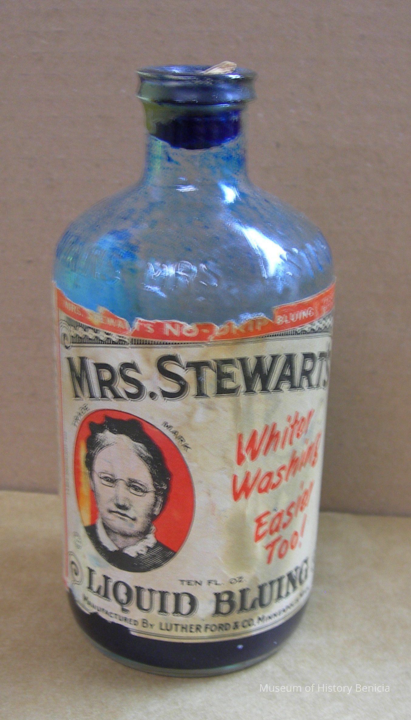 In raised letters on the bottle: "This Contains Mrs. Stewart's Bluing";