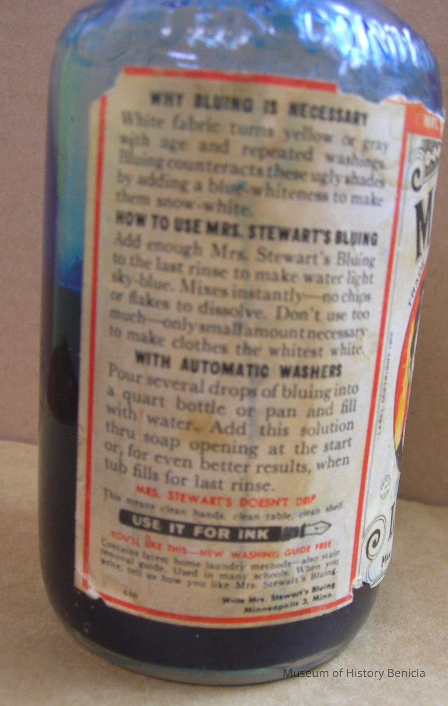 Information on the label includes: Why bluing is necessary; How to use Mrs. Stewart's Bluing; With Automatic Washers; "Use it for Ink"