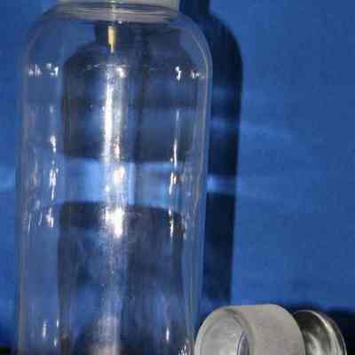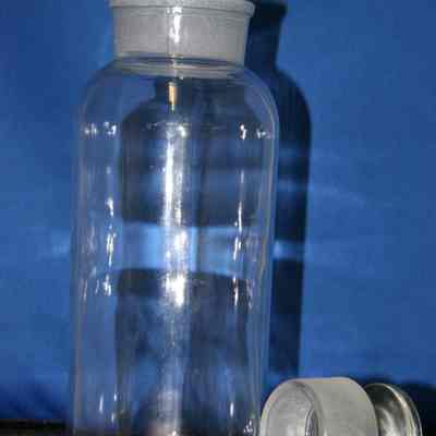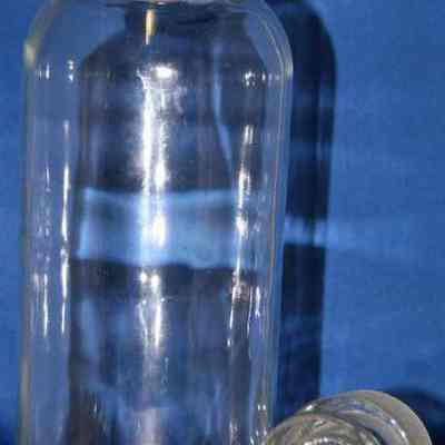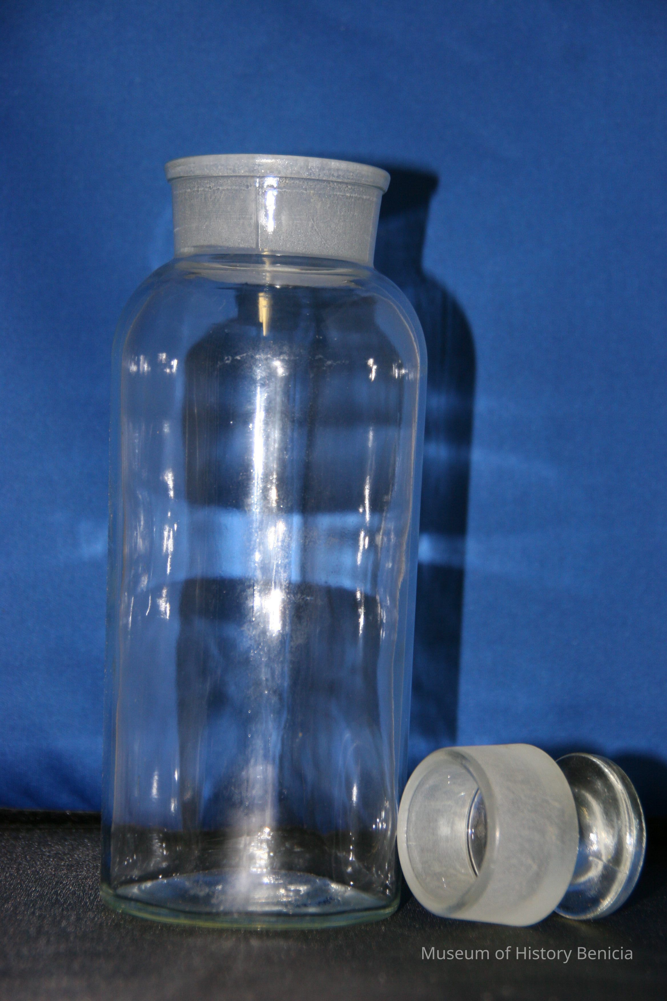 Clear bottle with glass stopper (1993.100.0050b). 8.5" tall with a 2" mouth.