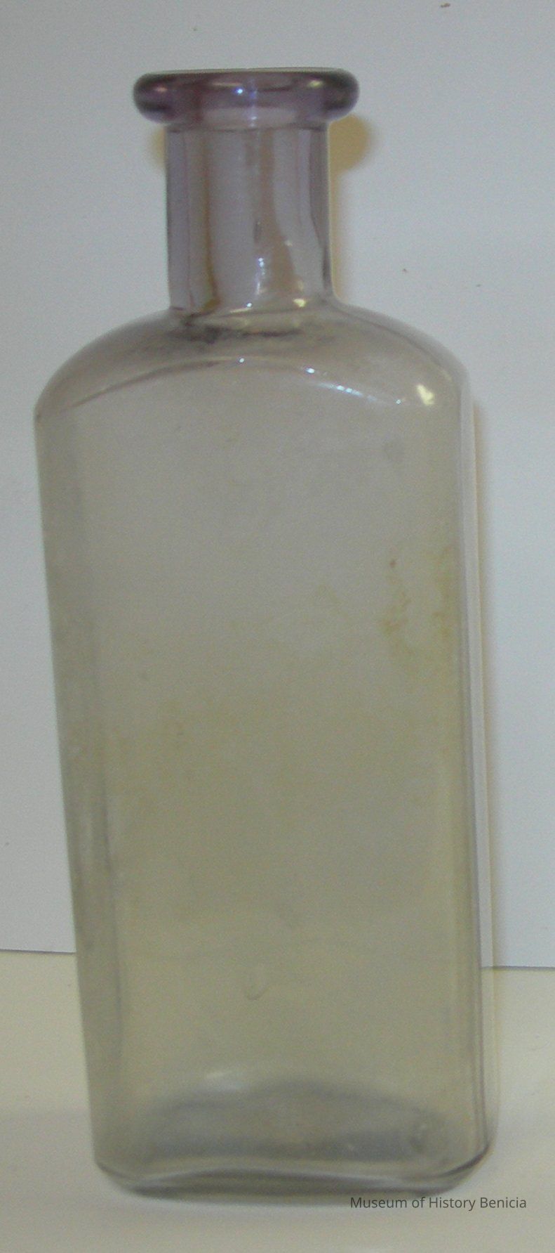 Clear glass medicine-type bottle with a tinge of purple at the top "1" in raised number on bottom