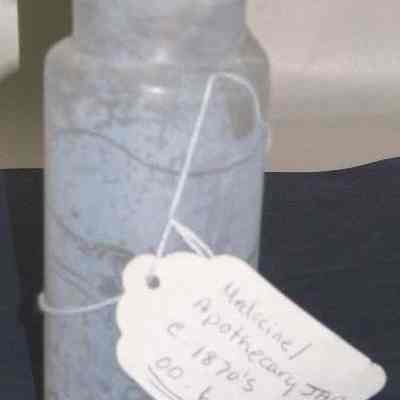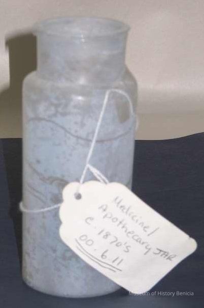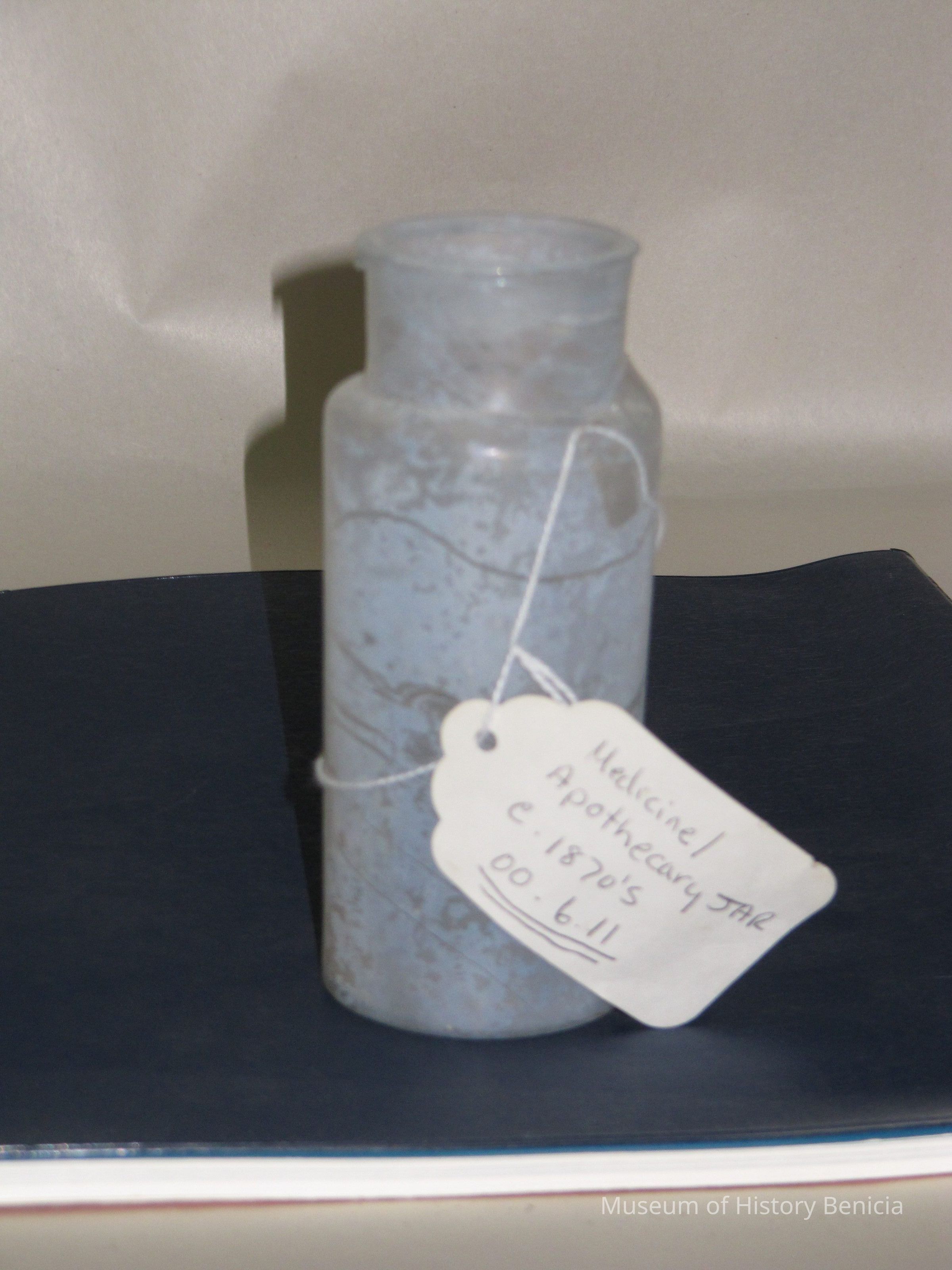 Glass medicine bottle/apothecary jar found at Benicia Barracks site; found near current site of the National Guard Armory on Hillcrest Avenue in Benicia.Collection