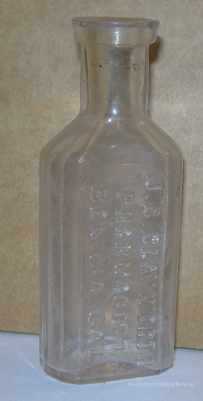 Clear medicine bottle; in raised letters on one side: