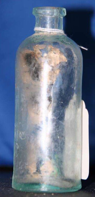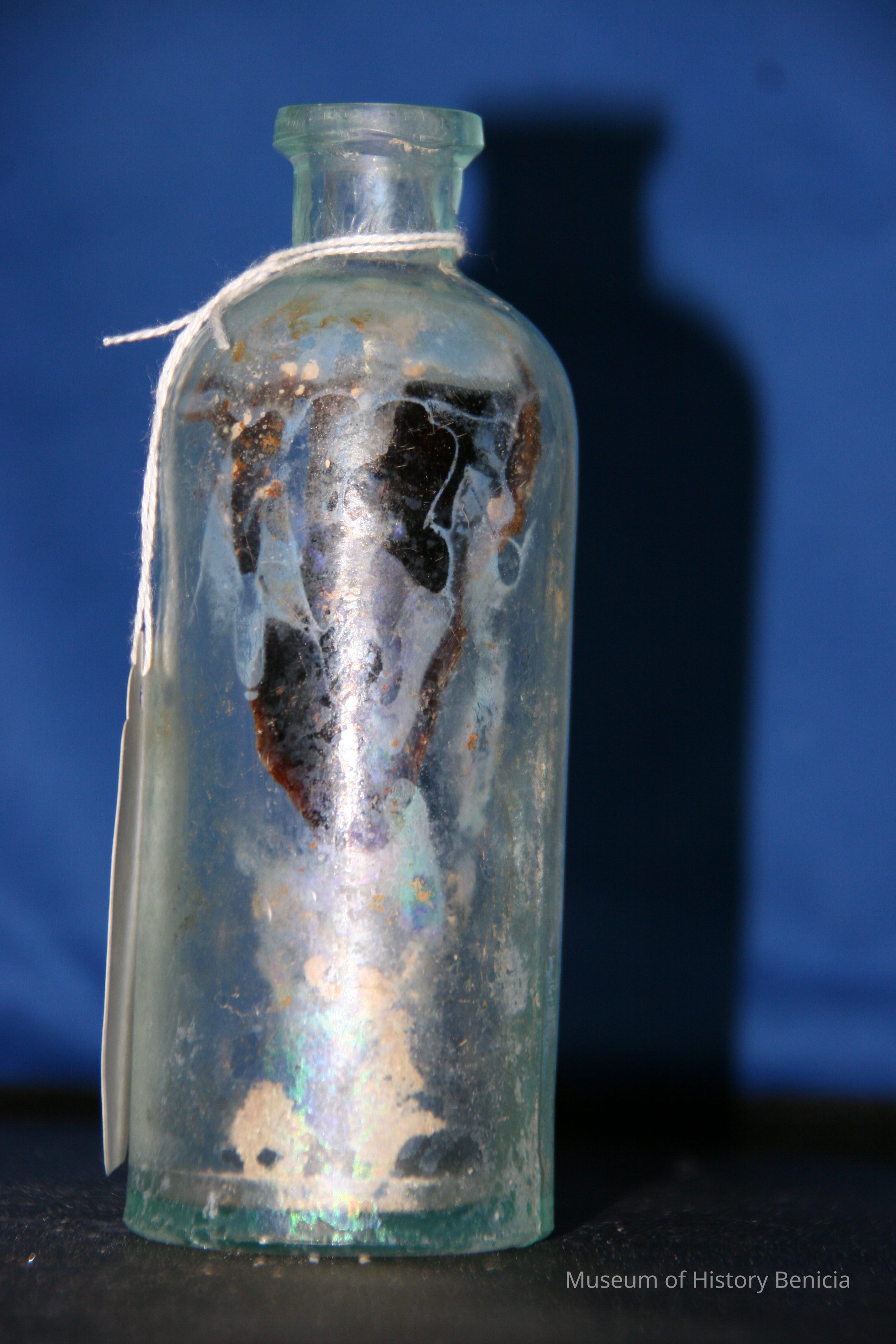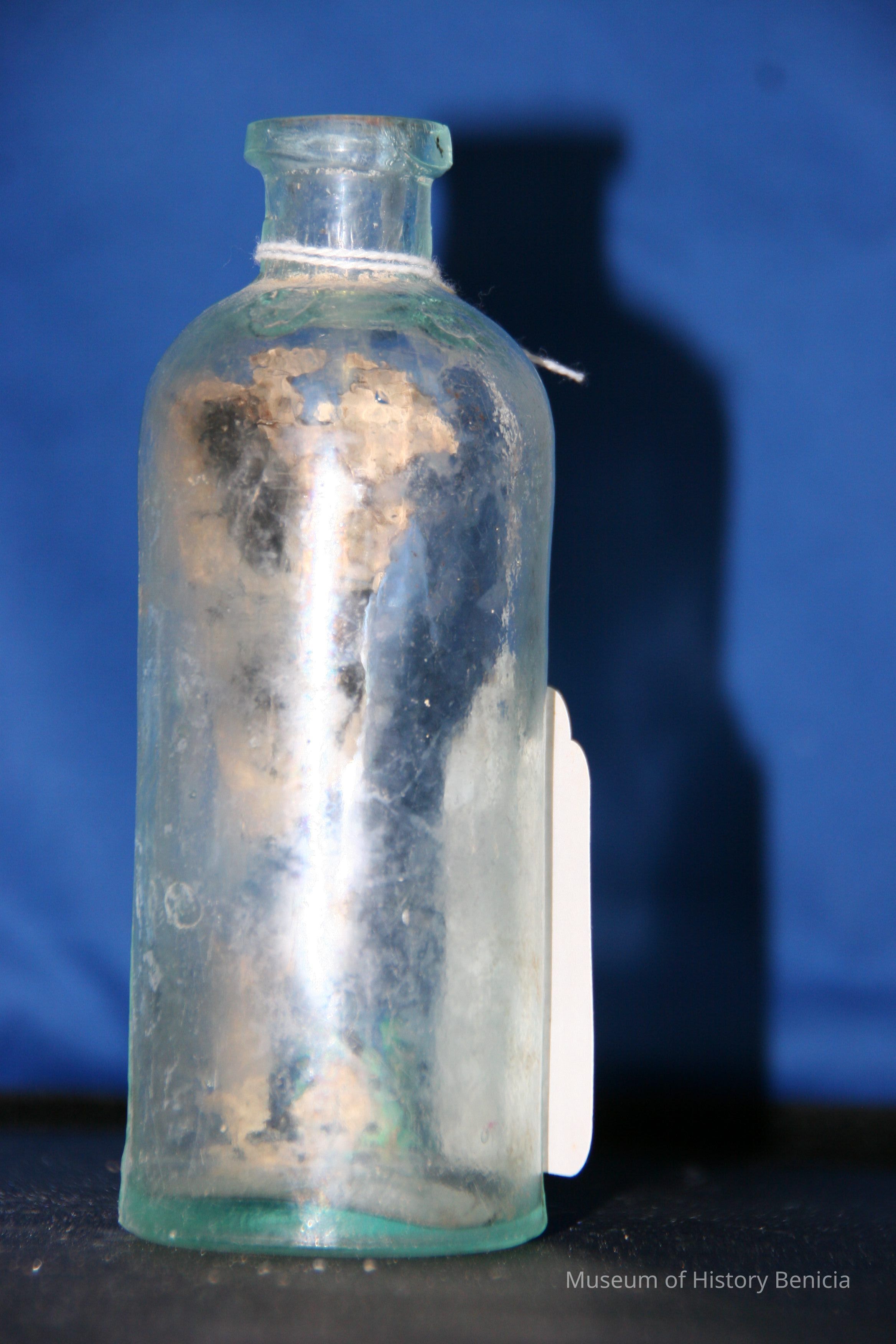 Glass medicine bottle found at Benicia Barracks site; found near current site of the National Guard Armory on Hillcrest Avenue in Benicia.