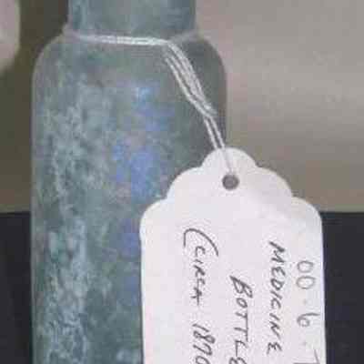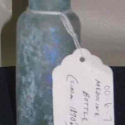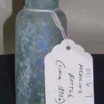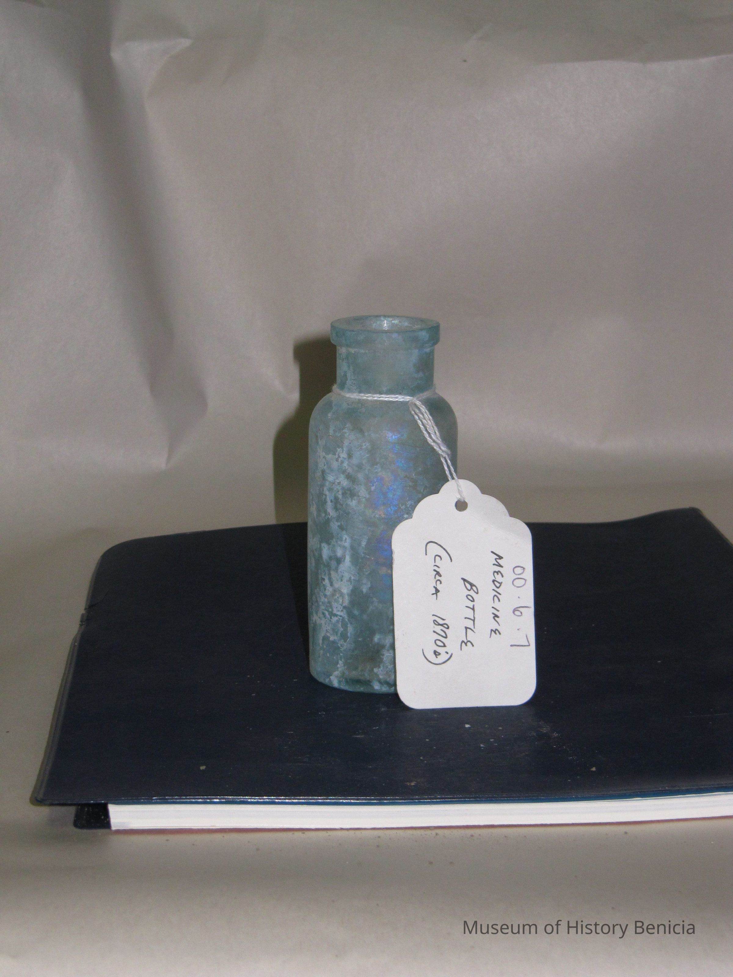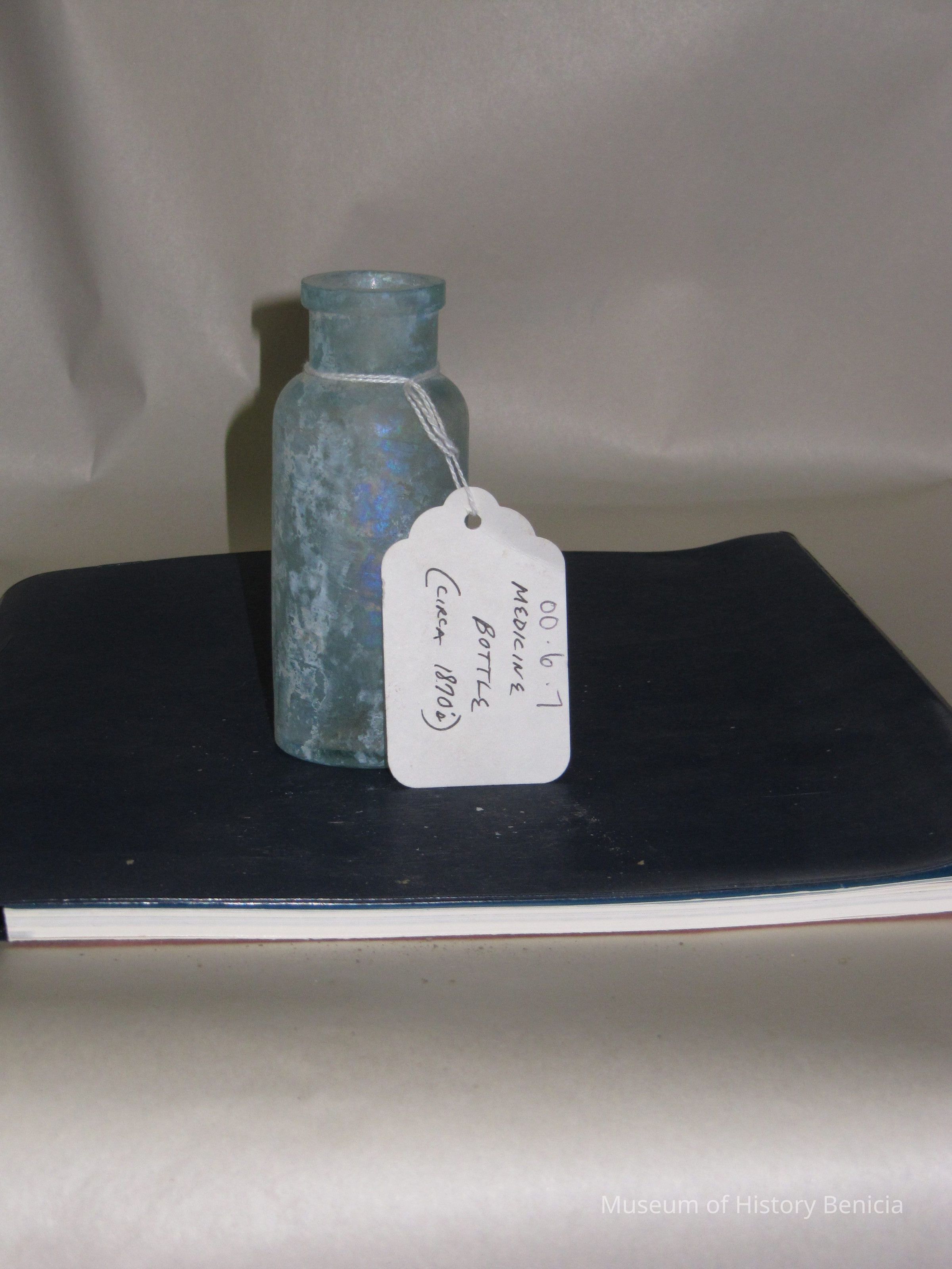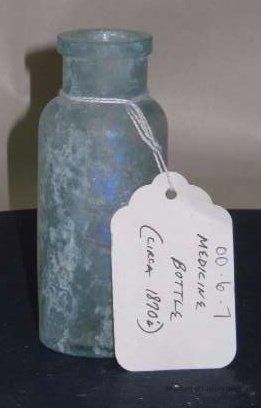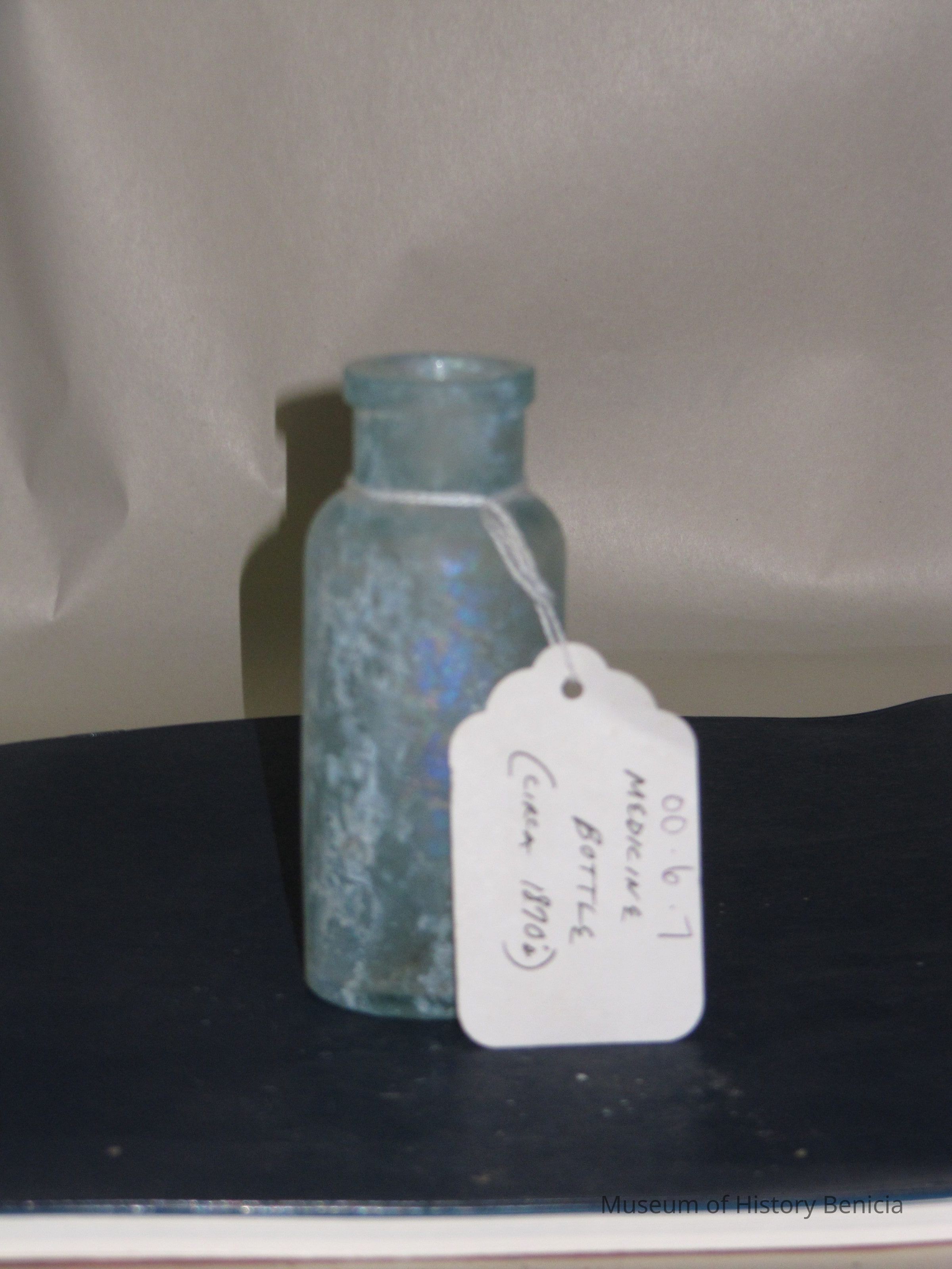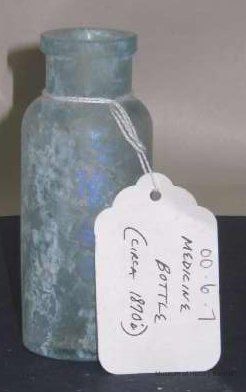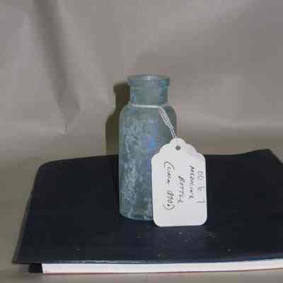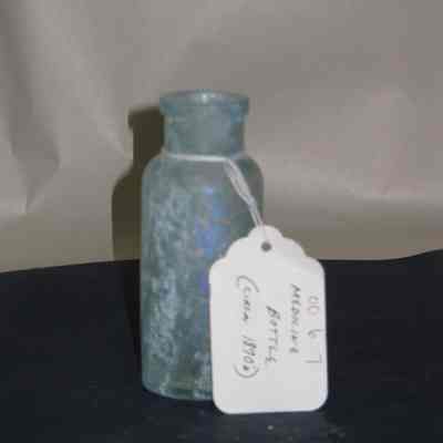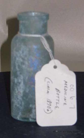 Glass medicine bottle found at Benicia Barracks site; found near current site of the National Guard Armory on Hillcrest Avenue in Benicia.