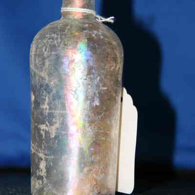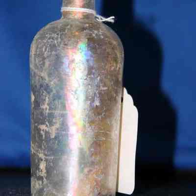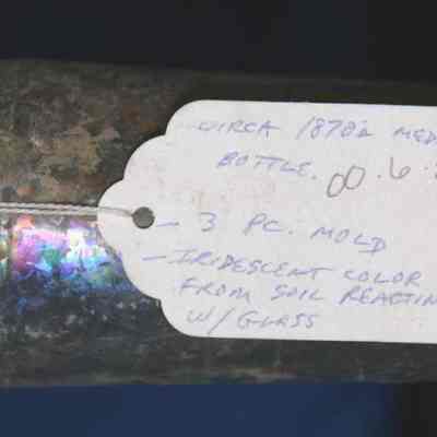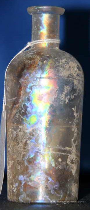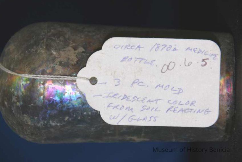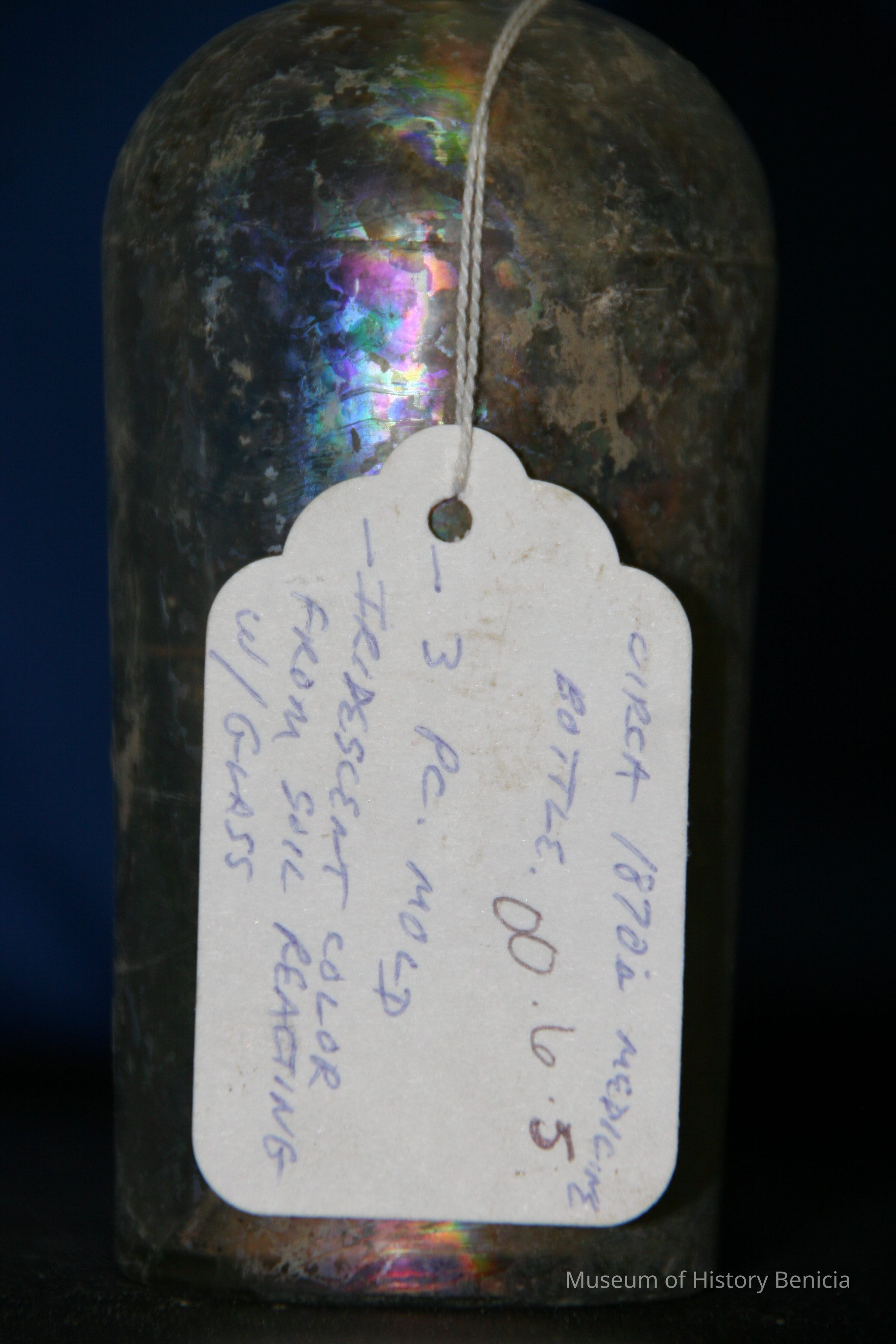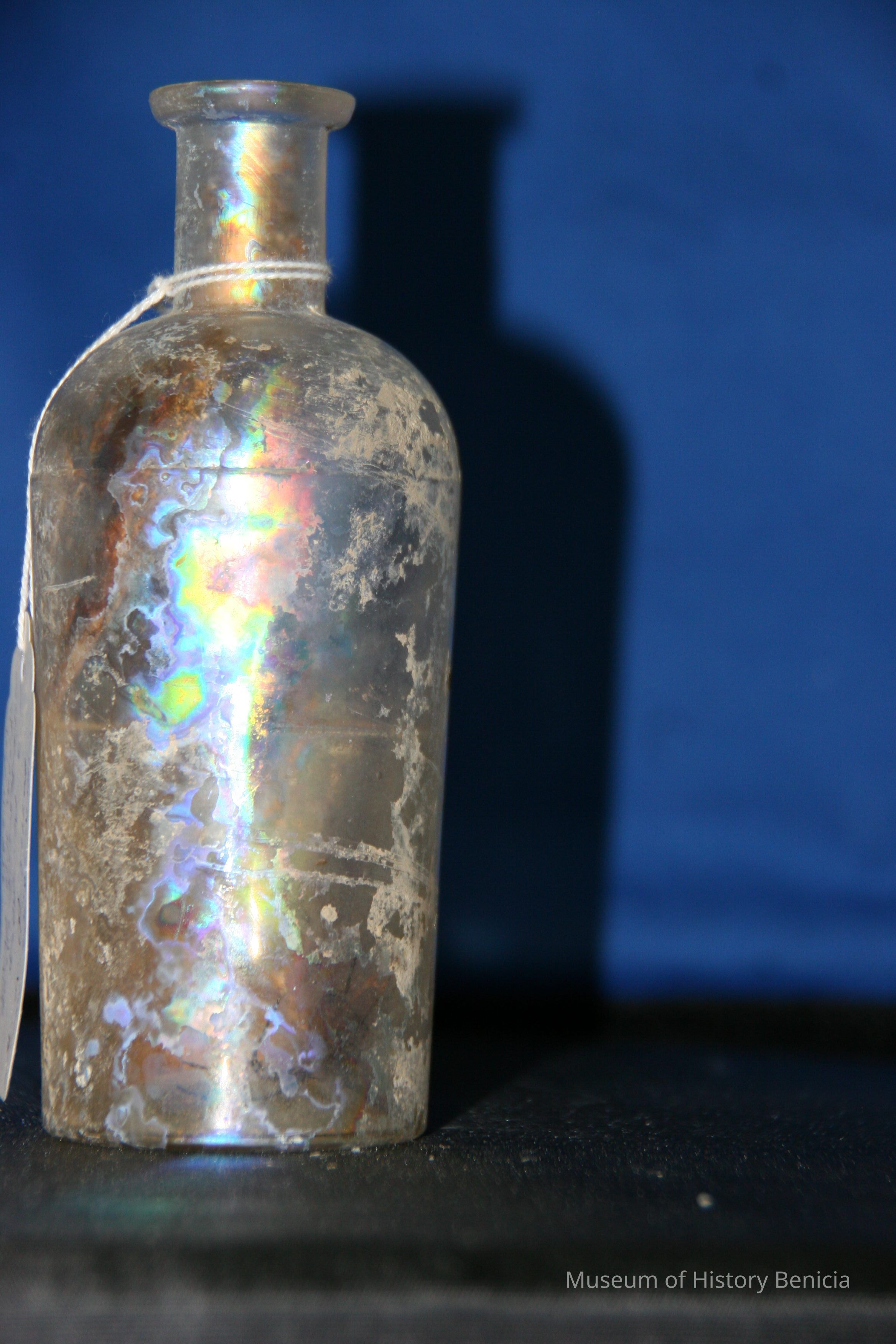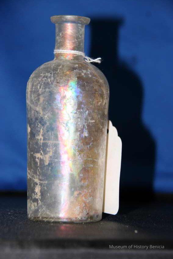 Glass medicine bottle found at Benicia Barracks site; found near current site of the National Guard Armory on Hillcrest Avenue in Benicia.