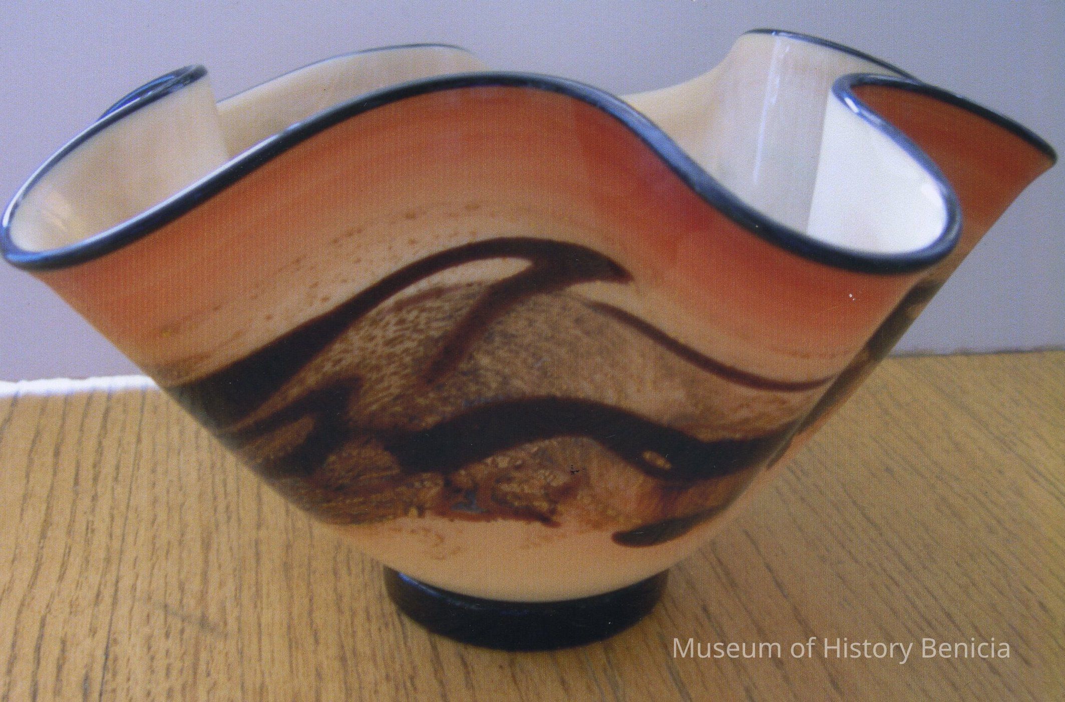 Decorative Bowl - Nourot glass blown; fluted; red/orange with black swirls and gold flecks;