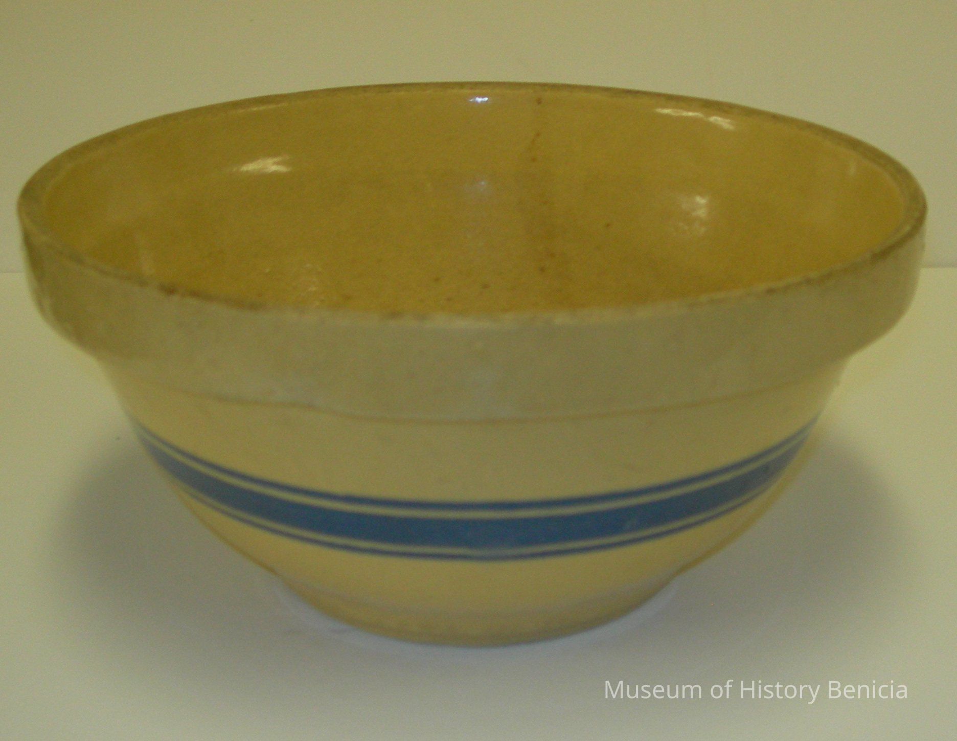 medium sized kitchen bowl. Light tan clay with blue stripes (narrow, wide, narrow) around the middle.