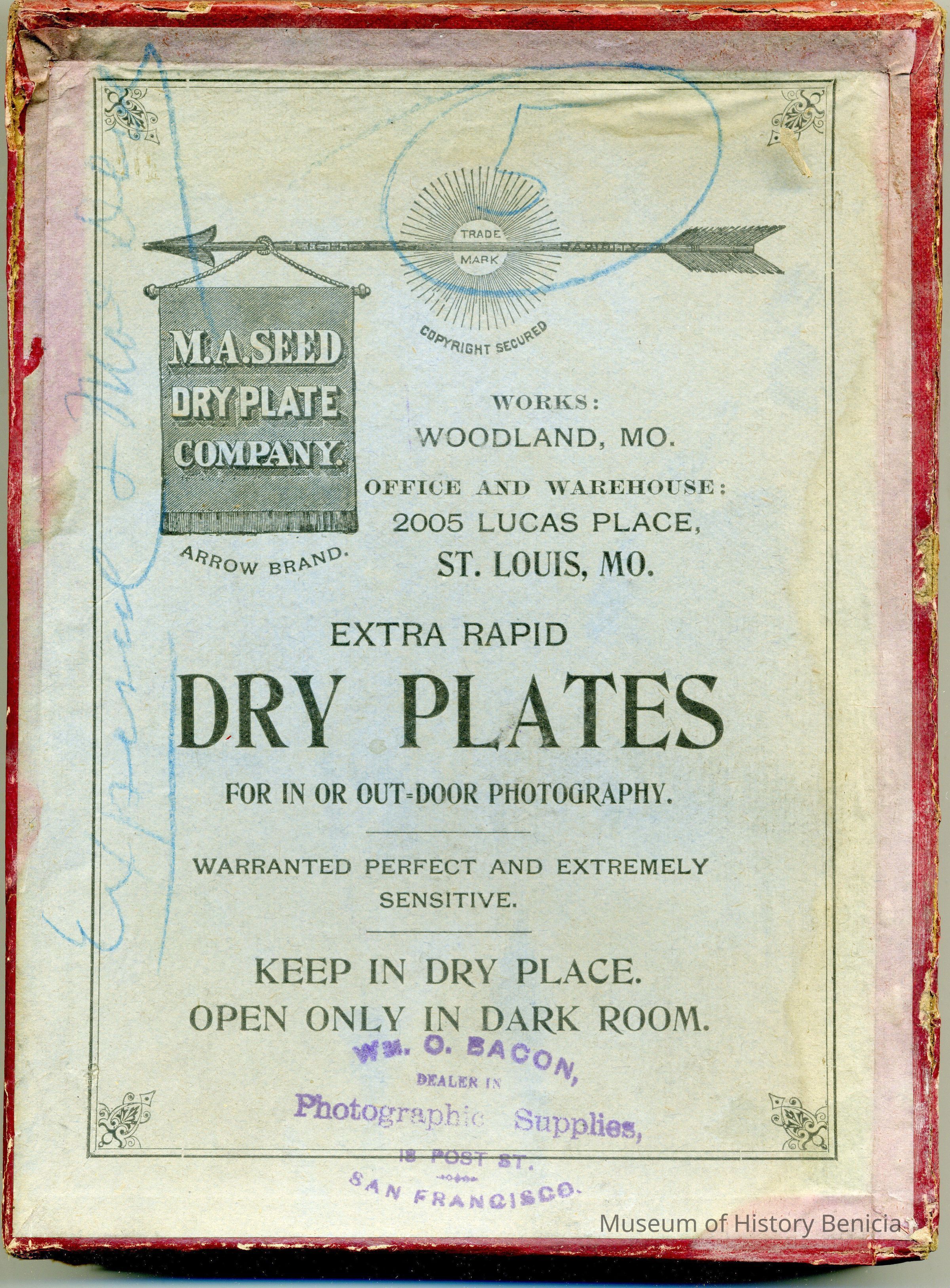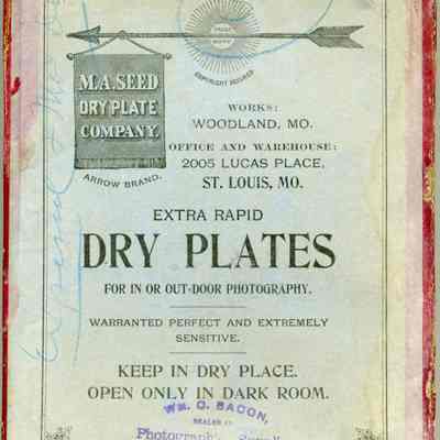 Cardboard box for holding glass plates used in photography. The box is 5.5 x 7.5" and probably held 12 5 x 7 Dry Plate glass negatives. The manufacturer was M.A. Seed Company of Woodland, Mo. There is a number written on the outside "5". Inside are some yellow tissues used to separate the plates. They have some writting on them but it is too faded to read. Written on the top is "Exposed and Not Devel".