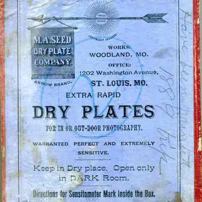 Cardboard box for holding glass plates used in photography. The box is 5.5 x 8.5" and probably held 12 5 x 8 Dry Plate glass negatives. The manufacturer was M.A. Seed Company of Woodland, Mo. There is a number written on the outside "2". Inside are some yellow tissues used to separate the plates. They have some writting on them but it is too faded to read. The bottom has another number "4" written on the end. Written on the top is "Have been printed 1889 trip". Also, "Fish" and Darken".