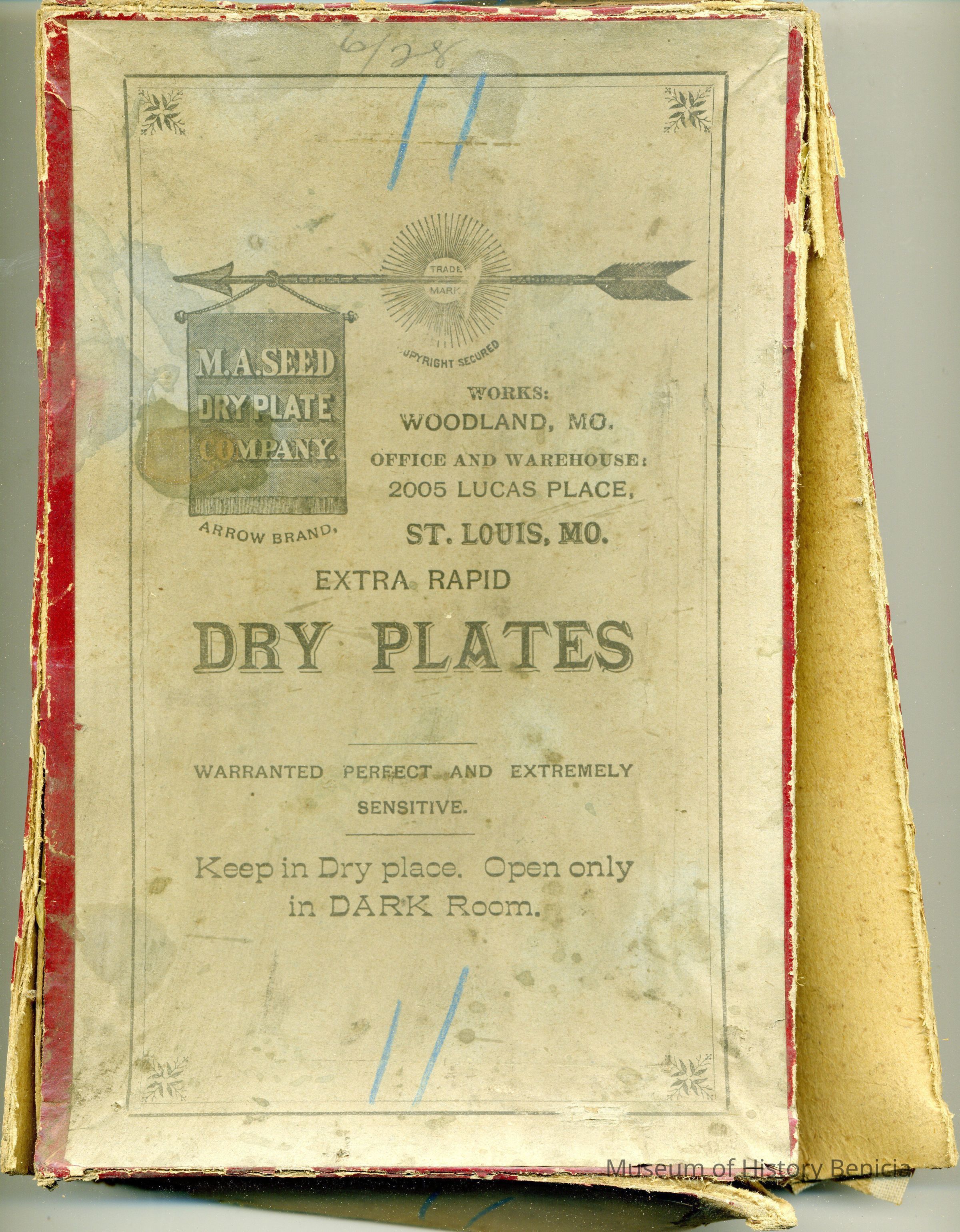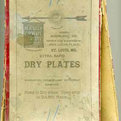 Cardboard box for holding glass plates used in photography. The box is 5.5 x 8.5" and probably held 12 5 x 8 Dry Plate glass negatives. The manufacturer was M.A. Seed Company of Woodland, Mo. There is a number written on the outside "11". Inside are some yellow tissues used to separate the plates. They have some writting on them but it is too faded to read. The bottom has another number "9" and what looks like locations where photos were taken. Included are: