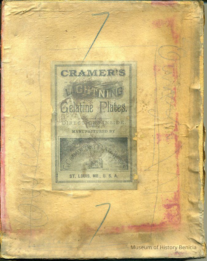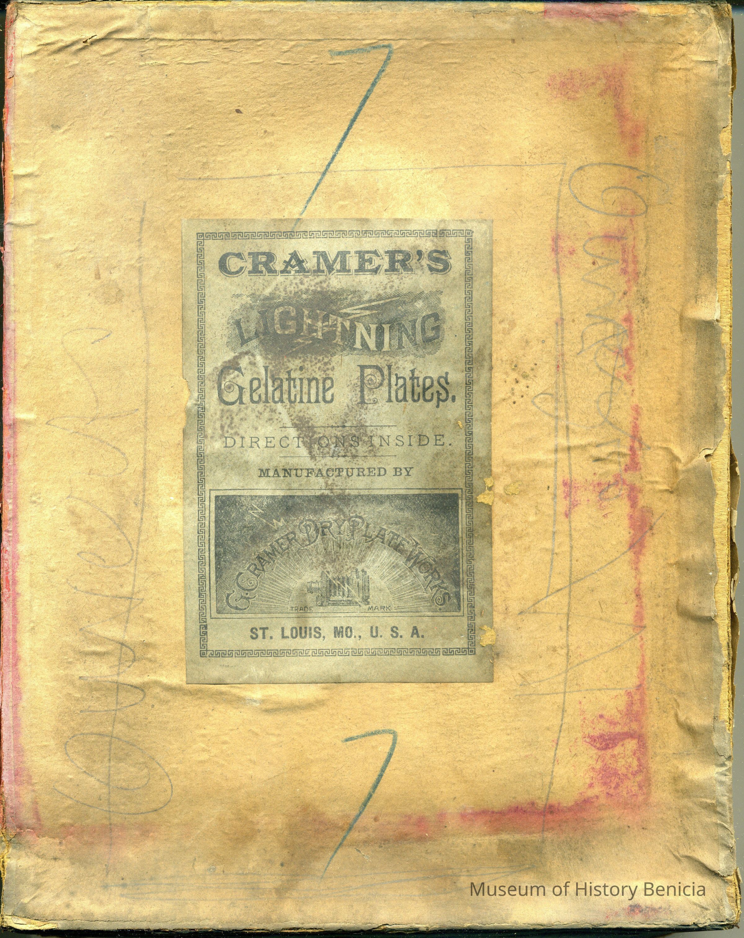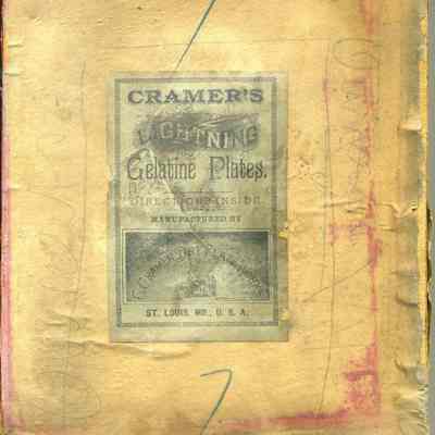 Cardboard box for holding glass plates used in photography. The box is 7 x 9" and held 12 6.5 x 8.5 Dry Plate glass negatives. The manufacturer is "Cramer's Lightning Gelatine Plates". There is some writting on the outside but I can't make it out. It may say "Owners". The box has "No 7" written on the outside. Inside are some yellow tissues used to separate the plates. They have some writting on them but it is too faded to read. There is also a yellow paper piece with a circle cut in it and "2 un" written on it. May have been used for printing the negative. I've seen this on some of the glass negatives.Collection