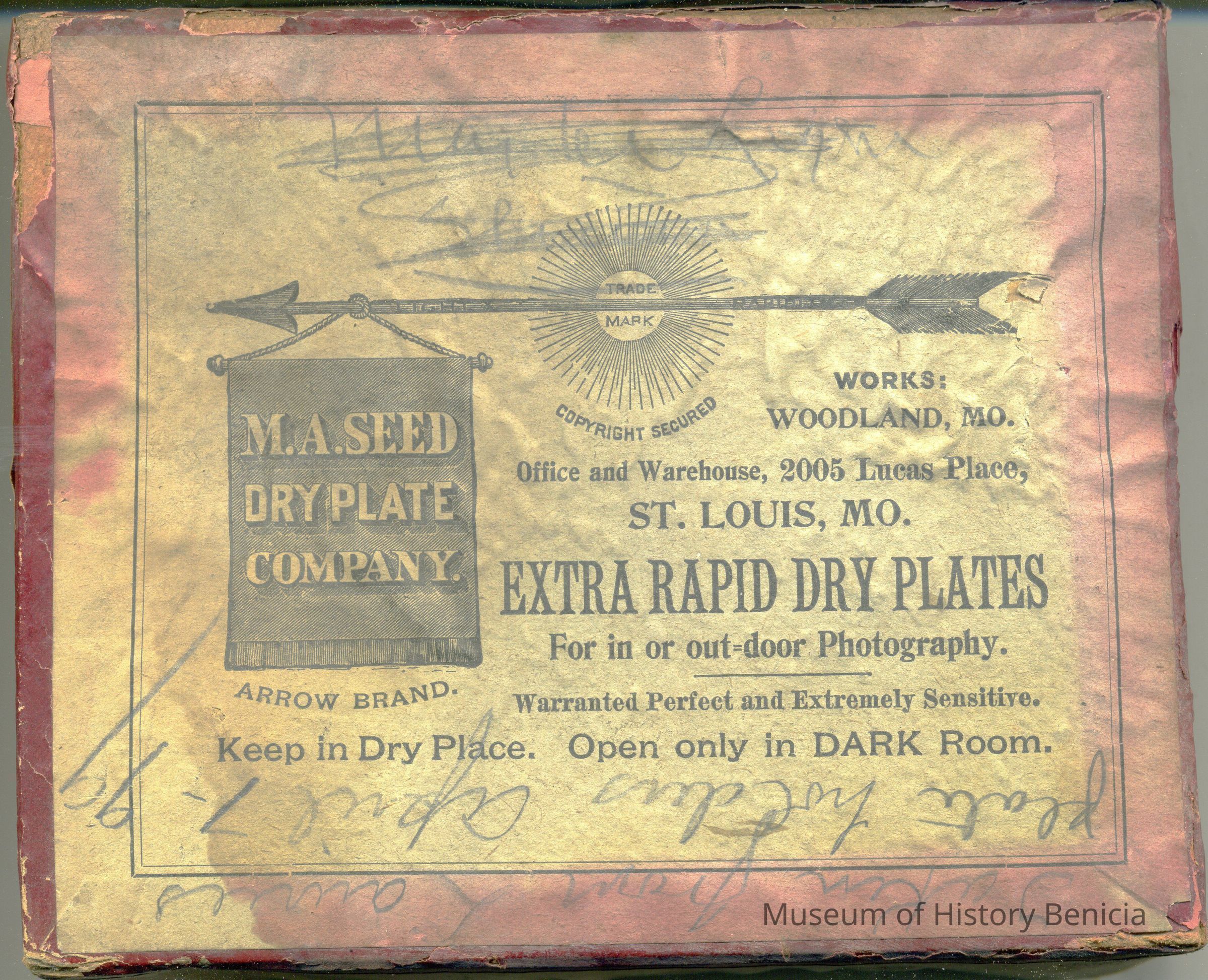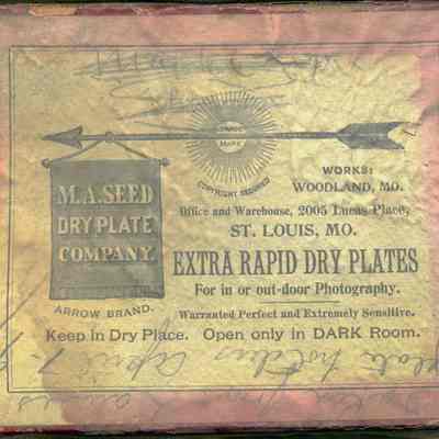 Cardboard box for holding glass plates used in photography. The box is 5.5 x 4.5" and held 12 4 x 5 Dry Plate glass negatives. The manufacturer was M.A. Seed Company of Woodland, Mo. There is no number written on the outside. Inside are two exposed but unused glass plate negatives.