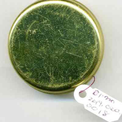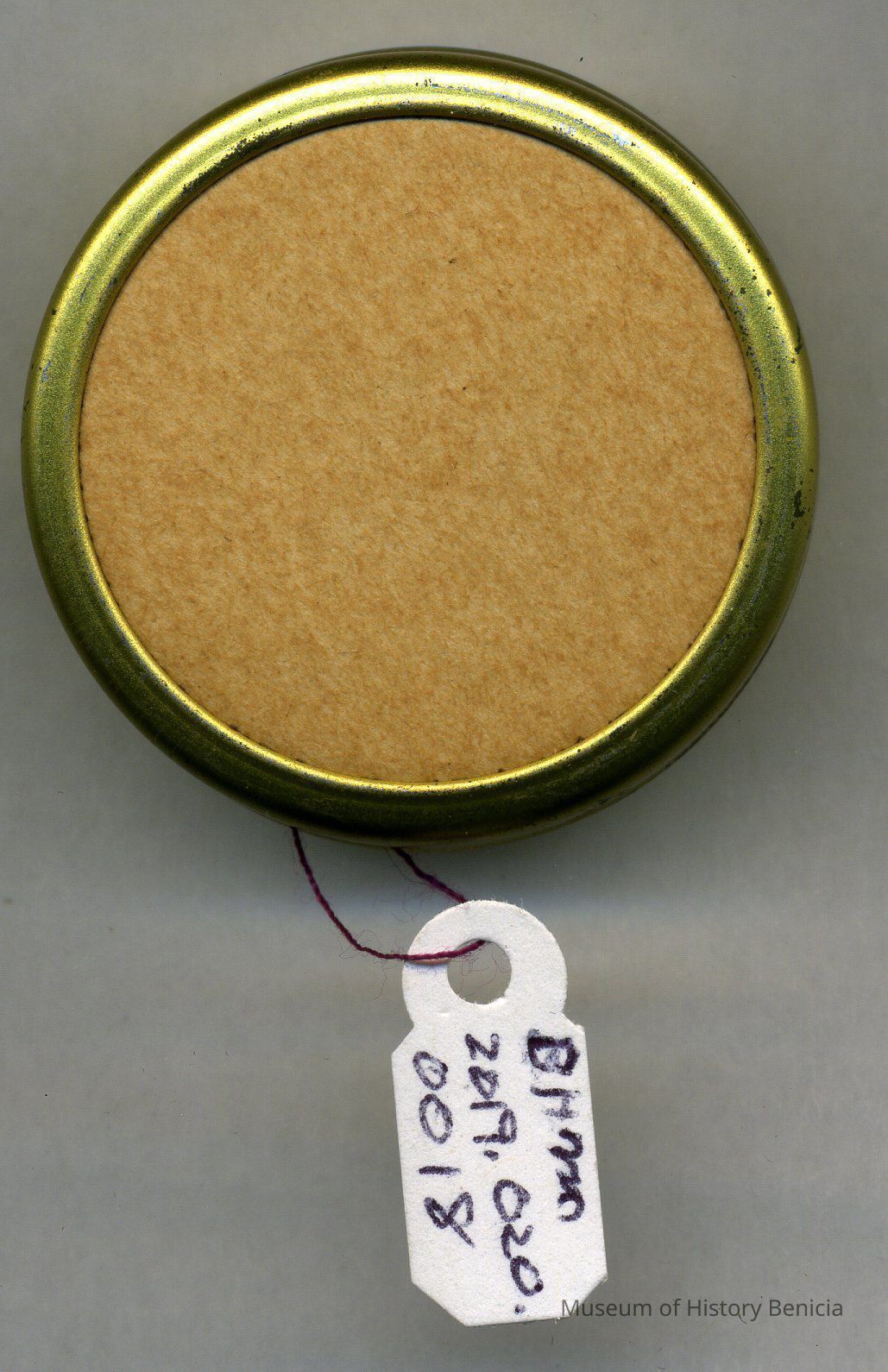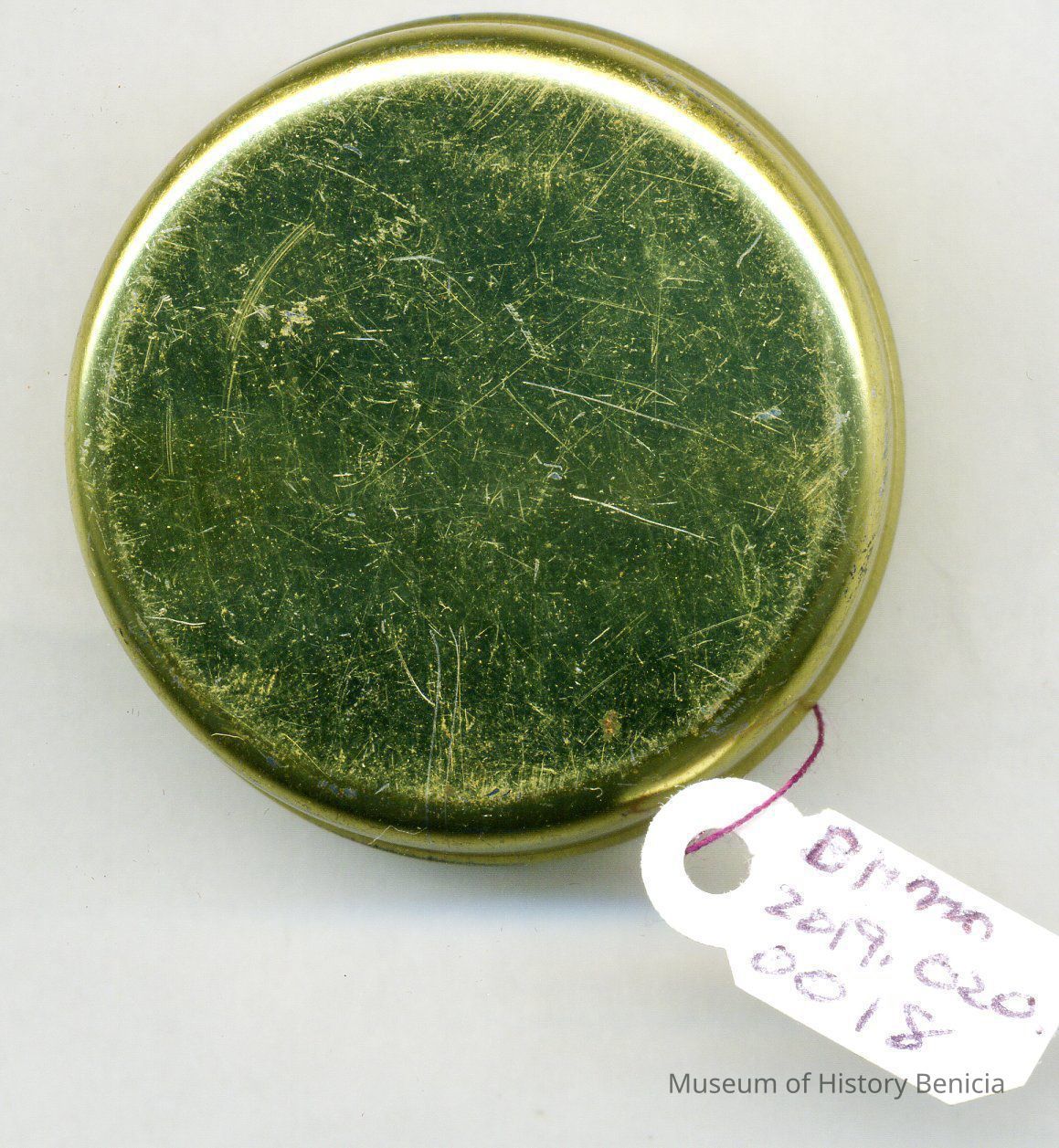 A small (1.5" dia.) gold colored metal (tin) box with a cardboard top.