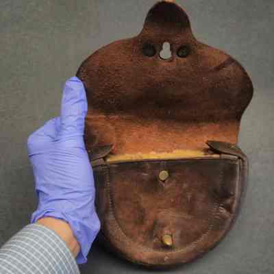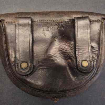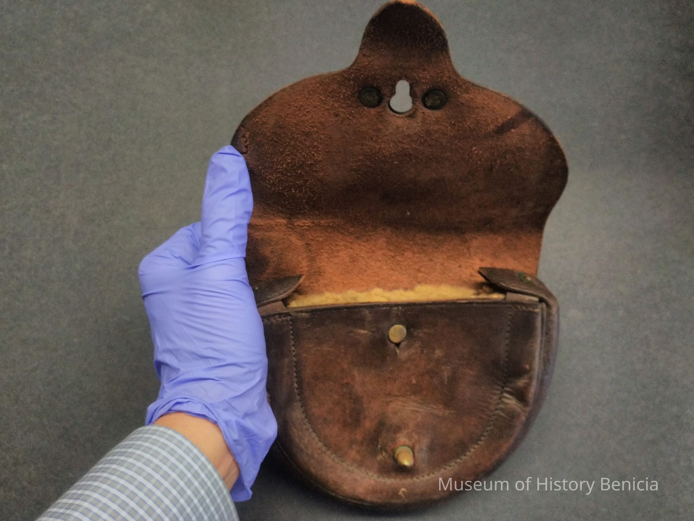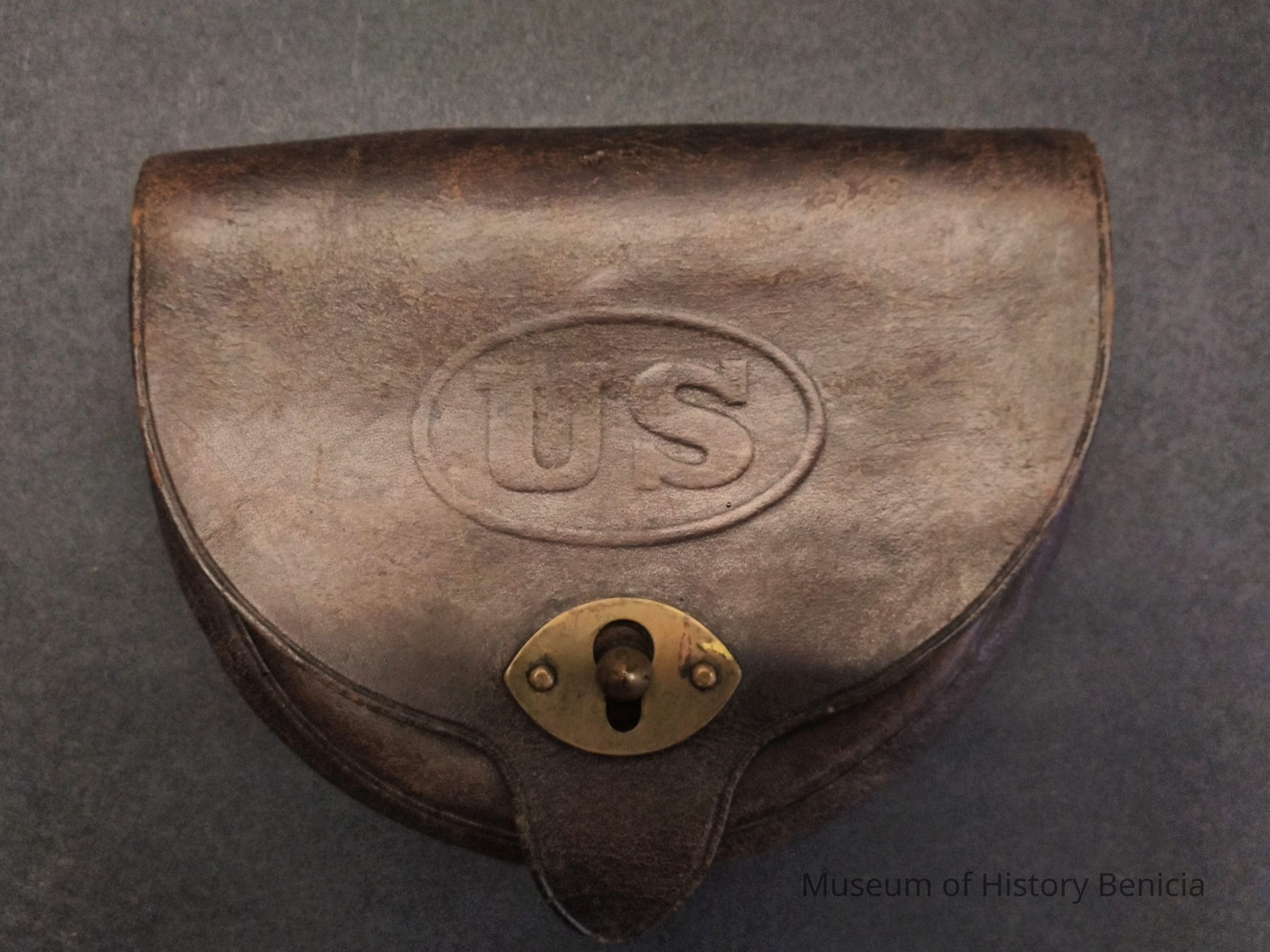 Model 1874 Dyer Cavalry Carbine Cartridge Box - Made of bridle leather, the front flap features a strong embossed “US” within an oval. There is a brass escutcheon on the closing tab. Made and marked “Benicia Arsenal” on the back. Two narrow belt loops are stitched and riveted on the back. These belt loops are stamped with inspector’s initials. The inner pouch has a pointy brass finial on the bottom to accept the closing tab of the outer flap and a flat brass “button” at the top to close an implement sleeve. This pattern is lined with a reddish wool fleece, to keep .45-70 cartridges from rattling about, and to keep them from developing verdigris, a common occurrence when cartridges were held in leather loops. The capacity was supposedly 40 rounds, but that was considerably more than was carried in these pouches.