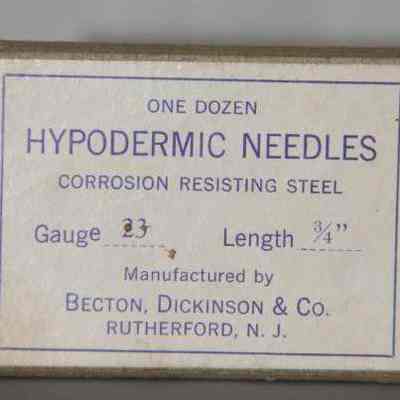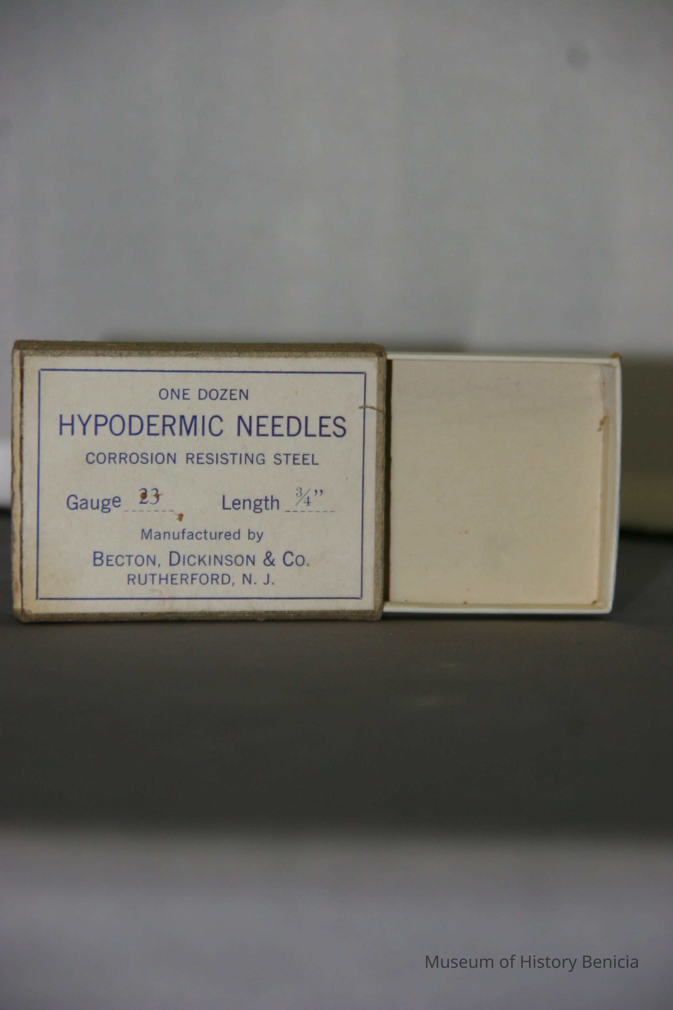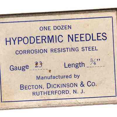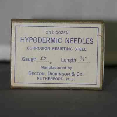 on top: "One Dozen Hypodermic Needles corrosion resisting steel Gauge 23 Length 3/4"