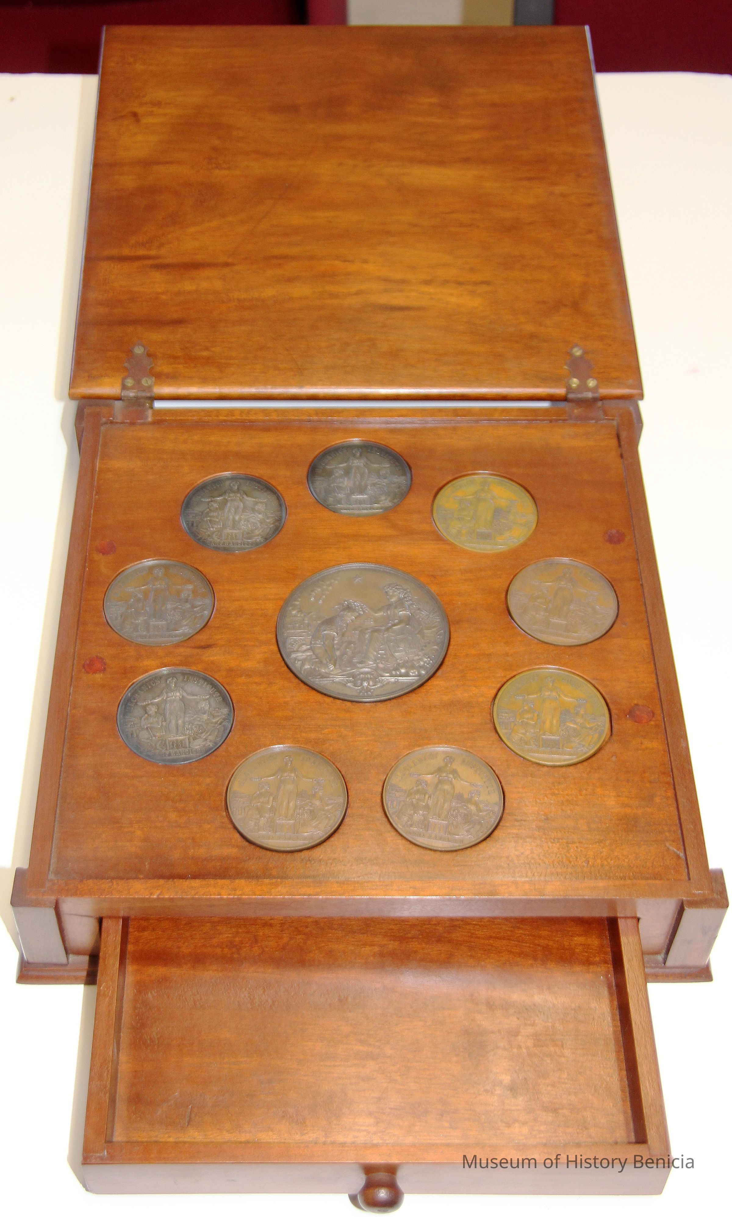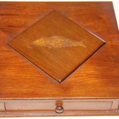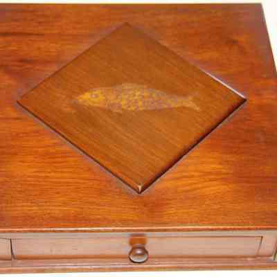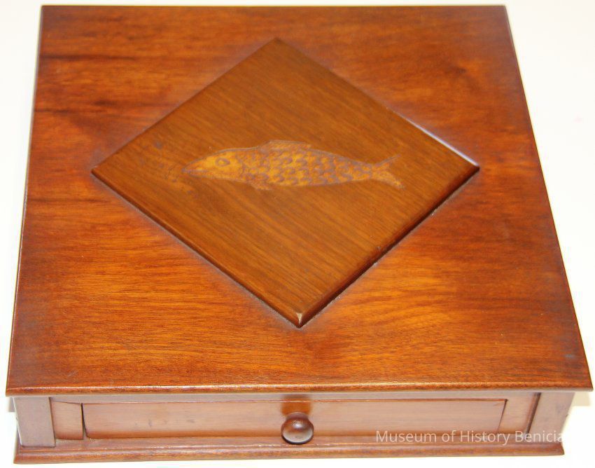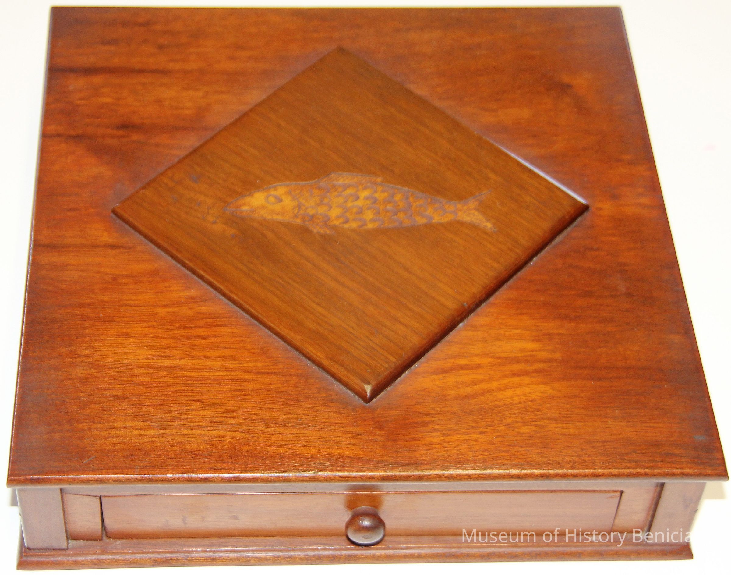 Box built by Laurence Fish to house Henrietta's medals from the Mechanics Institute. It is made of wood and has a fish carved on top. There are 10 circular spaces inside to house each of the medals that Henrietta won for various artistic accomplishments.